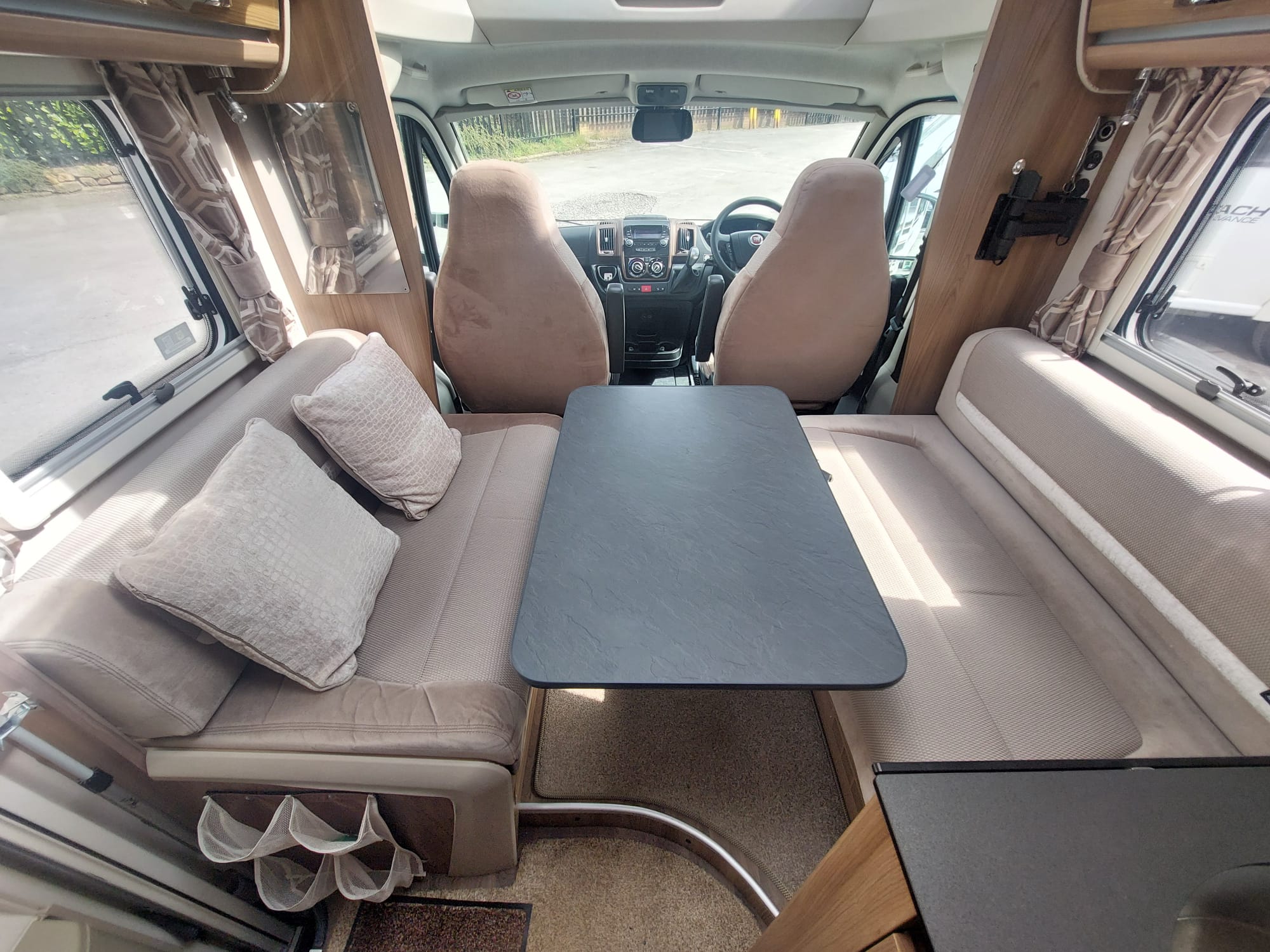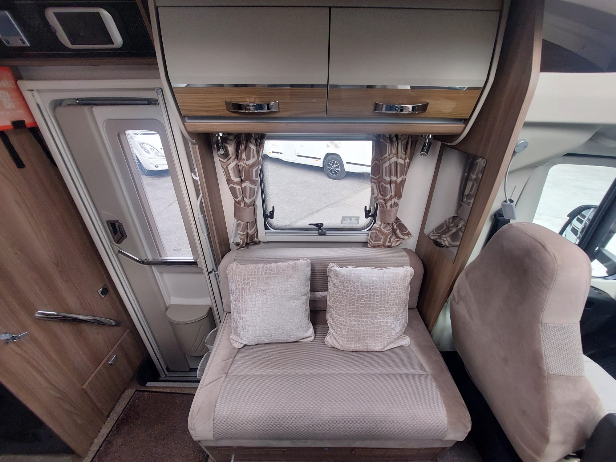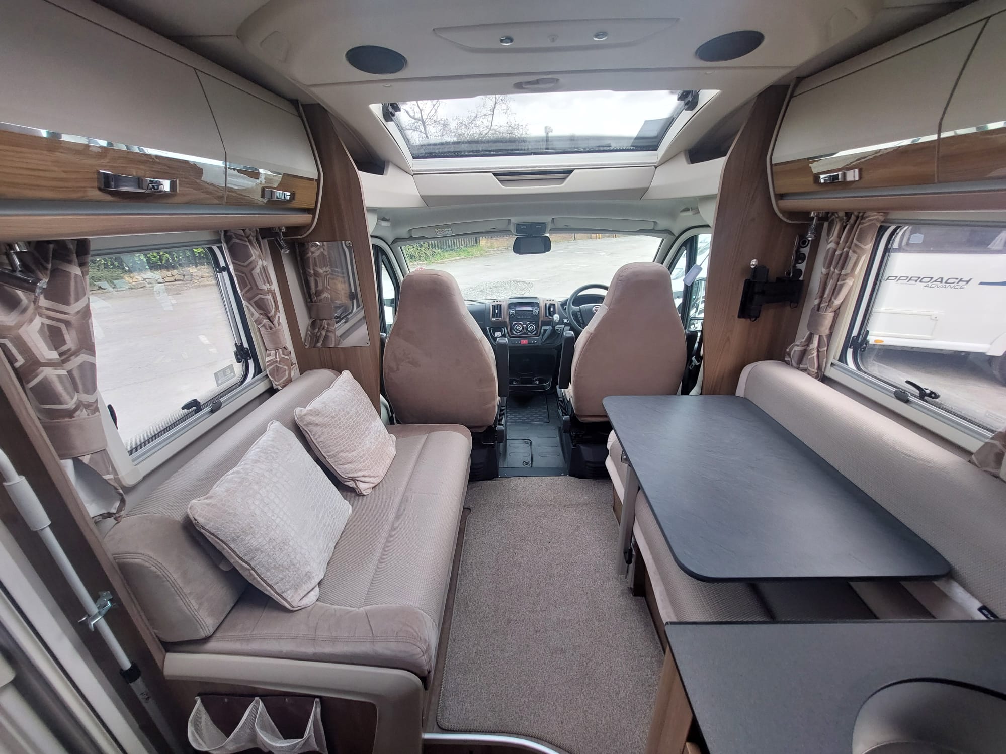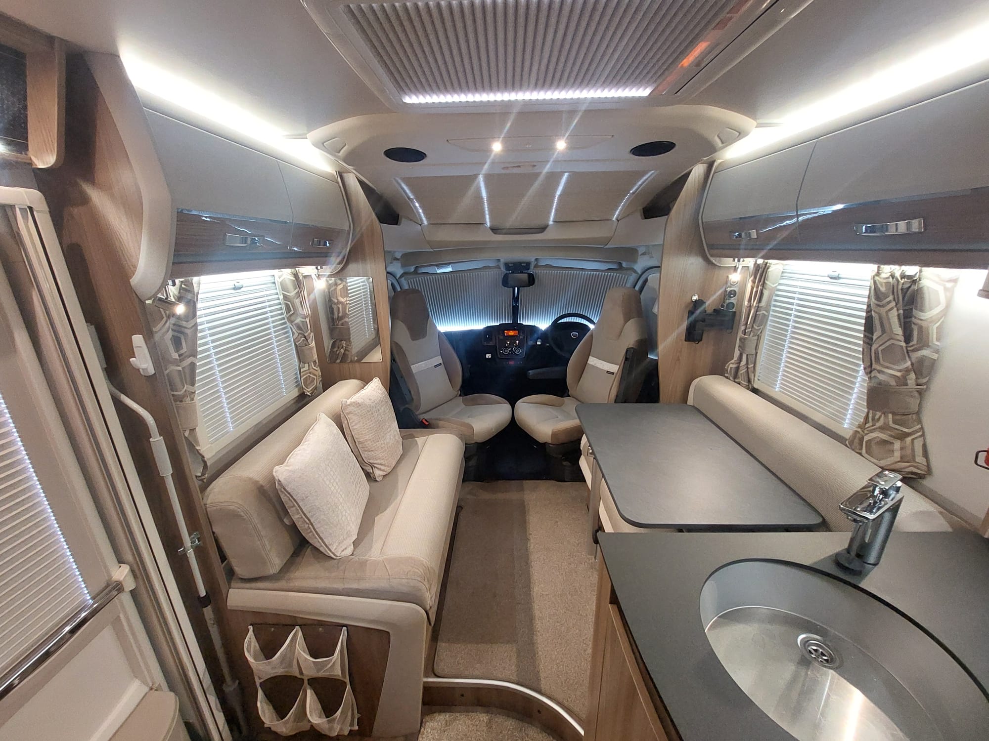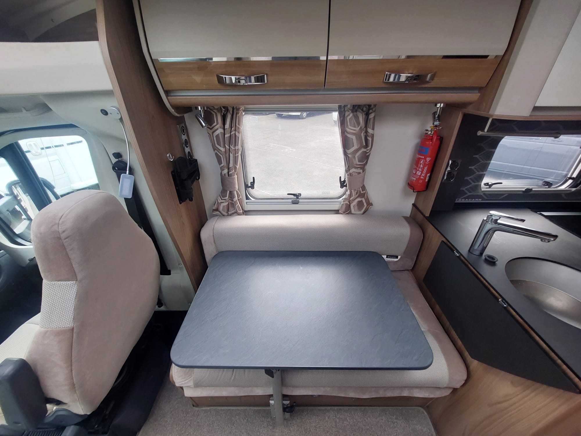 This Bessacarr 574L comes with plenty of features, Alde heating to keep the motorhome warm during winter months. Plenty of skylights feature throughout the motorhome to keep natural light in, along with the lighting throughout the habitation area, the front lounge can comfortably seat five with the driver and passenger seat turned around. The table, which can be extended, is spacious and a perfect size for mealtimes and socialising. At night, this can be converted easily into a double bed.