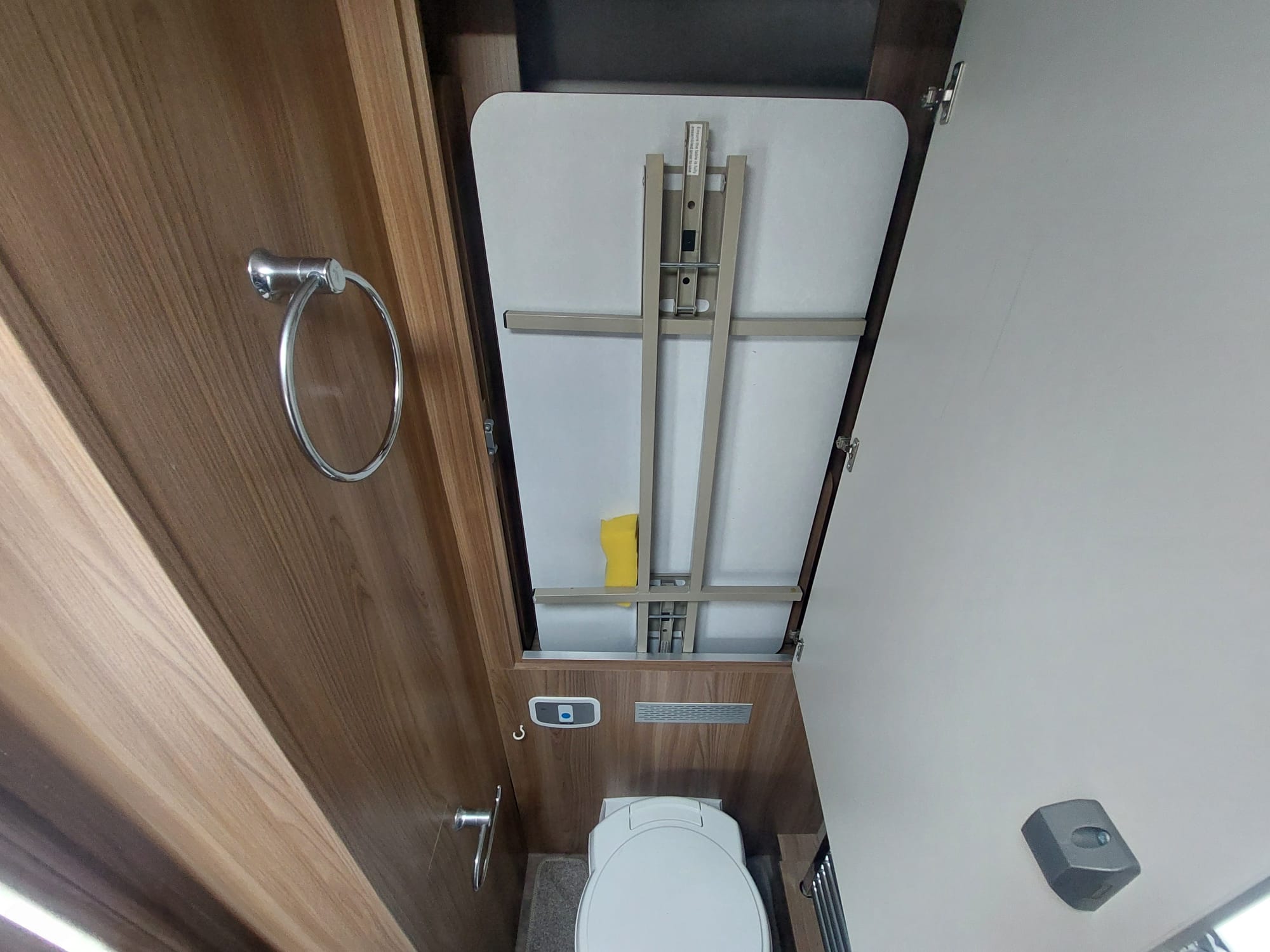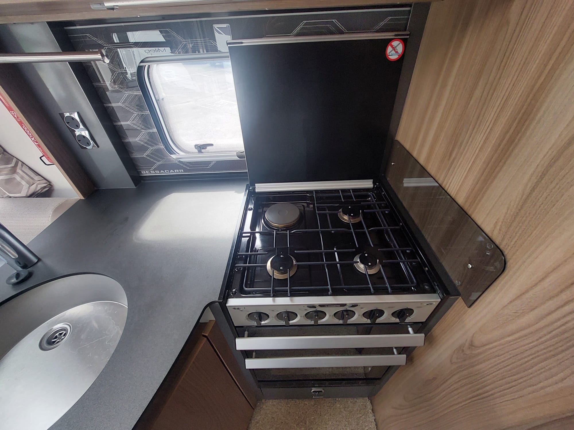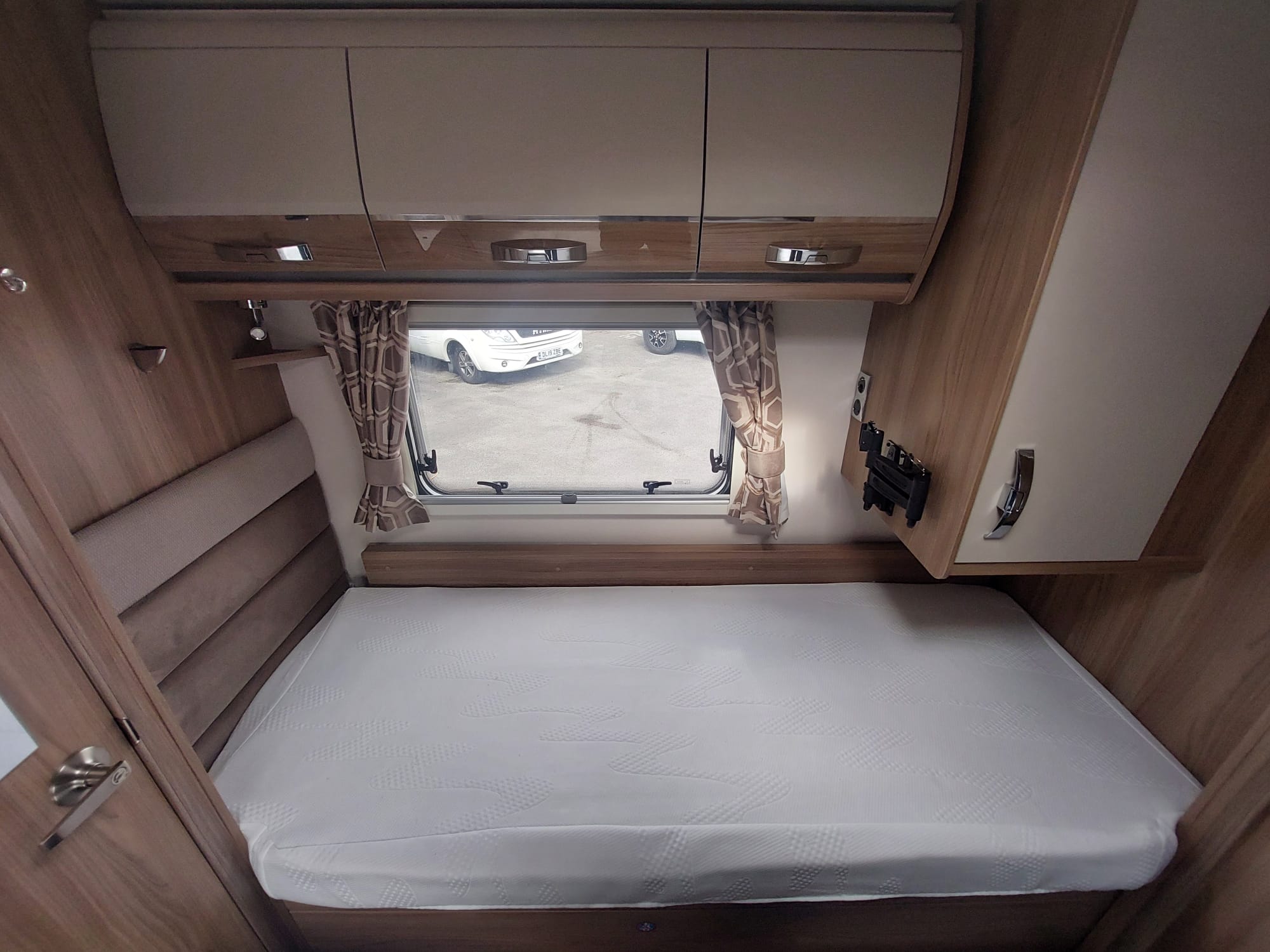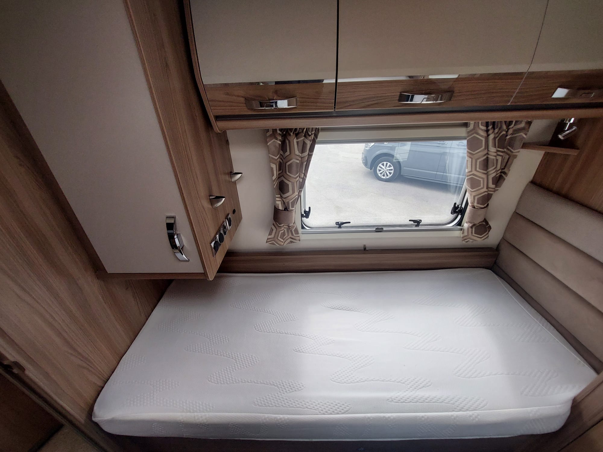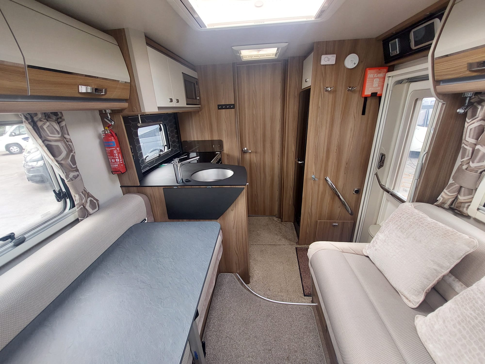 This Bessacarr 574L comes with plenty of features, Alde heating to keep the motorhome warm during winter months. Plenty of skylights feature throughout the motorhome to keep natural light in, along with the lighting throughout the habitation area, the front lounge can comfortably seat five with the driver and passenger seat turned around. The table, which can be extended, is spacious and a perfect size for mealtimes and socialising. At night, this can be converted easily into a double bed.