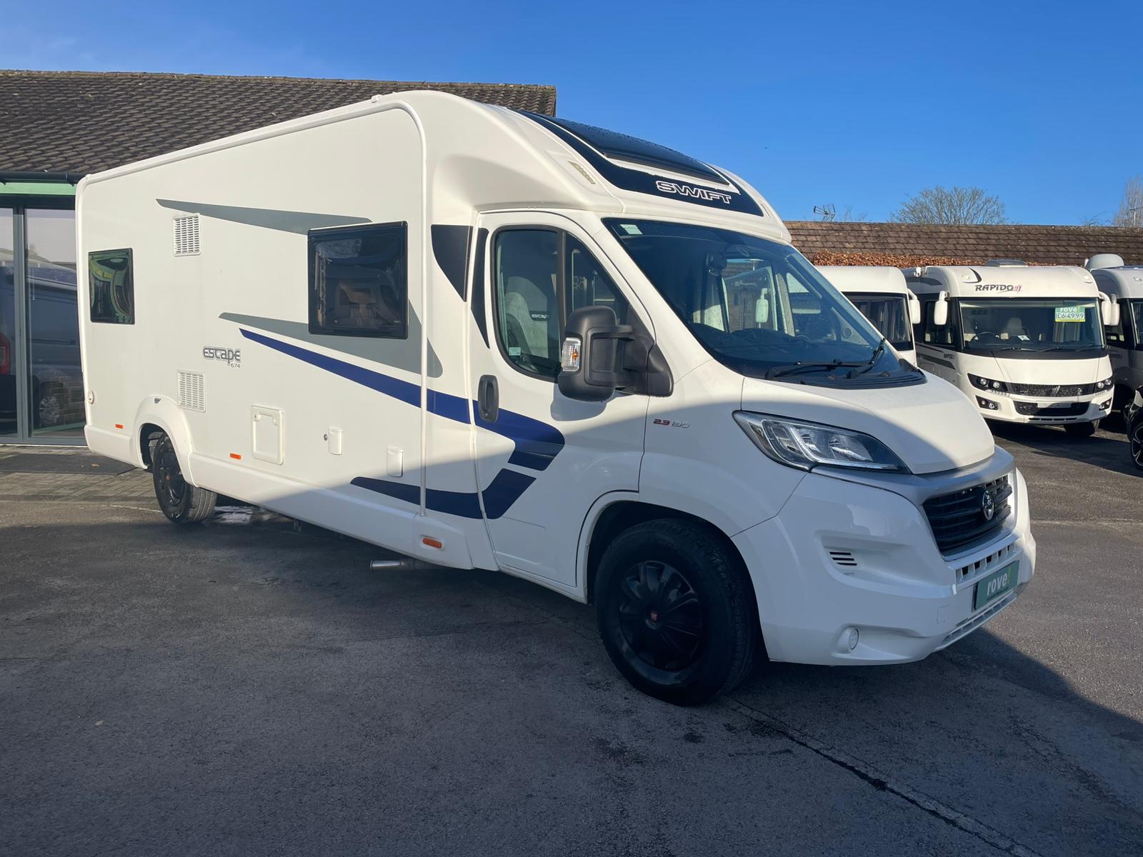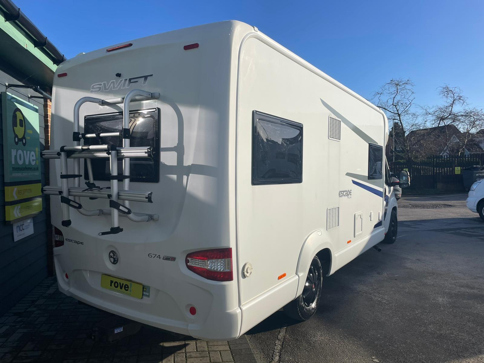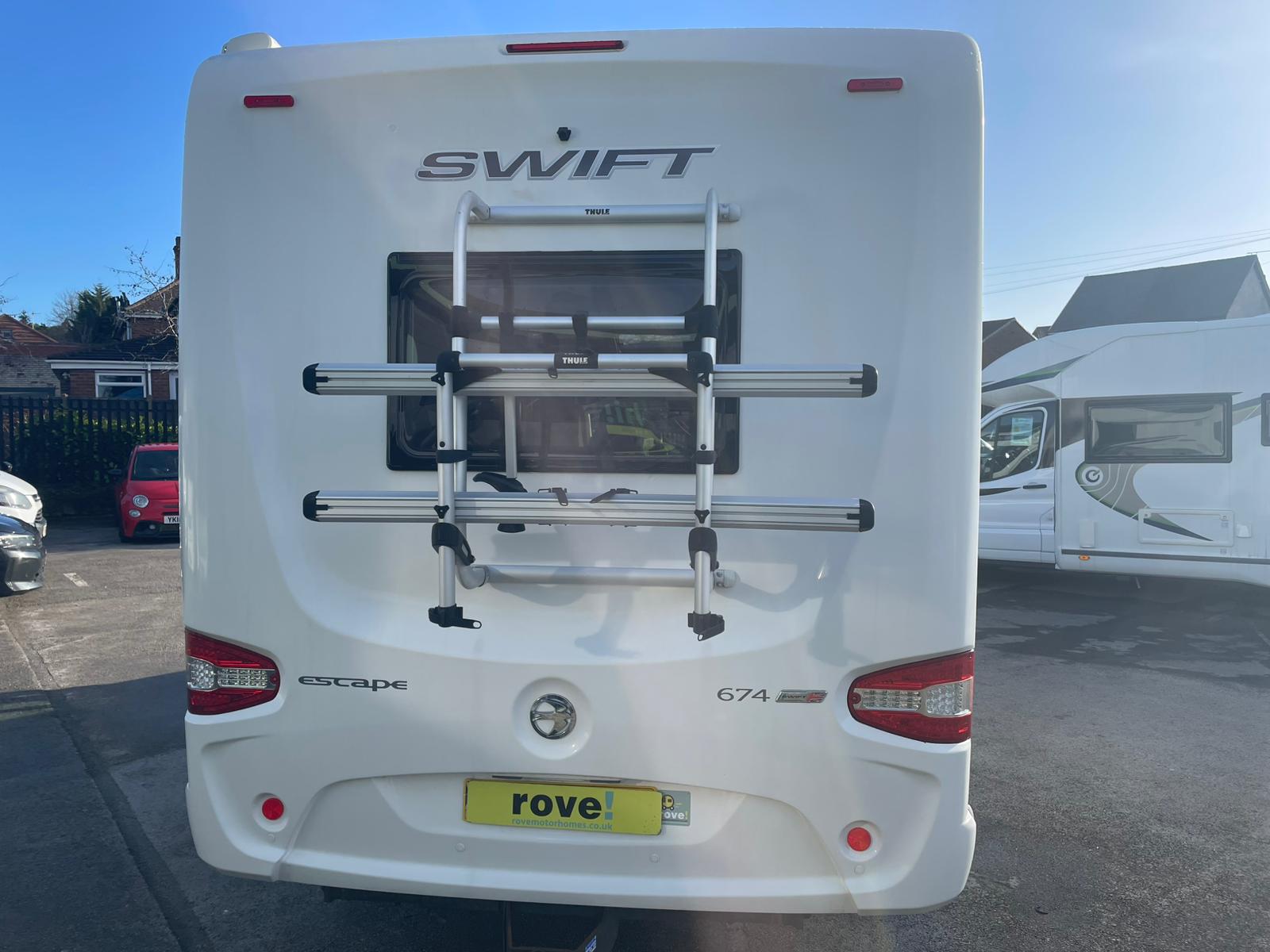 Rove Motorhomes Selston are pleased to offer this 2019 Swift Escape 674, this 4 berth and belt motorhome is based on the 2.3l Automatic Fiat gearbox and has covered 13422 miles. This compact yet spacious motorhome is just 7.4m and weighs 3500kg so can be driven on a standard car license. At the rear, the L-Shaped full appliance end kitchen comes into its own due to the huge work top area giving us maximum practicality. There is a 3-way Dometic fridge with freezer box, 3 gas burner hob, oven/grill, and good all-round storage above. With its versatile layout, six-berth capacity, and well-equipped living spaces, the Swift Escape 674 is the perfect motorhome for families and couples alike, whether you’re setting out for a weekend away or a grand European tour, The cab area features air conditioning, cruise control, and swivelling captain’s chairs that integrate perfectly with the living space once parked up,