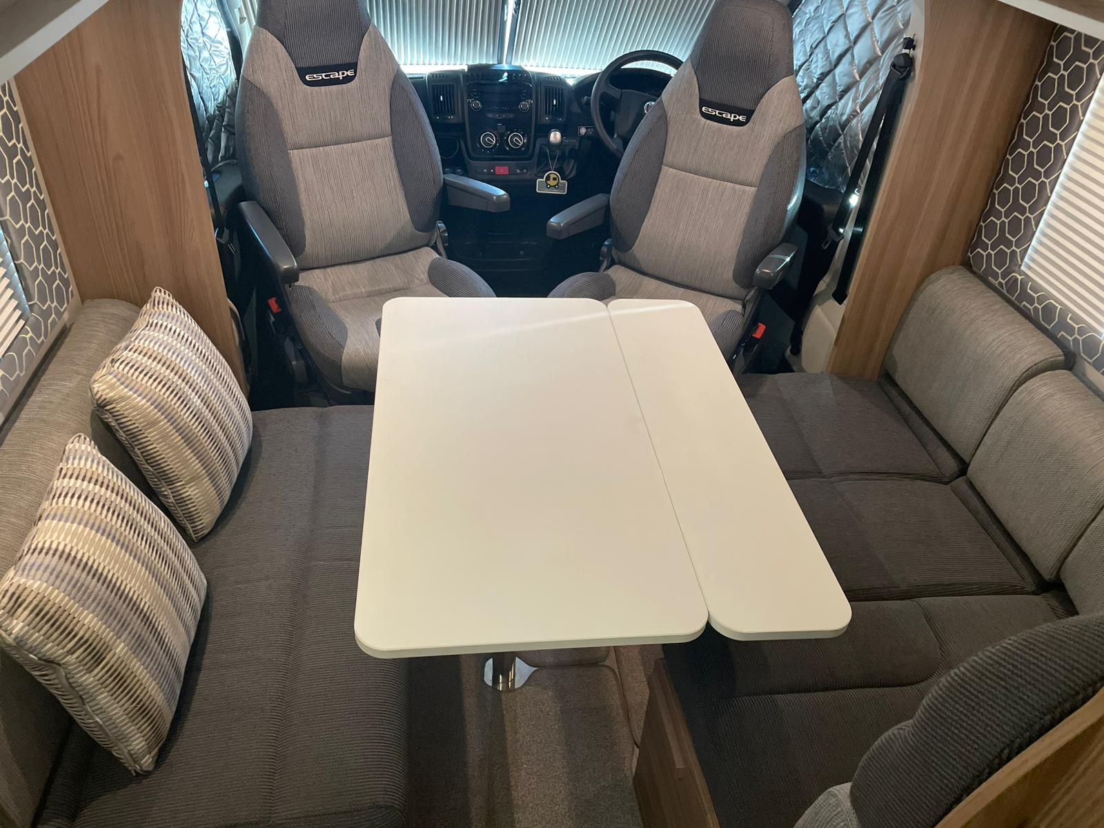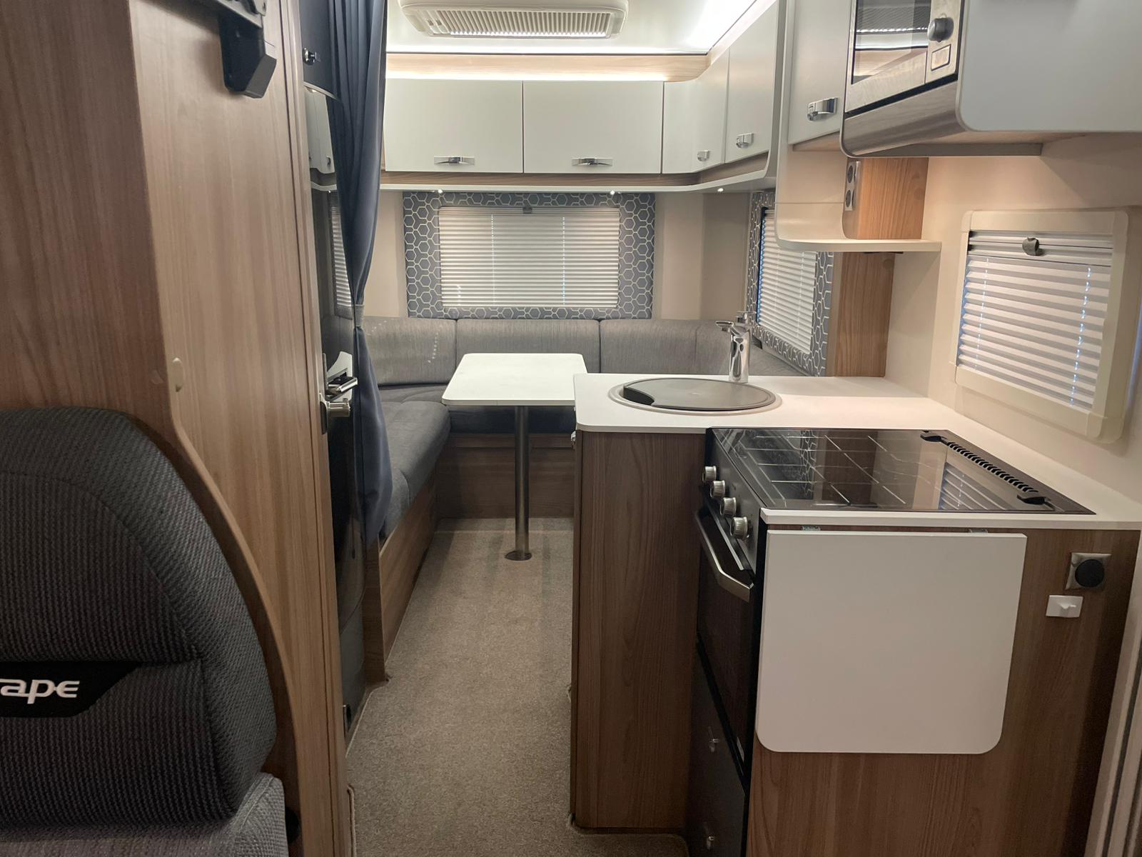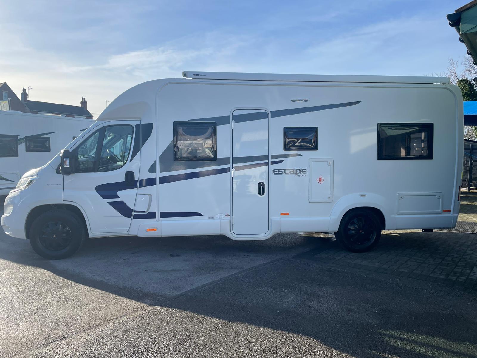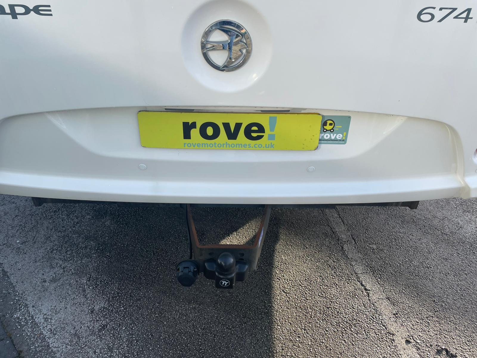 Rove Motorhomes Selston are pleased to offer this 2019 Swift Escape 674, this 4 berth and belt motorhome is based on the 2.3l Automatic Fiat gearbox and has covered 13422 miles. This compact yet spacious motorhome is just 7.4m and weighs 3500kg so can be driven on a standard car license. At the rear, the L-Shaped full appliance end kitchen comes into its own due to the huge work top area giving us maximum practicality. There is a 3-way Dometic fridge with freezer box, 3 gas burner hob, oven/grill, and good all-round storage above. With its versatile layout, six-berth capacity, and well-equipped living spaces, the Swift Escape 674 is the perfect motorhome for families and couples alike, whether you’re setting out for a weekend away or a grand European tour, The cab area features air conditioning, cruise control, and swivelling captain’s chairs that integrate perfectly with the living space once parked up,