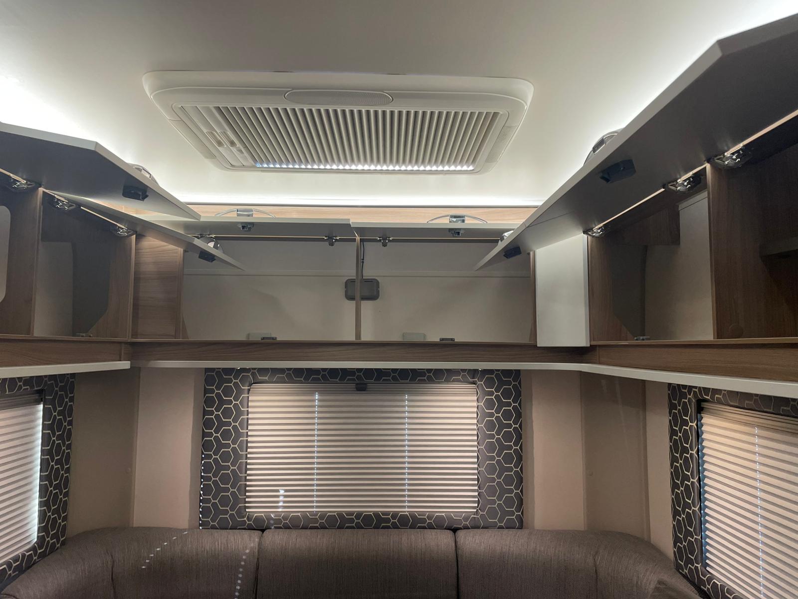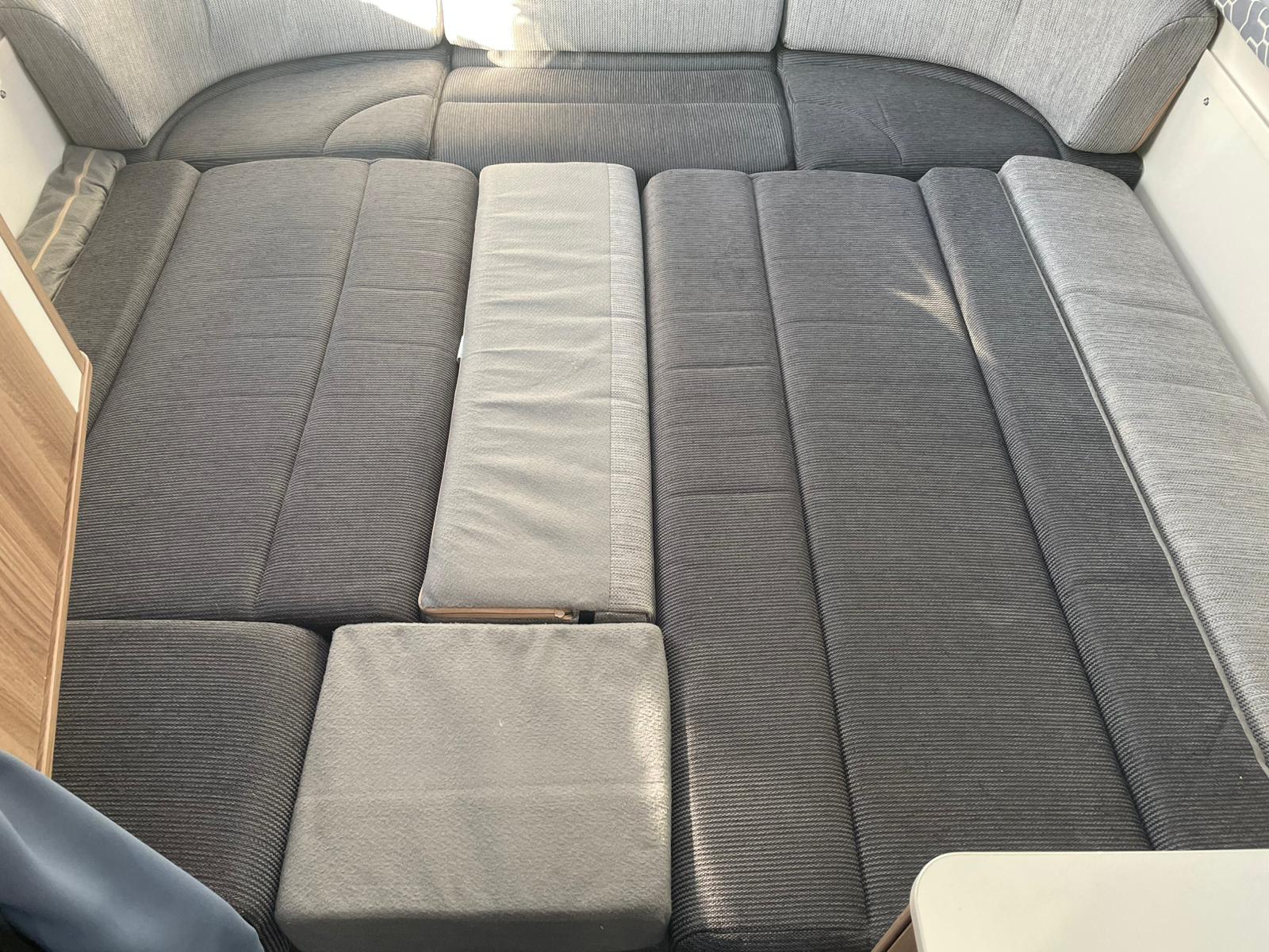 Starting at the rear, the 674 offers a sought-after rear lounge layout, perfect for relaxing in privacy or entertaining guests. These settees can easily be transformed into a large, comfortable double, giving you maximum flexibility for sleeping arrangements. Large windows and overhead storage make this area feel airy and practical, while a central rooflight adds plenty of natural light during the day. The surrounding windows are perfectly position so you can sit back and take in all the brilliant views from the comfort of your lounge.
