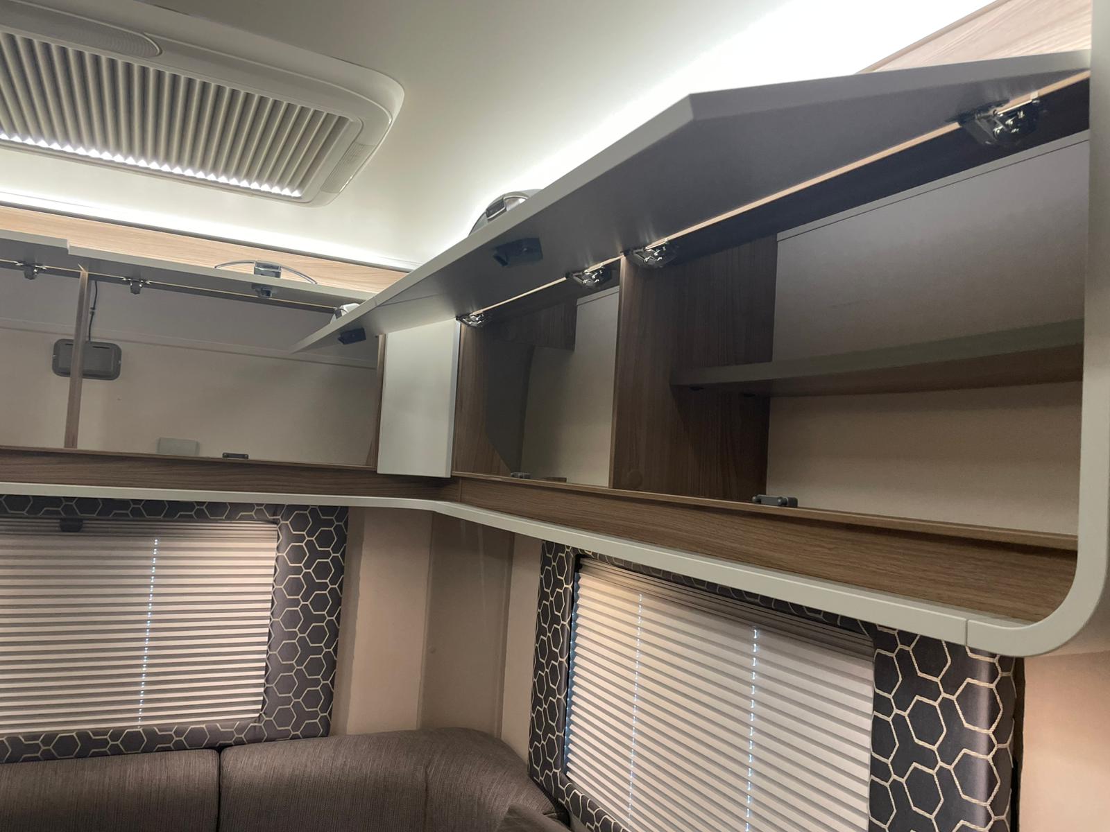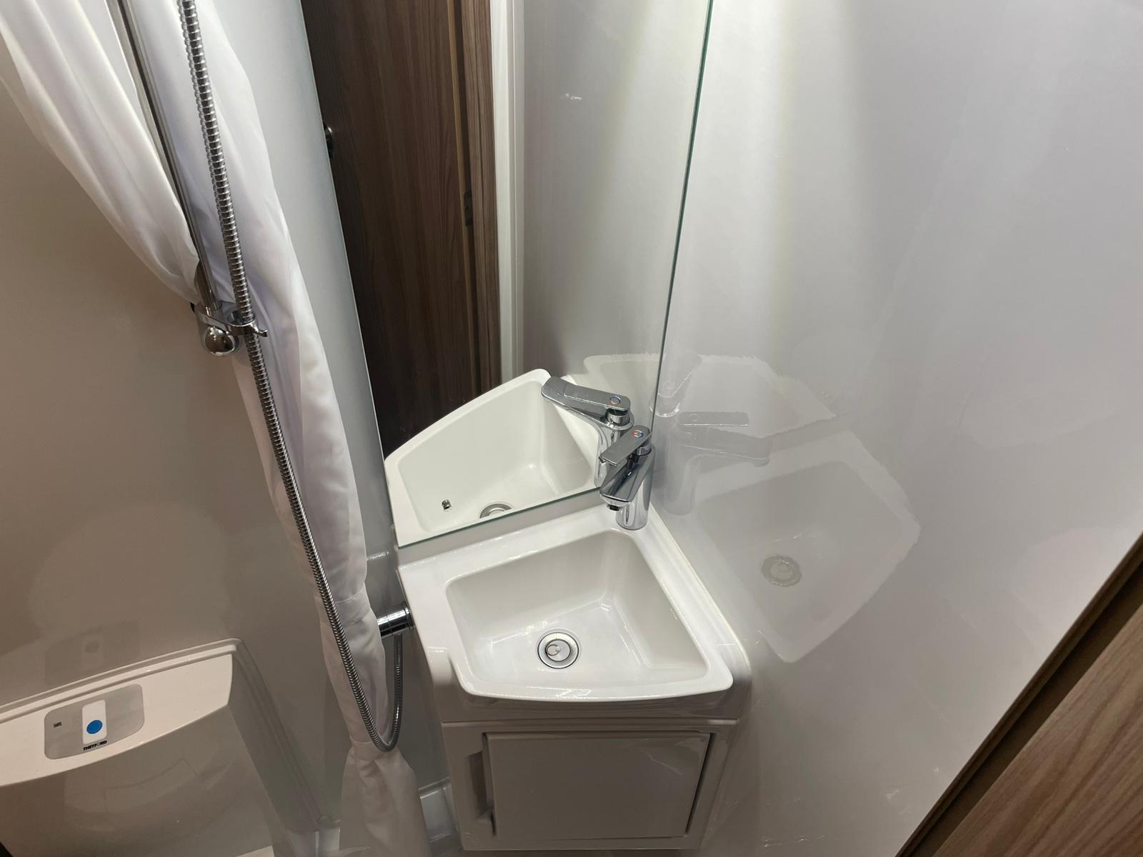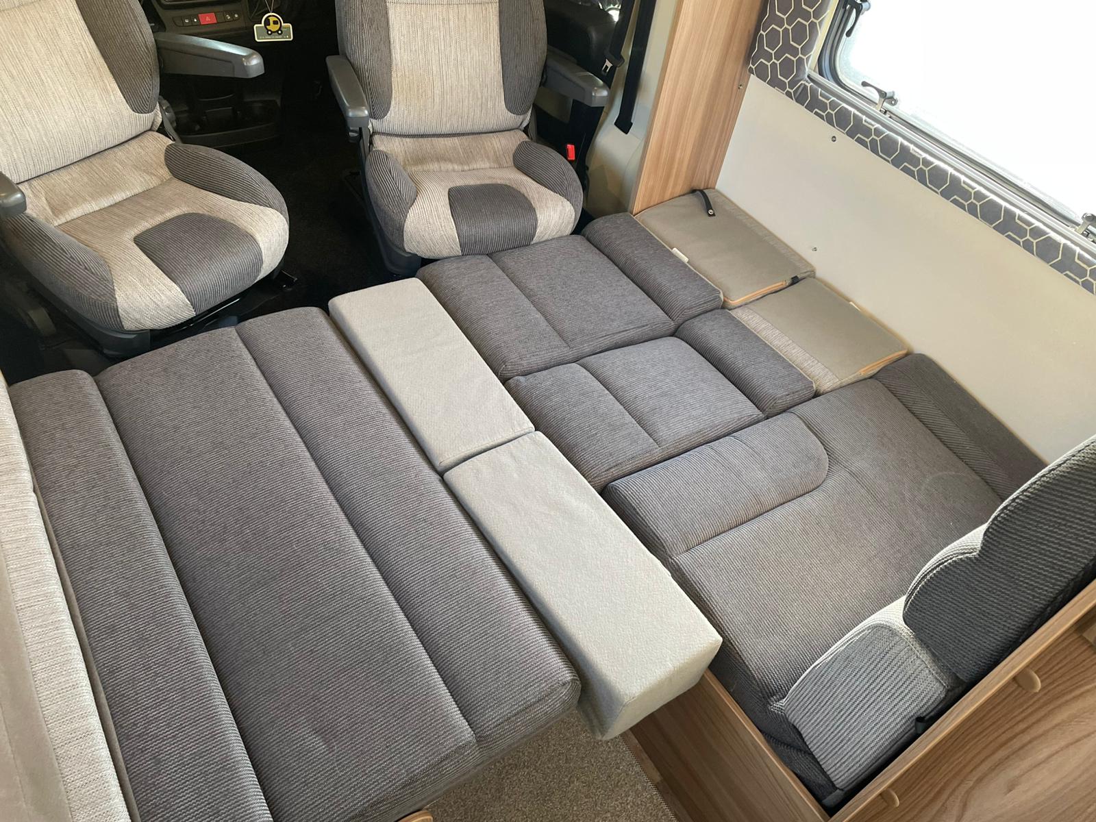 Toward the front, the motorhome features a second lounge/dinette area with 5 belted travel seats, allowing for safe and comfortable journeys whilst still offering a lounge that can seat up to six people. This area also converts into another 2 berth, adding to the vehicle’s family-friendly credentials. Above the lounge is a drop-down double bed, easy to deploy and stow away, providing a comfortable and convenient sleeping option without compromising on floor space.