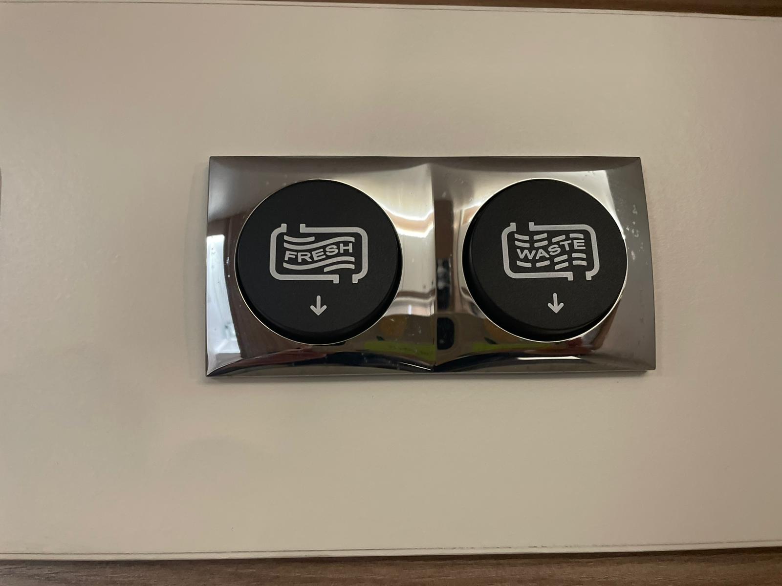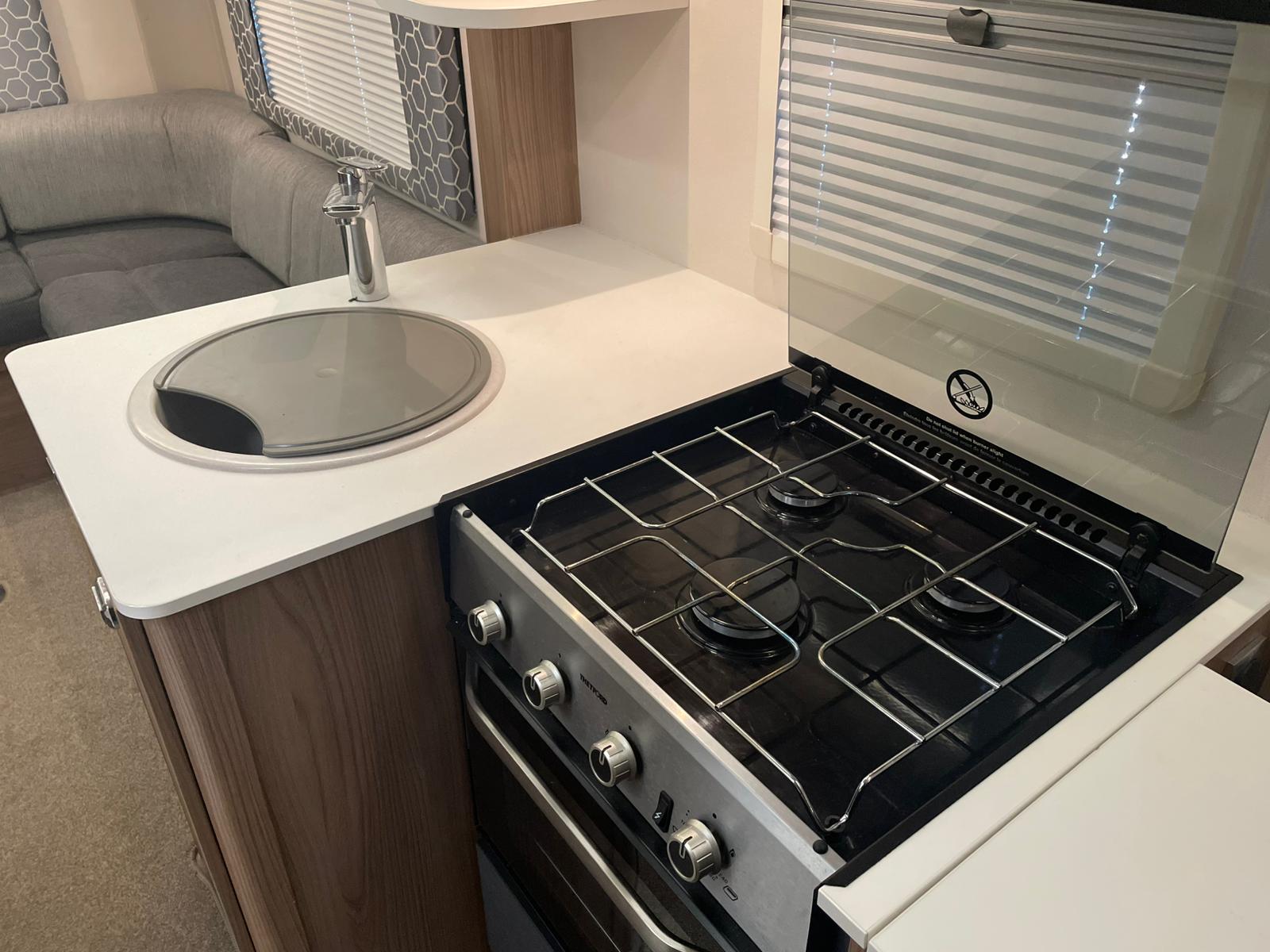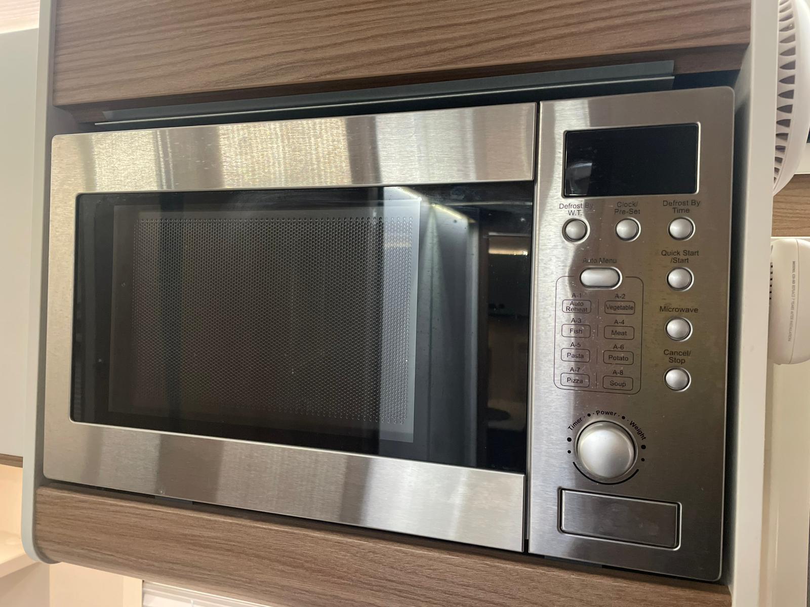 Moving forward, you’ll find the well-appointed washroom, compact yet cleverly designed with a toilet, washbasin and shower. Adjacent to this is the central kitchen, equipped with an oven, grill, a three-burner gas hob, a microwave, and a large fridge with freezer compartment. There’s ample worktop space and storage, making it easy to prepare meals just as you would at home.
