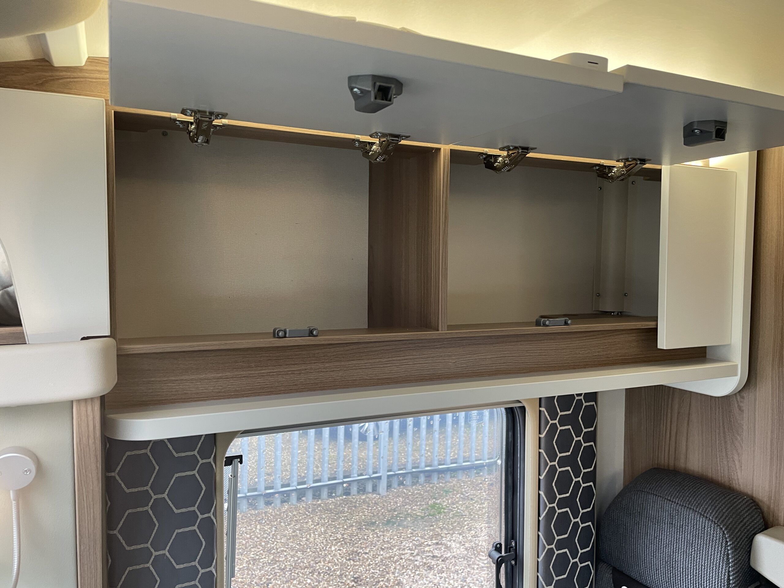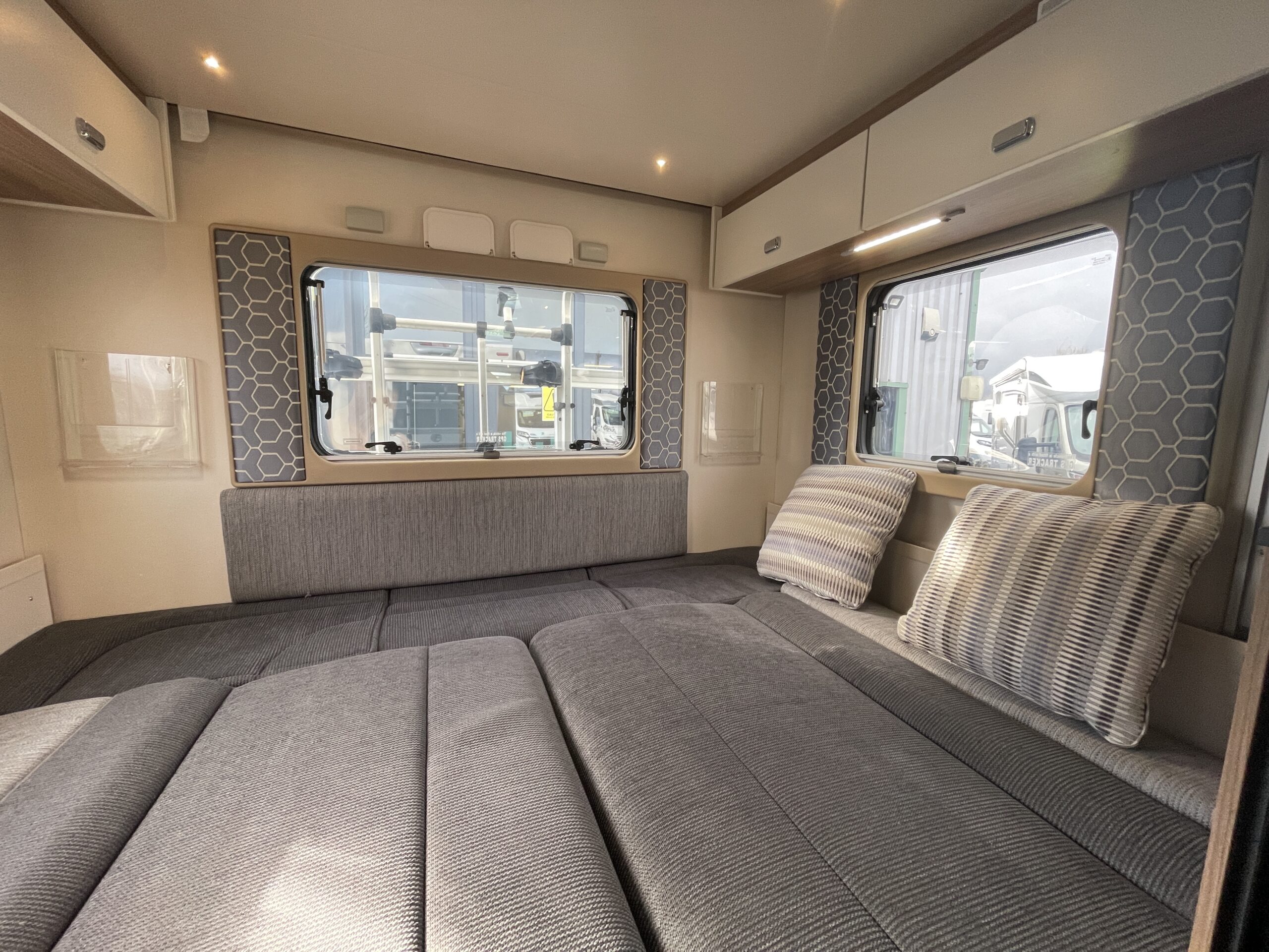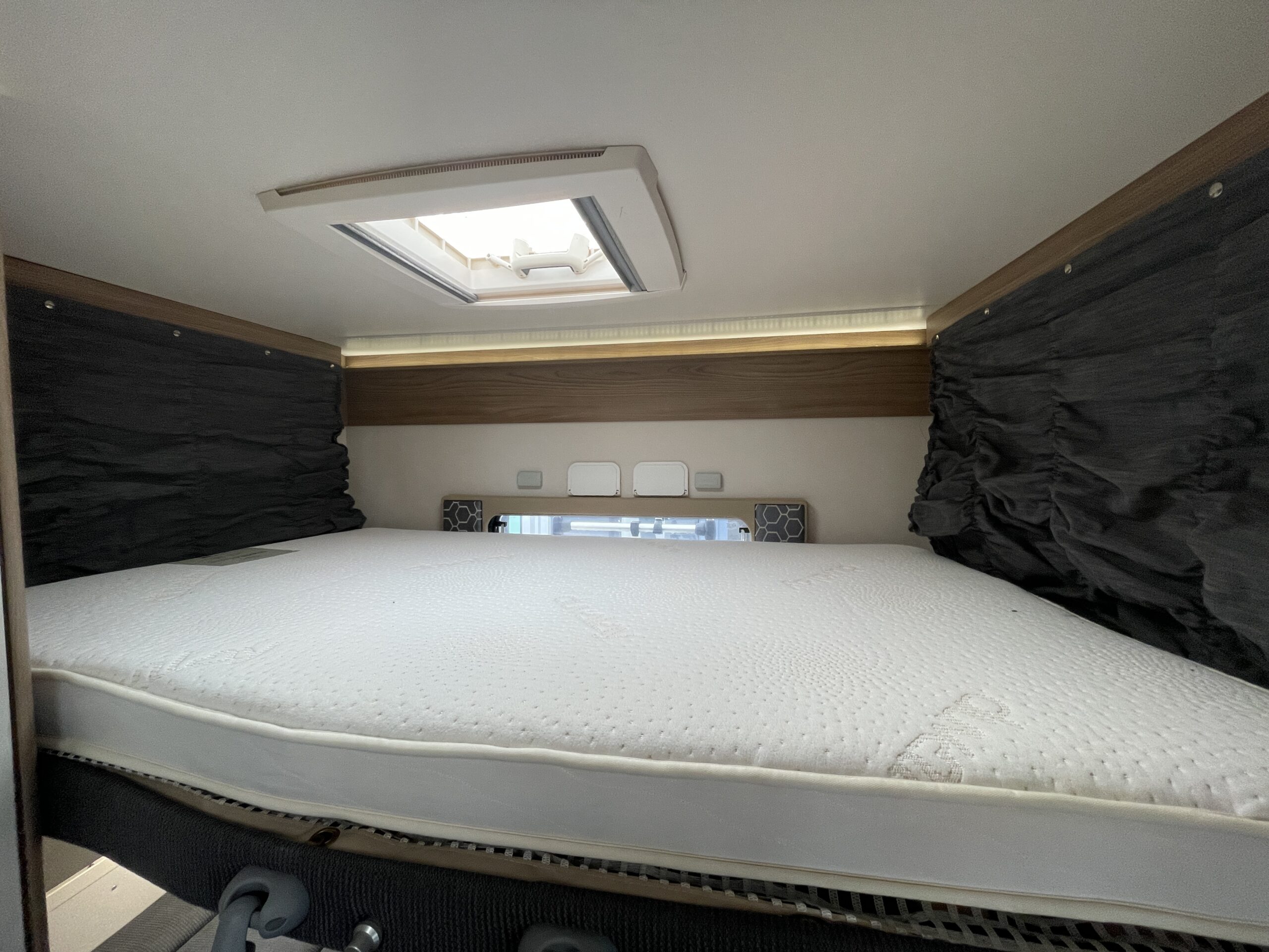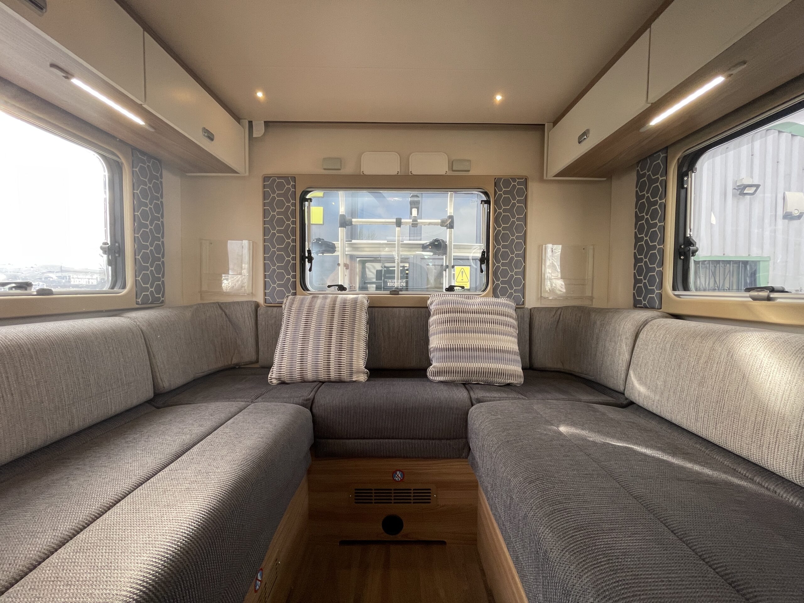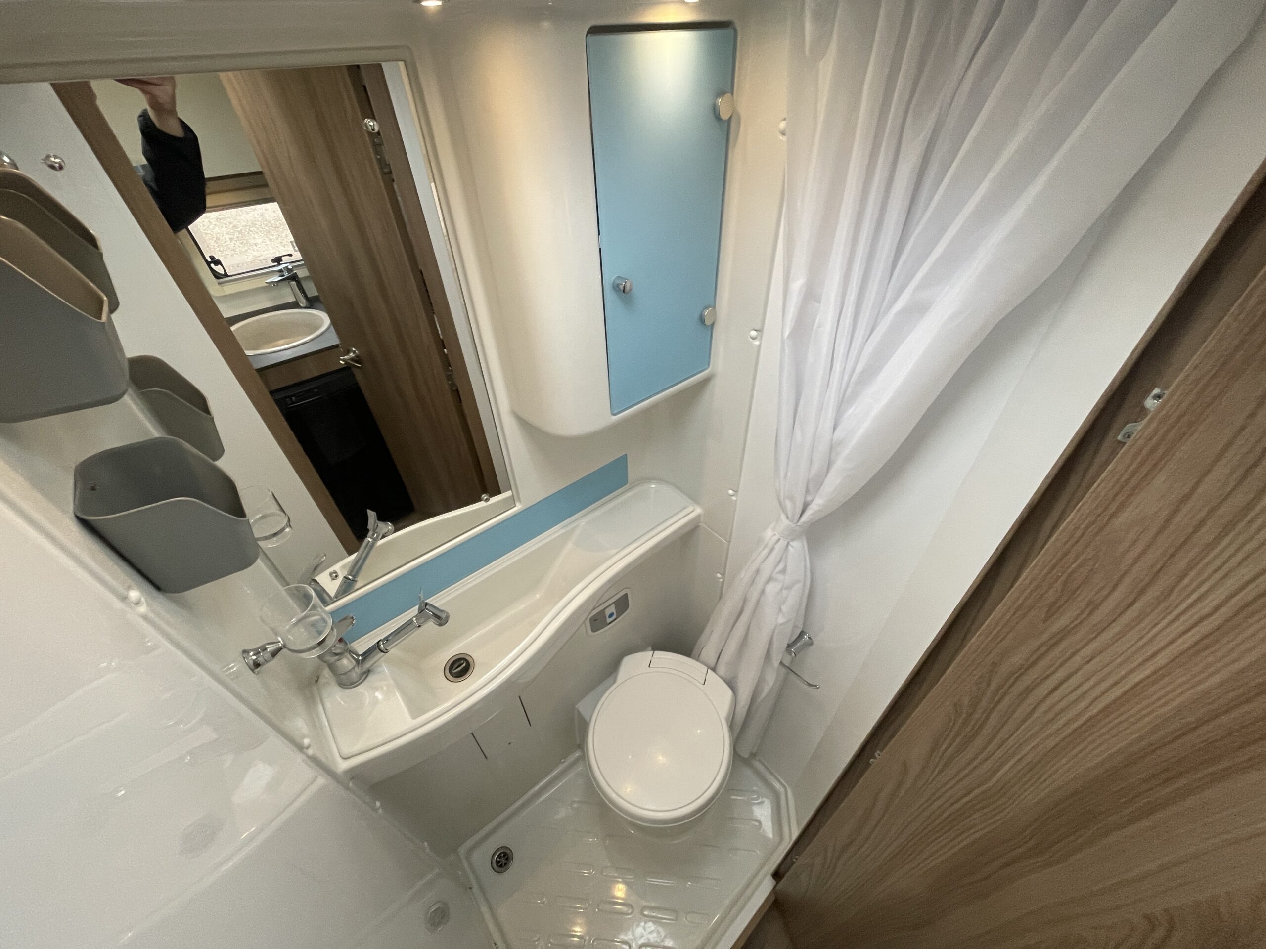 Moving forward, you’ll find the central washroom, cleverly designed to maximise space and functionality. This area includes a shower, cassette toilet, washbasin with vanity unit and useful storage for toiletries. The washroom I positioned perfectly so access throughout the evening hours is minimal.