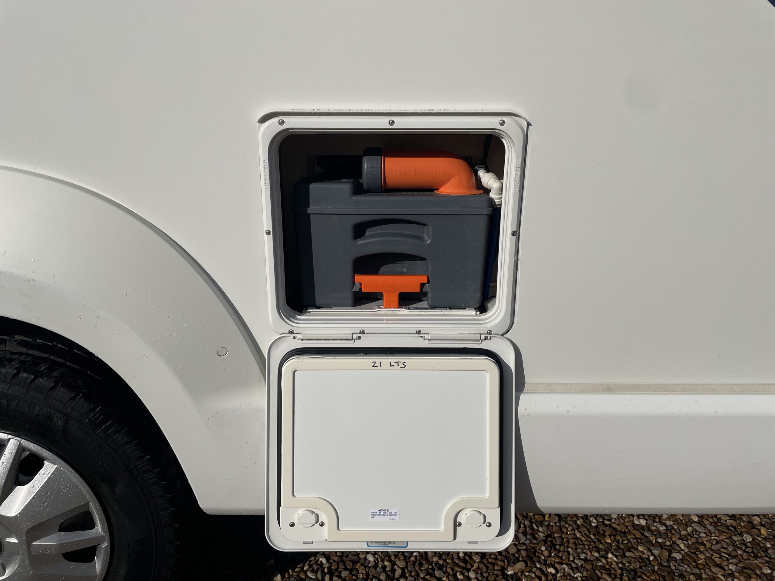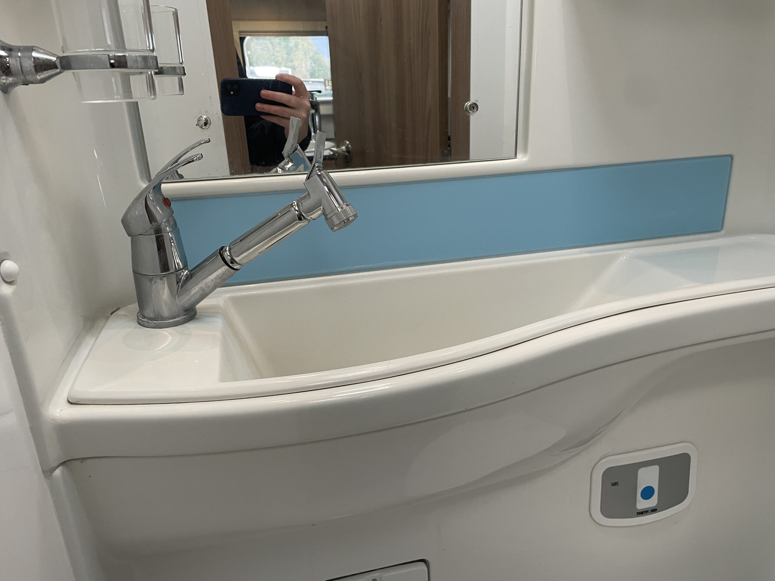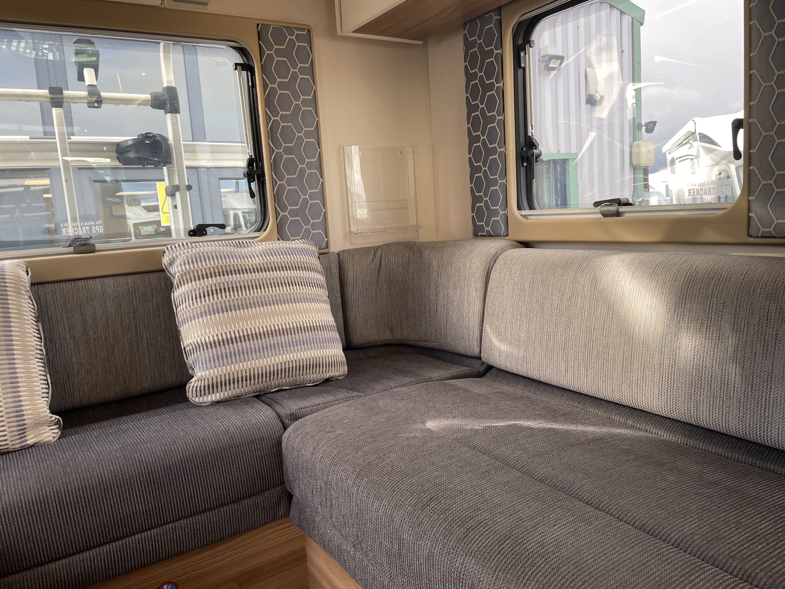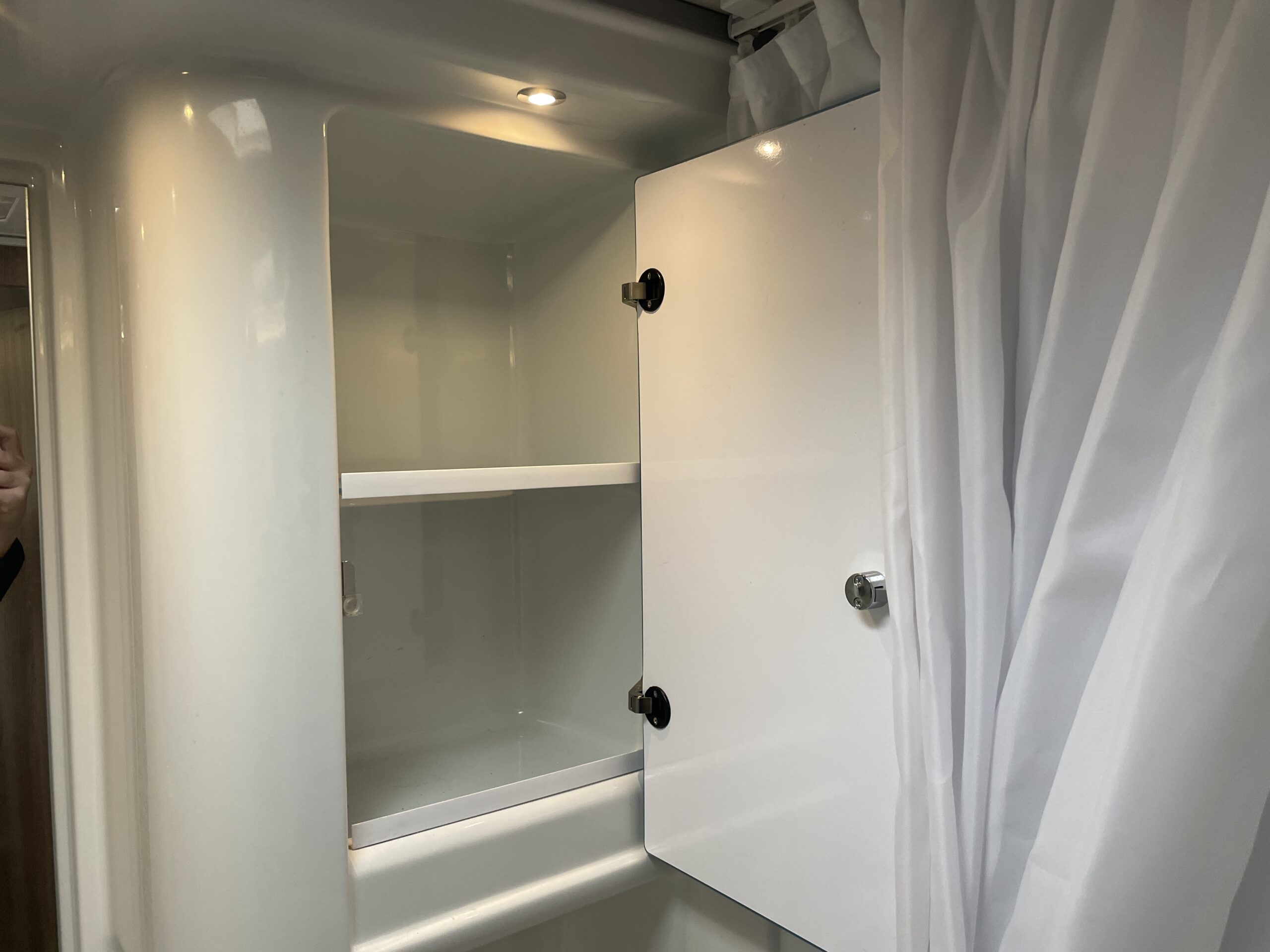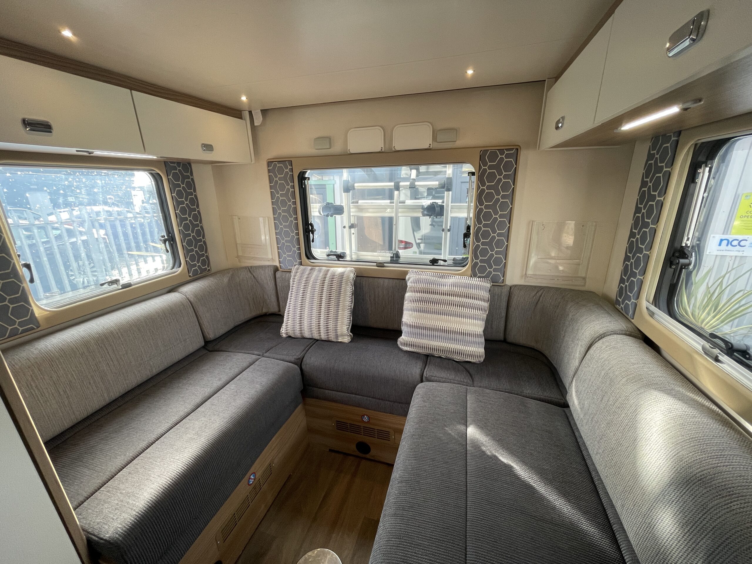 Moving forward, you’ll find the central washroom, cleverly designed to maximise space and functionality. This area includes a shower, cassette toilet, washbasin with vanity unit and useful storage for toiletries. The washroom I positioned perfectly so access throughout the evening hours is minimal.