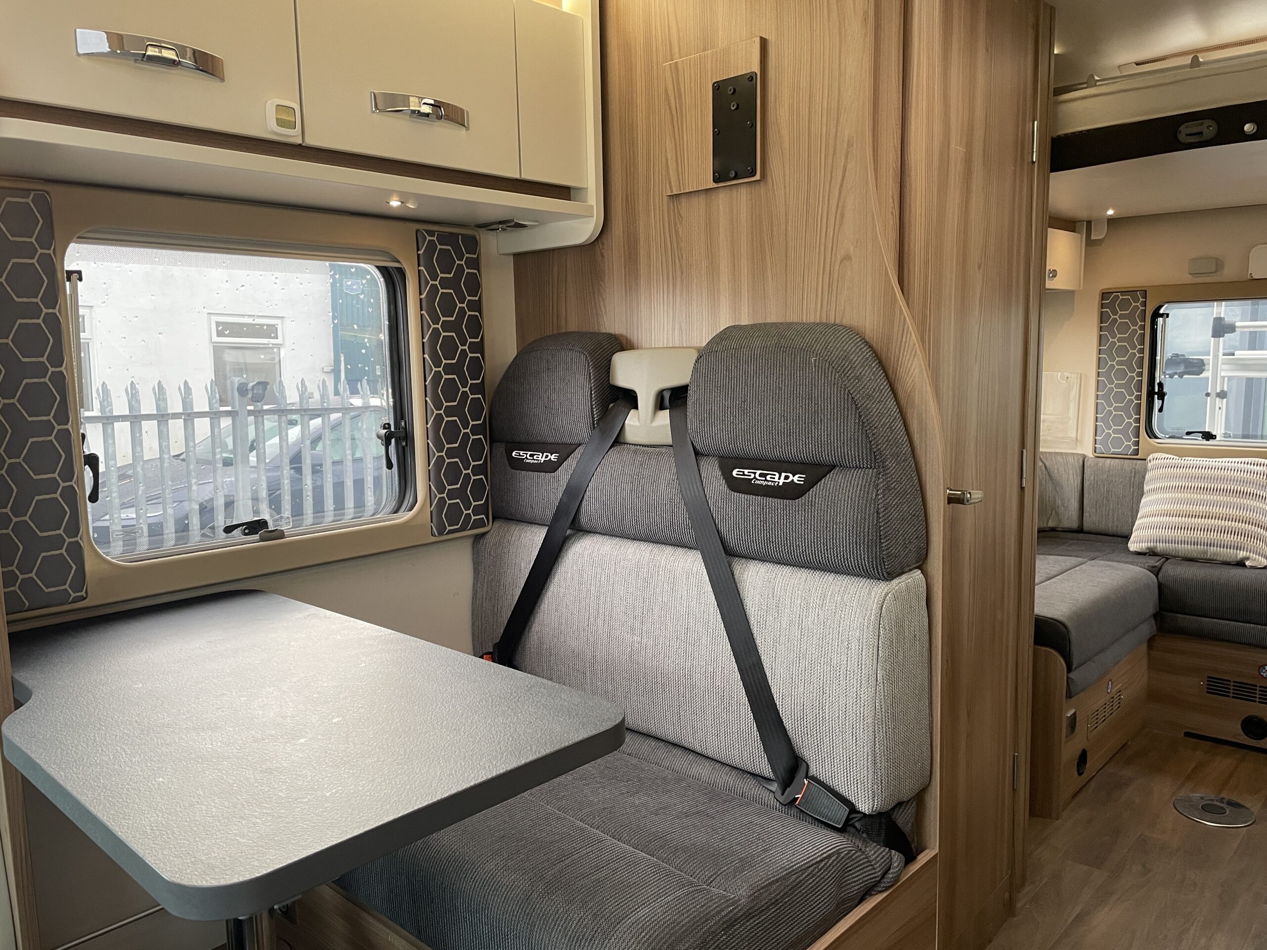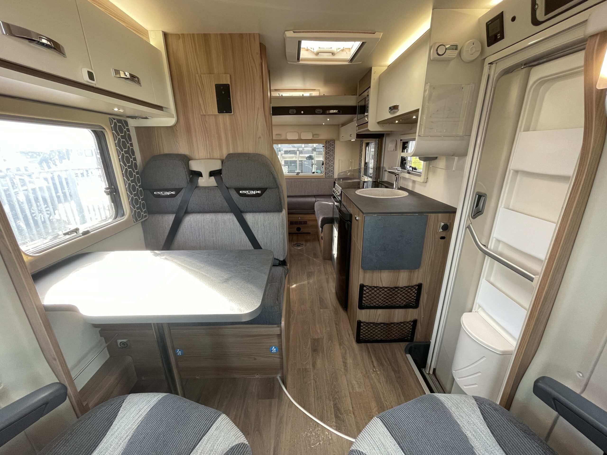 Continuing towards the front, the half-dinette lounge area integrates seamlessly with the swivel cab seats to create a bright and sociable living space. Large windows allow natural light to flood in, enhancing the open feel despite the Compact’s narrower body. This area also offers additional seating for guests and both above and below storage can be found. The front lounge is wonderful as it offers a comfy accessible place to sit even if the beds are both being used in the rear.
