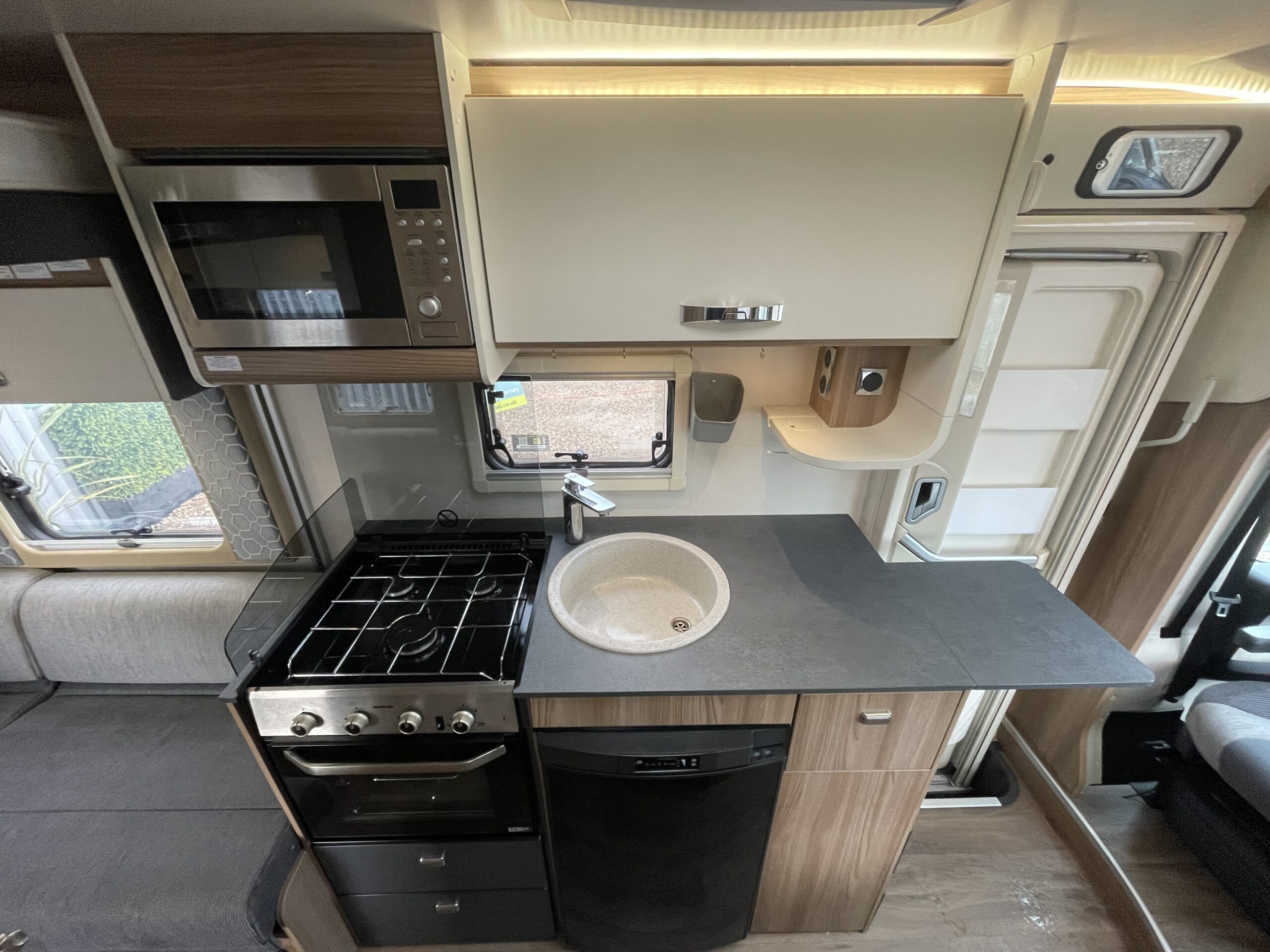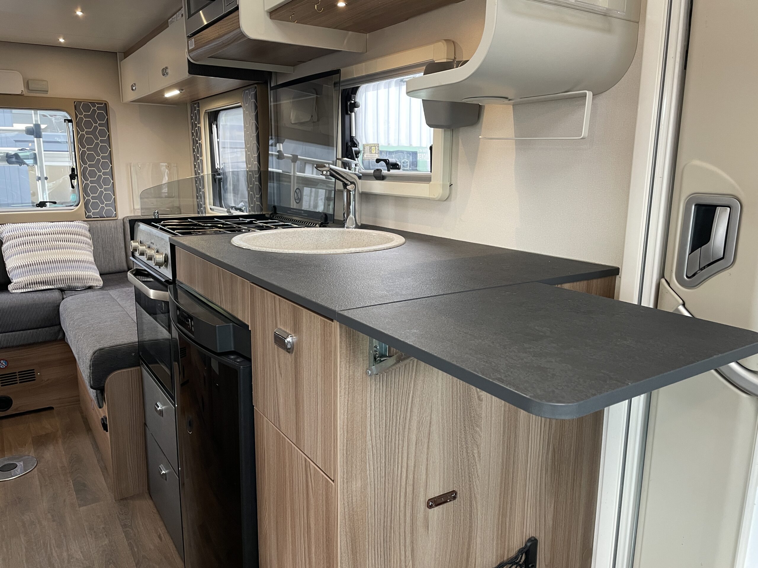 Opposite, the well-equipped kitchen provides everything required for comfortable touring. Featuring a 3 ring gas hob, oven and grill, sink, fridge with freezer compartment, microwave and ample cupboard and worktop space, the kitchen is perfectly suited for preparing meals whether on short getaways or extended adventures. If you need more worktop space, the extendable worktop has you covered. The drainboard for the sink and the cover can both be found in the bottom of the wardrobe which is next to the bed.
