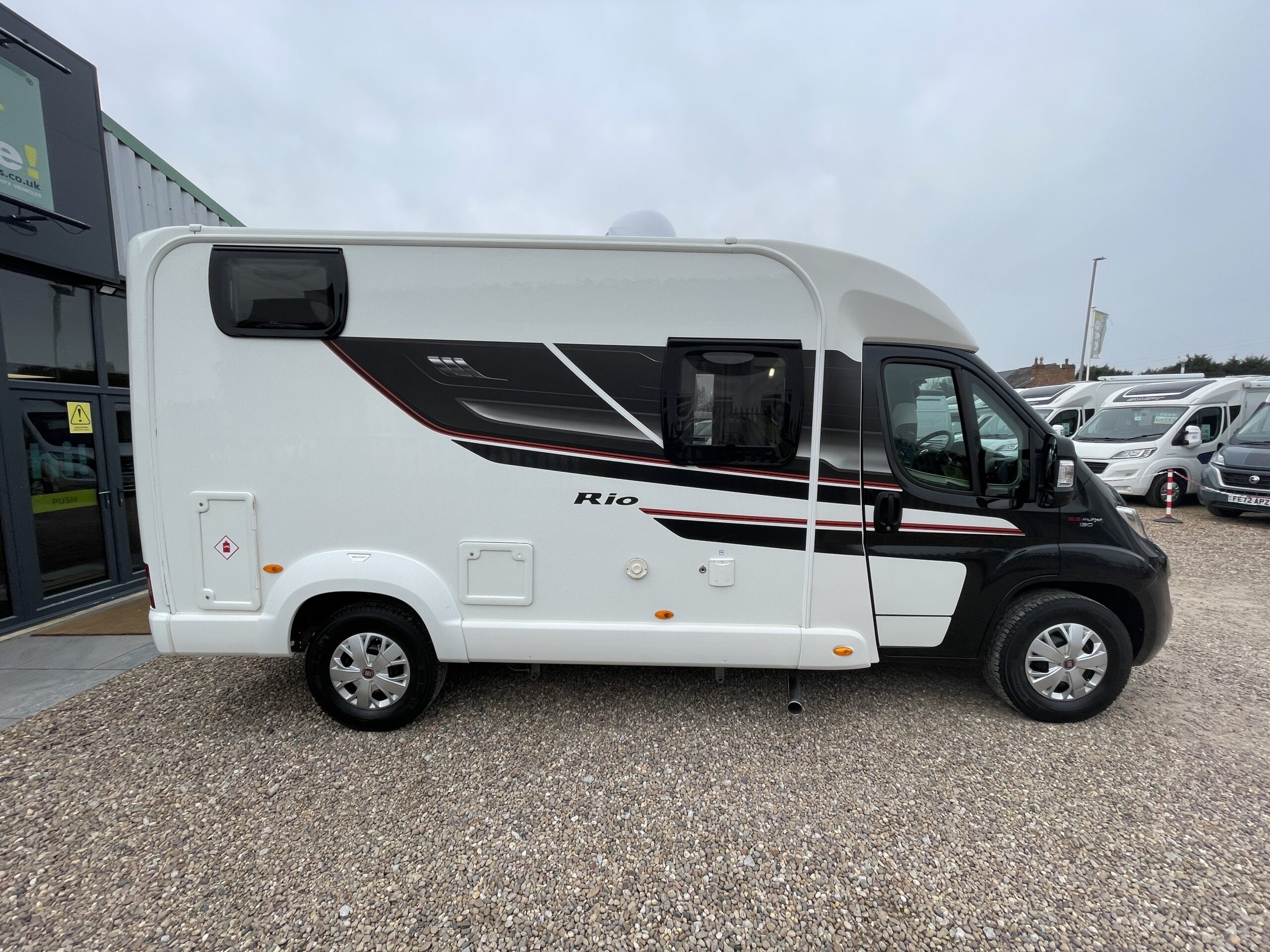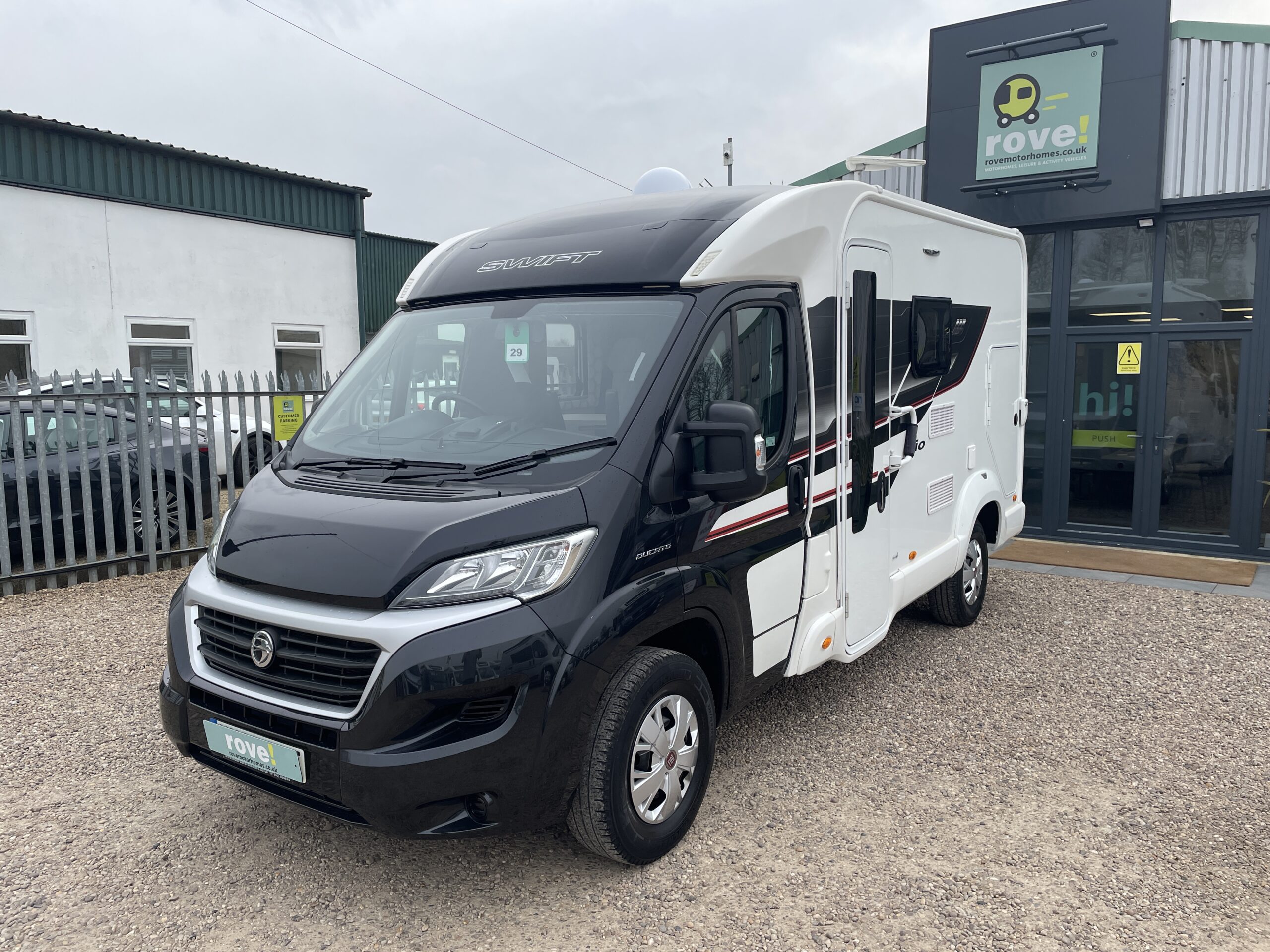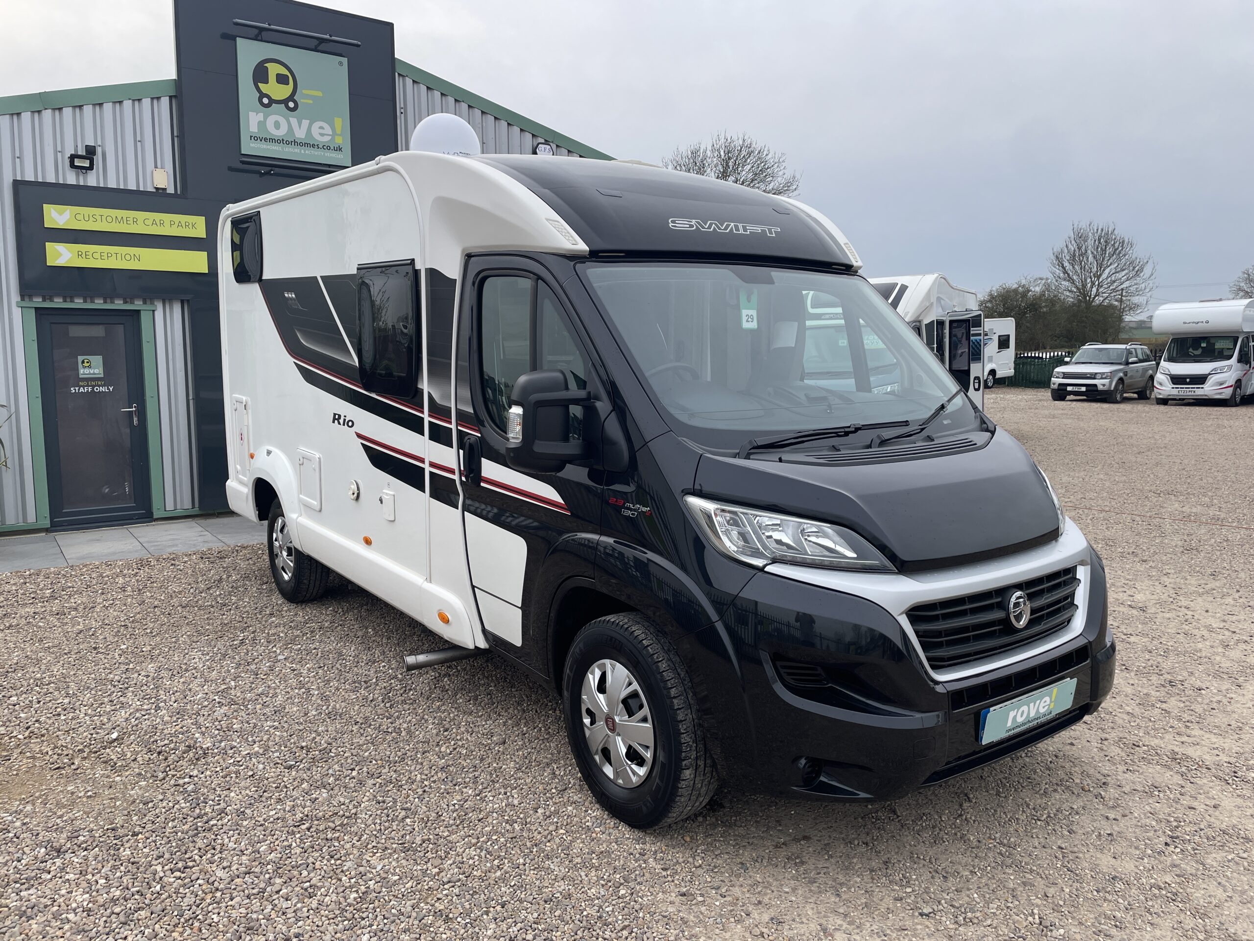 Rove motorhomes Gunthorpe are excited to off this Swift Rio 325. The 325 is a compact lowline coach built motorhome ready for a big adventure! It is compact enough for city streets yet spacious enough for real touring comfort; true all-rounder. It is based on the Fiat Ducato chassis with a 2287cc diesel engine and manual transmission. The cabin benefits from air conditioning, Bluetooth, swivel seats and cabin blinds.