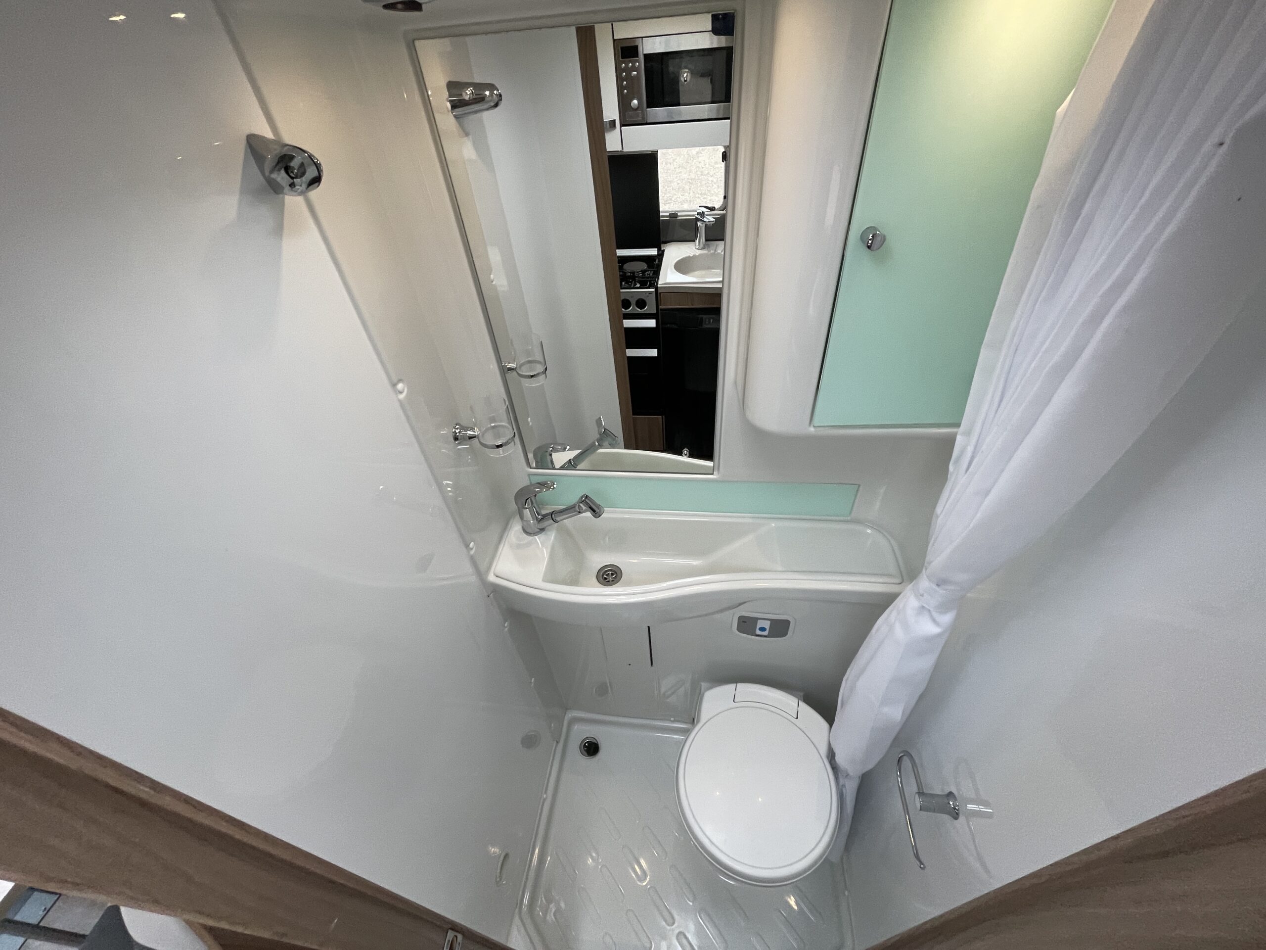• Modern Washroom – Complete with a cassette toilet, basin, and a separate shower cubicle
