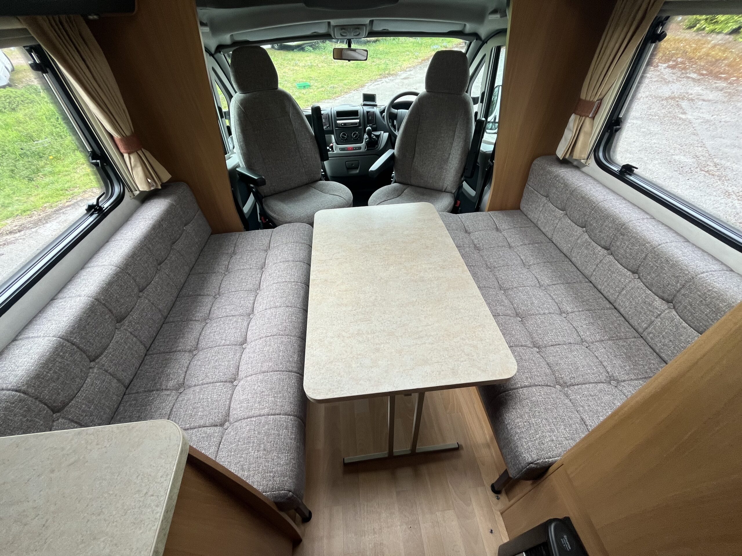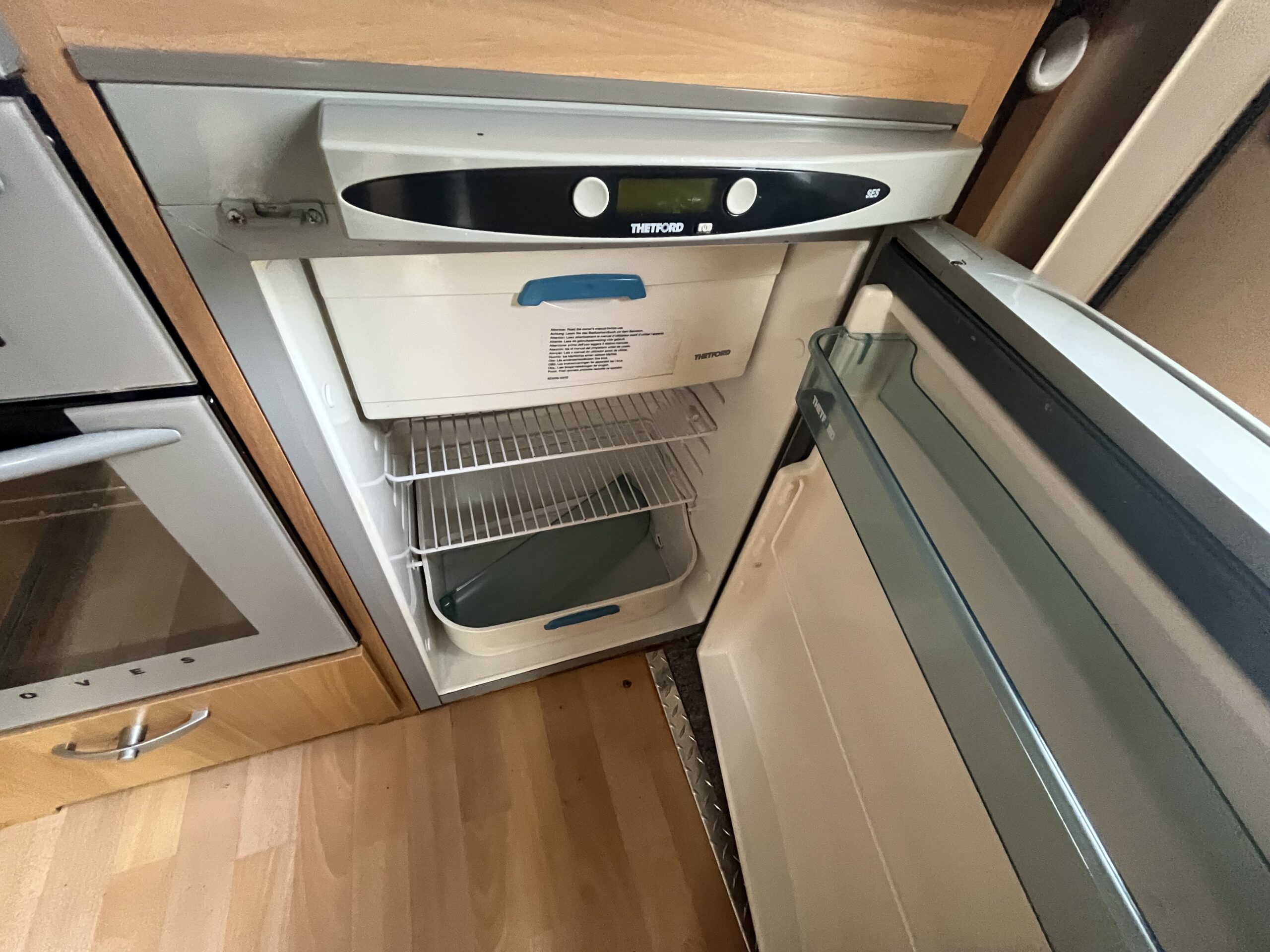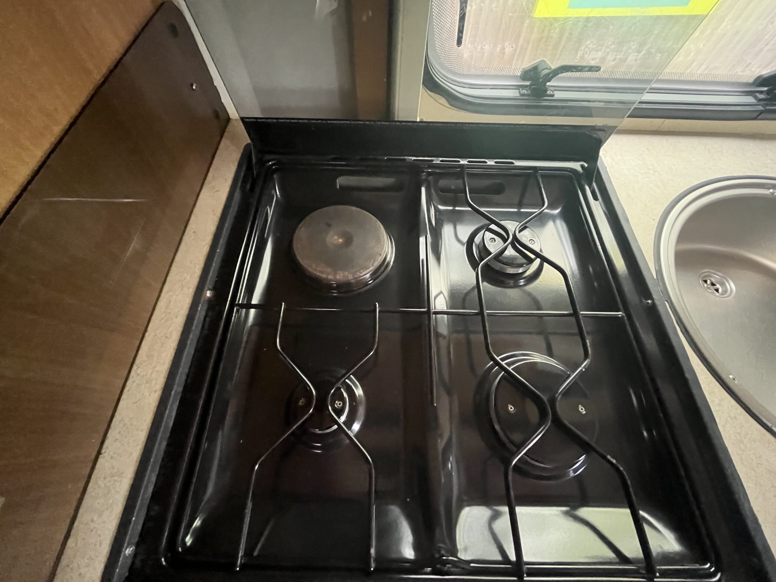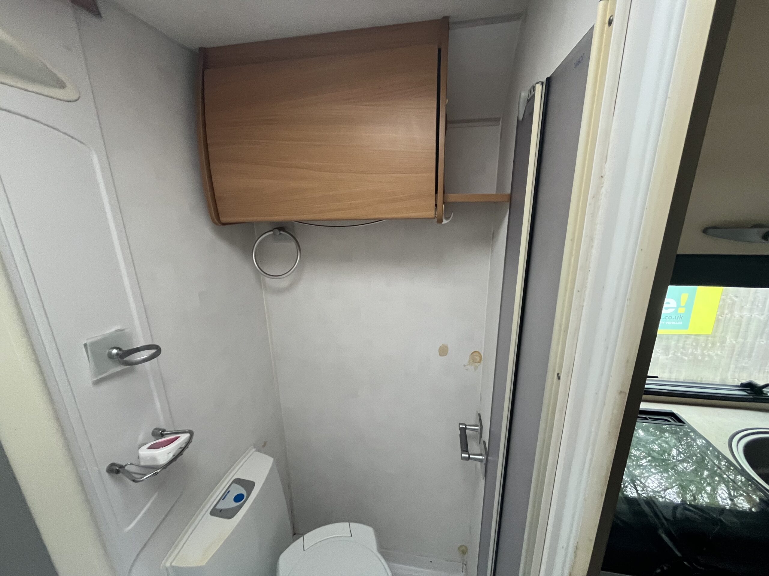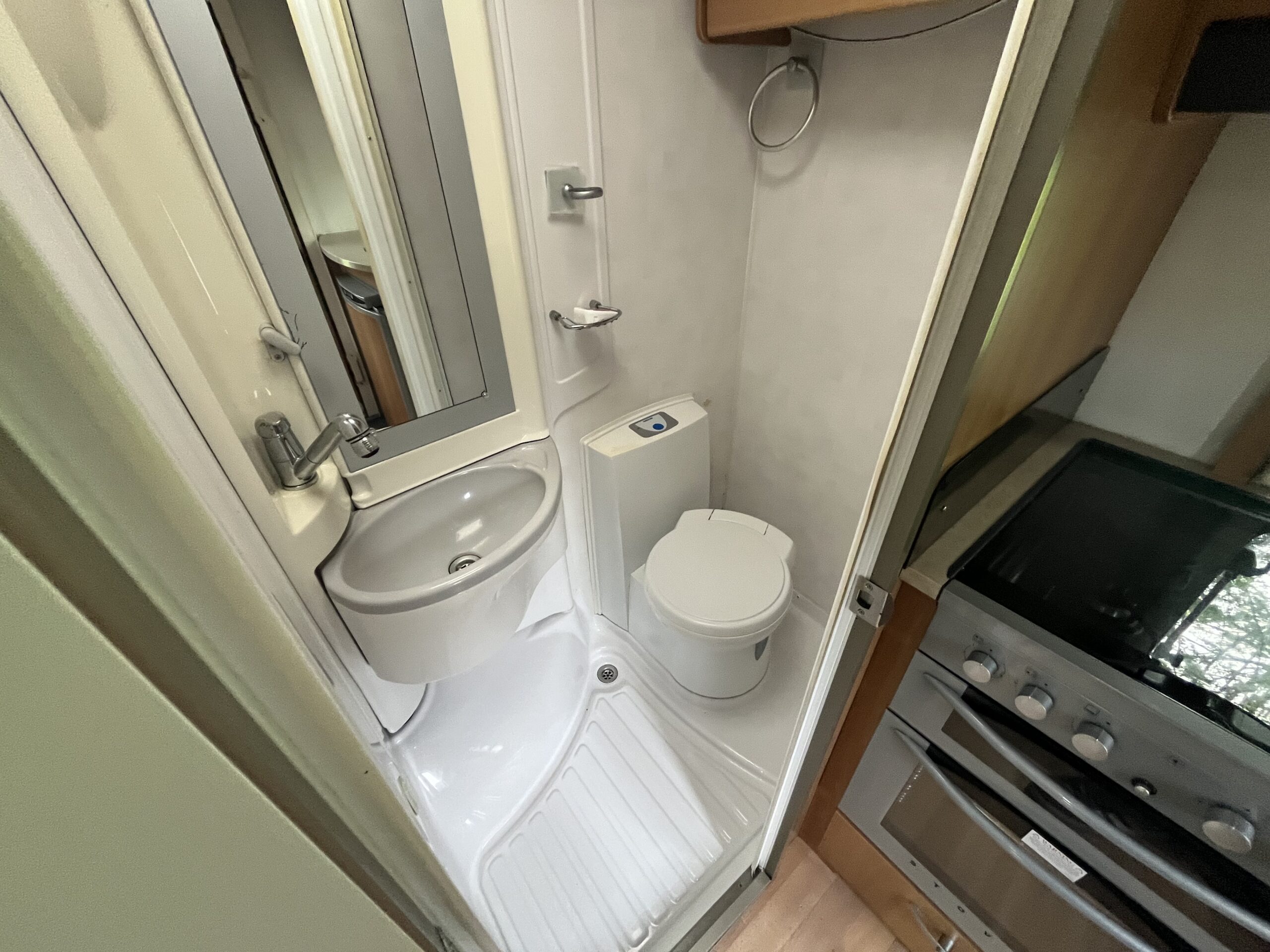 This compact motorhome certainly packs a lot in for its size. We enter the motorhome at the rear of the passenger side via an electric step, immediately on the right is the kitchen area which consists of a 4 ring gas burners and underneath is a full size oven and grill. The sink is round with a chrome mixer tap. Just to the left of the Habitation door is a Thetford 3 way fridge with freezer box that will run on 12v; 240v or gas depending whether you are plugged into the mains or wild camping. There is plenty of cupboard space for all your cooking utensils. Moving forward is the bathroom, a wetroom style that consists of a Thetford fresh water flush toilet, there is a grey sink with chrome mixer tap that pulls out to use as the shower head. There are Perspex doors to keep the built in cupboard dry whilst the shower is in use.
