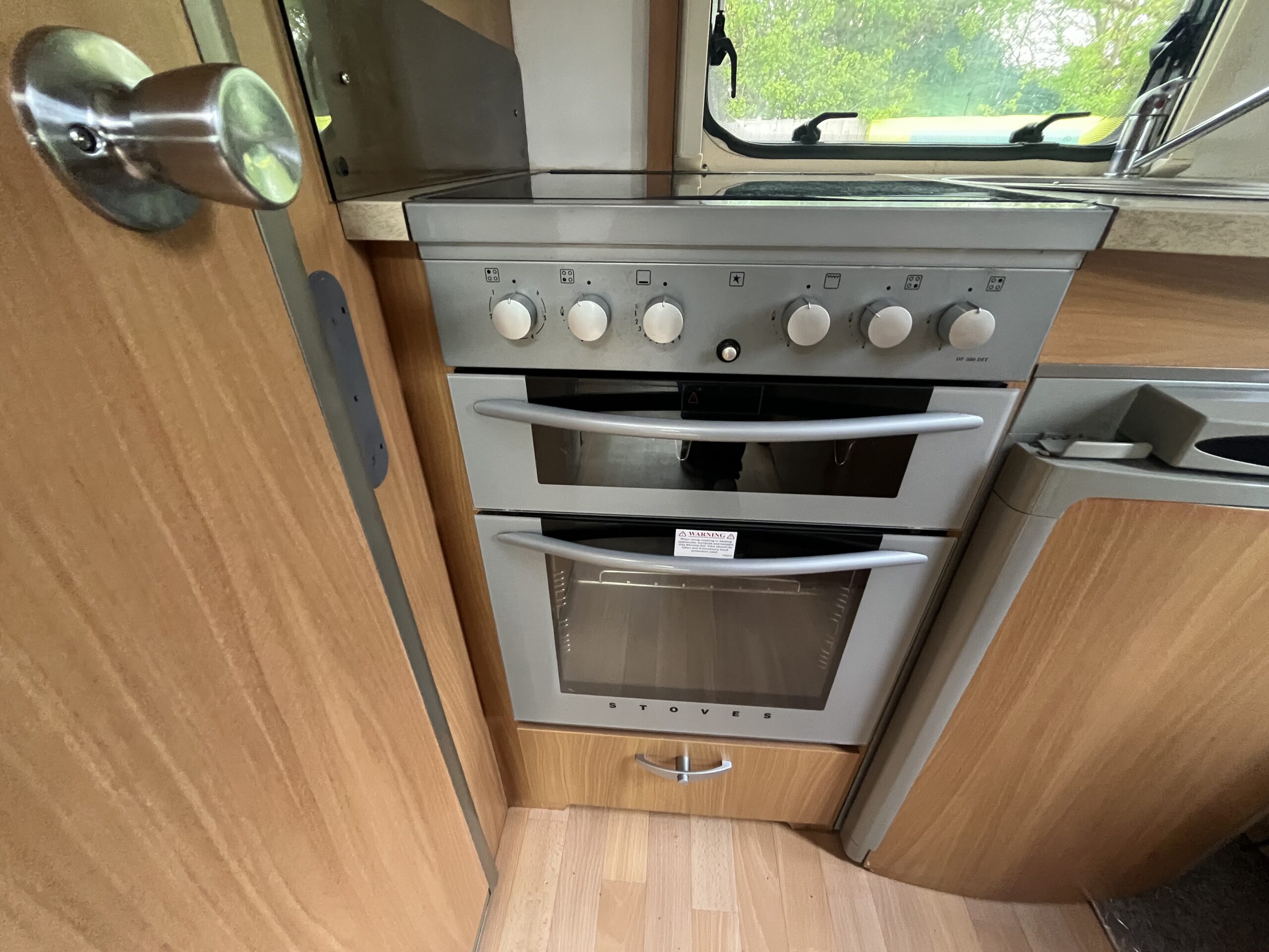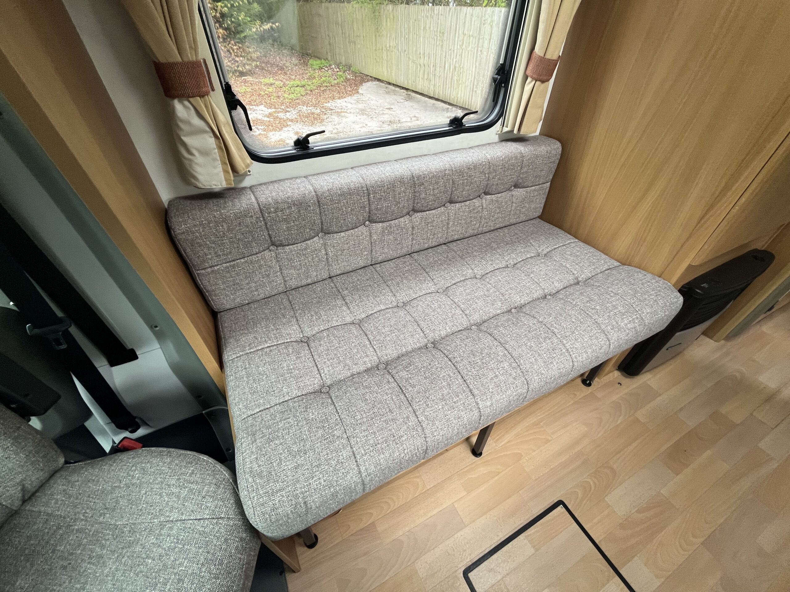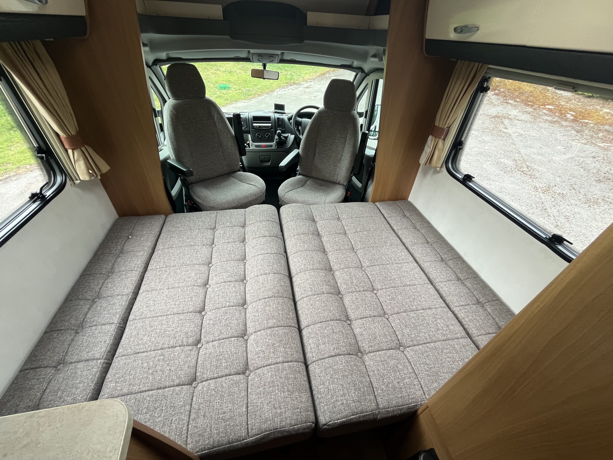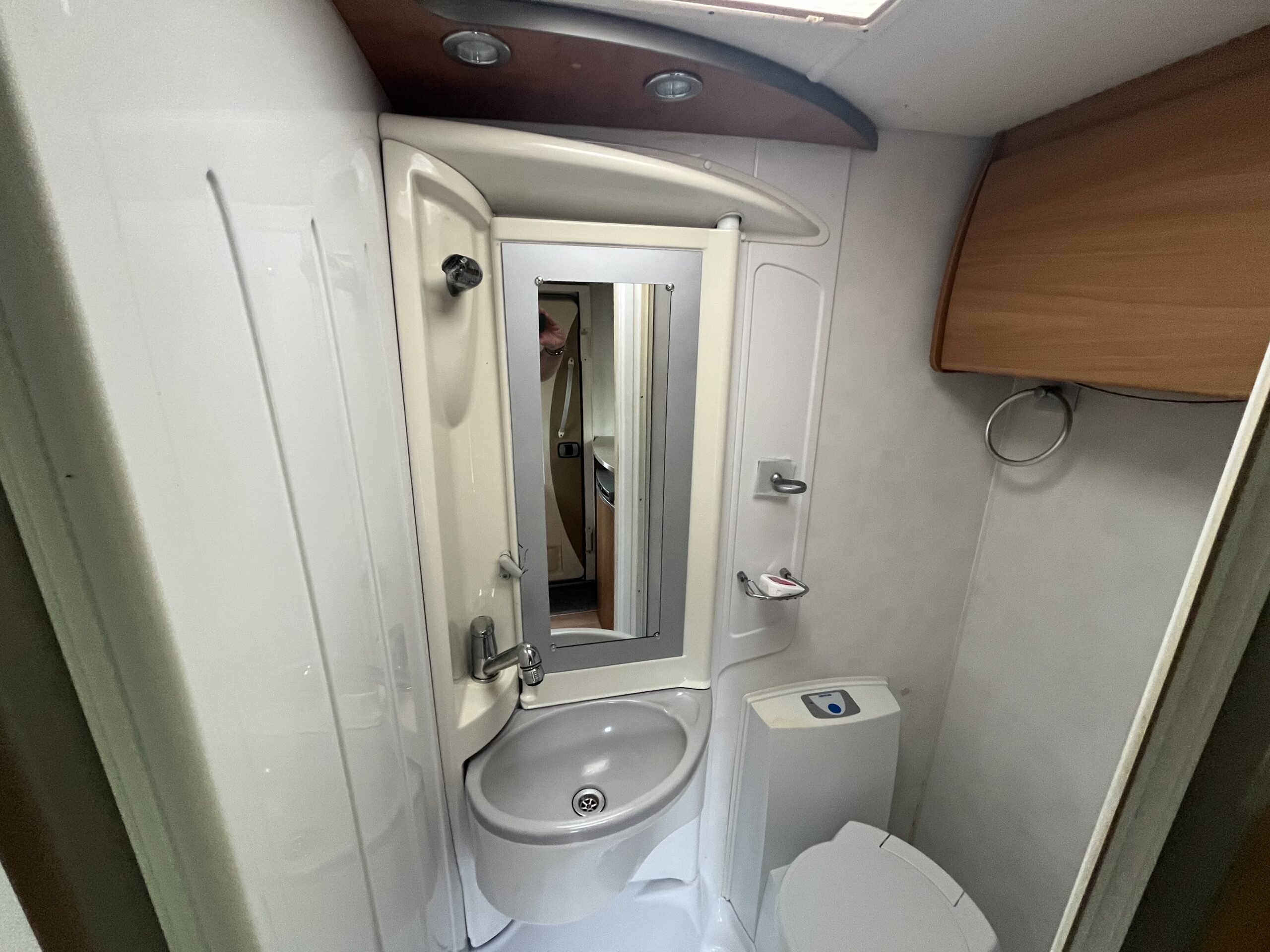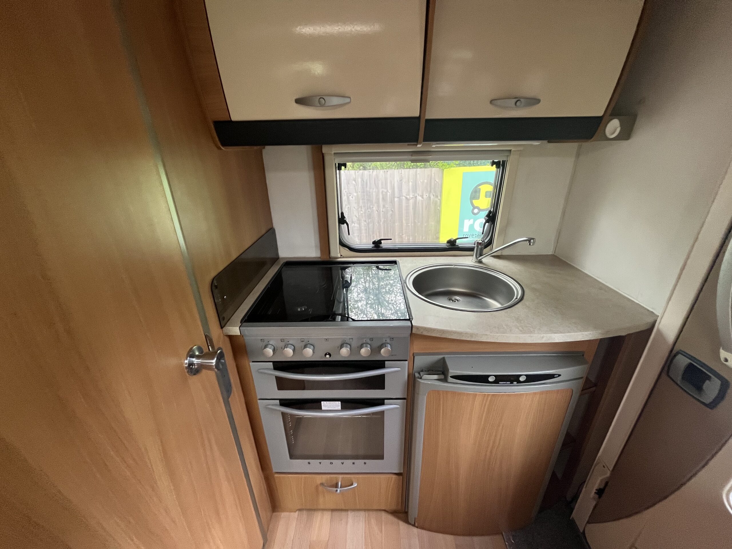 This compact motorhome certainly packs a lot in for its size. We enter the motorhome at the rear of the passenger side via an electric step, immediately on the right is the kitchen area which consists of a 4 ring gas burners and underneath is a full size oven and grill. The sink is round with a chrome mixer tap. Just to the left of the Habitation door is a Thetford 3 way fridge with freezer box that will run on 12v; 240v or gas depending whether you are plugged into the mains or wild camping. There is plenty of cupboard space for all your cooking utensils. Moving forward is the bathroom, a wetroom style that consists of a Thetford fresh water flush toilet, there is a grey sink with chrome mixer tap that pulls out to use as the shower head. There are Perspex doors to keep the built in cupboard dry whilst the shower is in use.