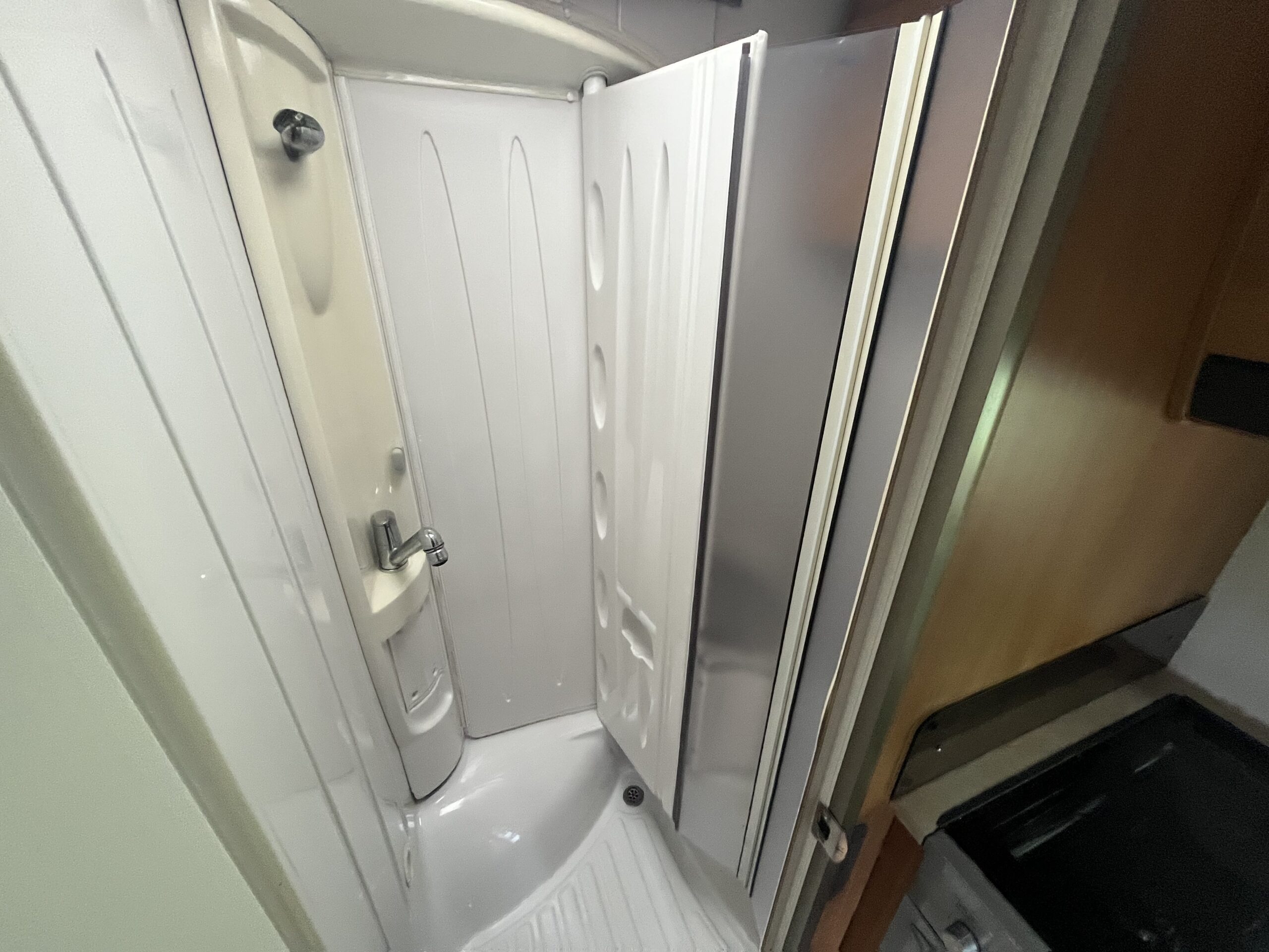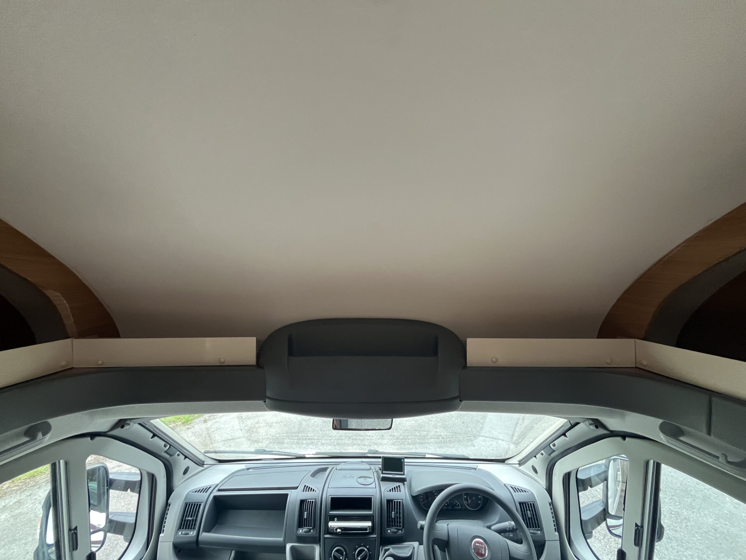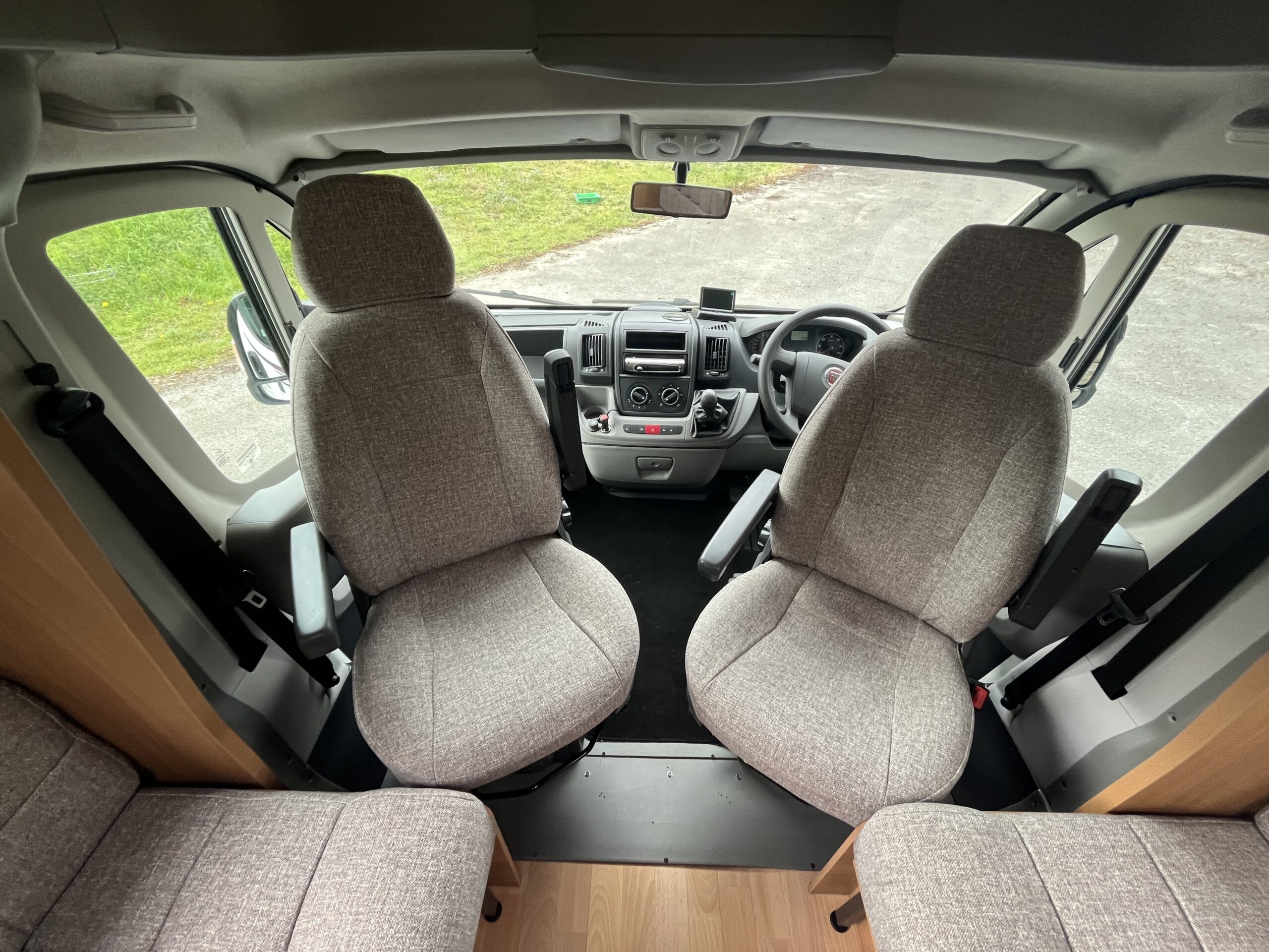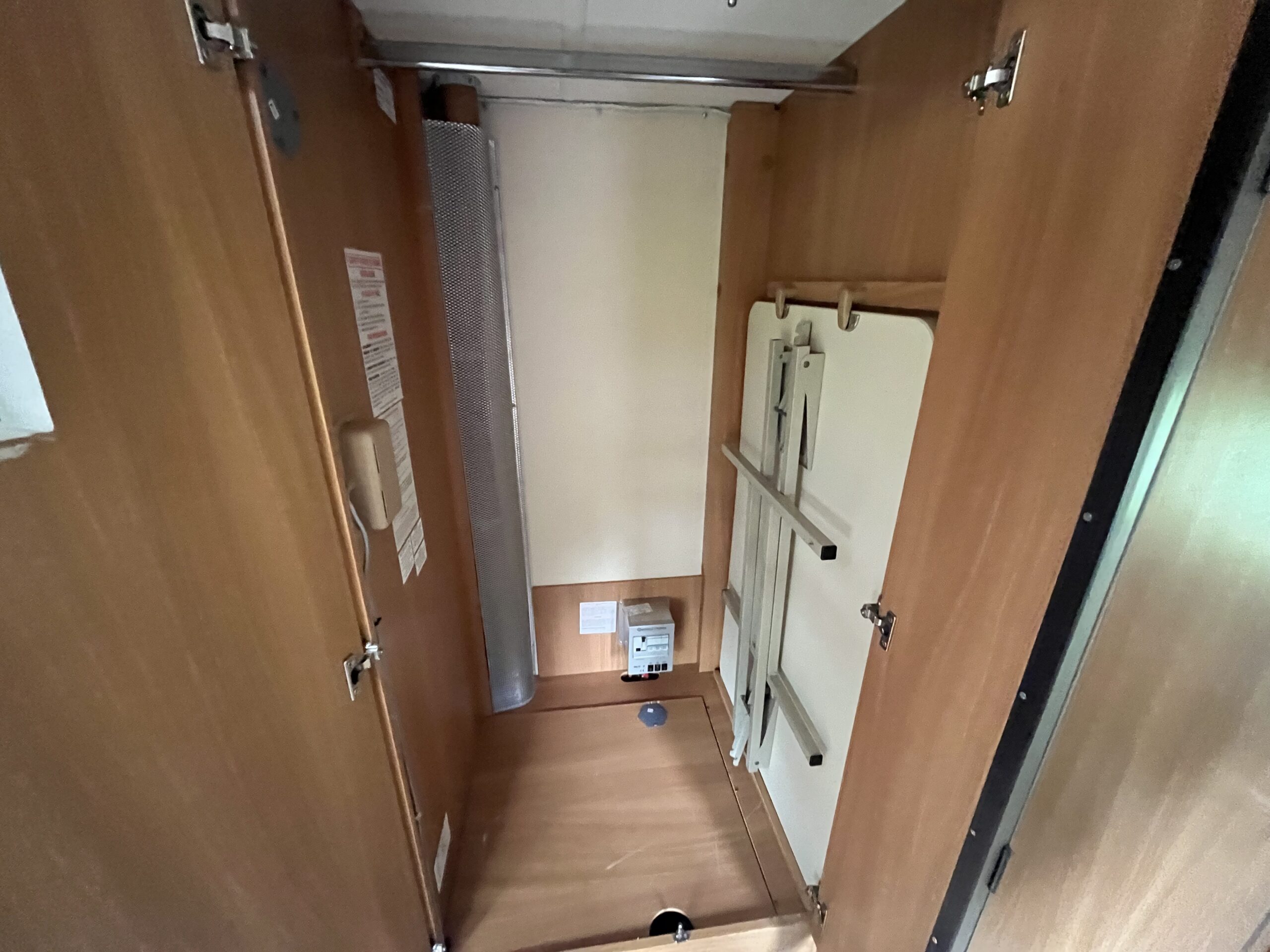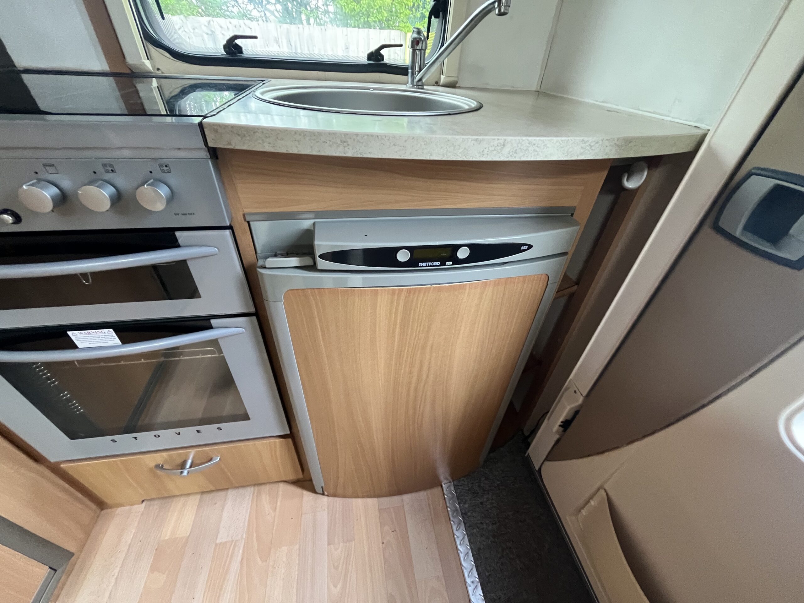 This compact motorhome certainly packs a lot in for its size. We enter the motorhome at the rear of the passenger side via an electric step, immediately on the right is the kitchen area which consists of a 4 ring gas burners and underneath is a full size oven and grill. The sink is round with a chrome mixer tap. Just to the left of the Habitation door is a Thetford 3 way fridge with freezer box that will run on 12v; 240v or gas depending whether you are plugged into the mains or wild camping. There is plenty of cupboard space for all your cooking utensils. Moving forward is the bathroom, a wetroom style that consists of a Thetford fresh water flush toilet, there is a grey sink with chrome mixer tap that pulls out to use as the shower head. There are Perspex doors to keep the built in cupboard dry whilst the shower is in use.