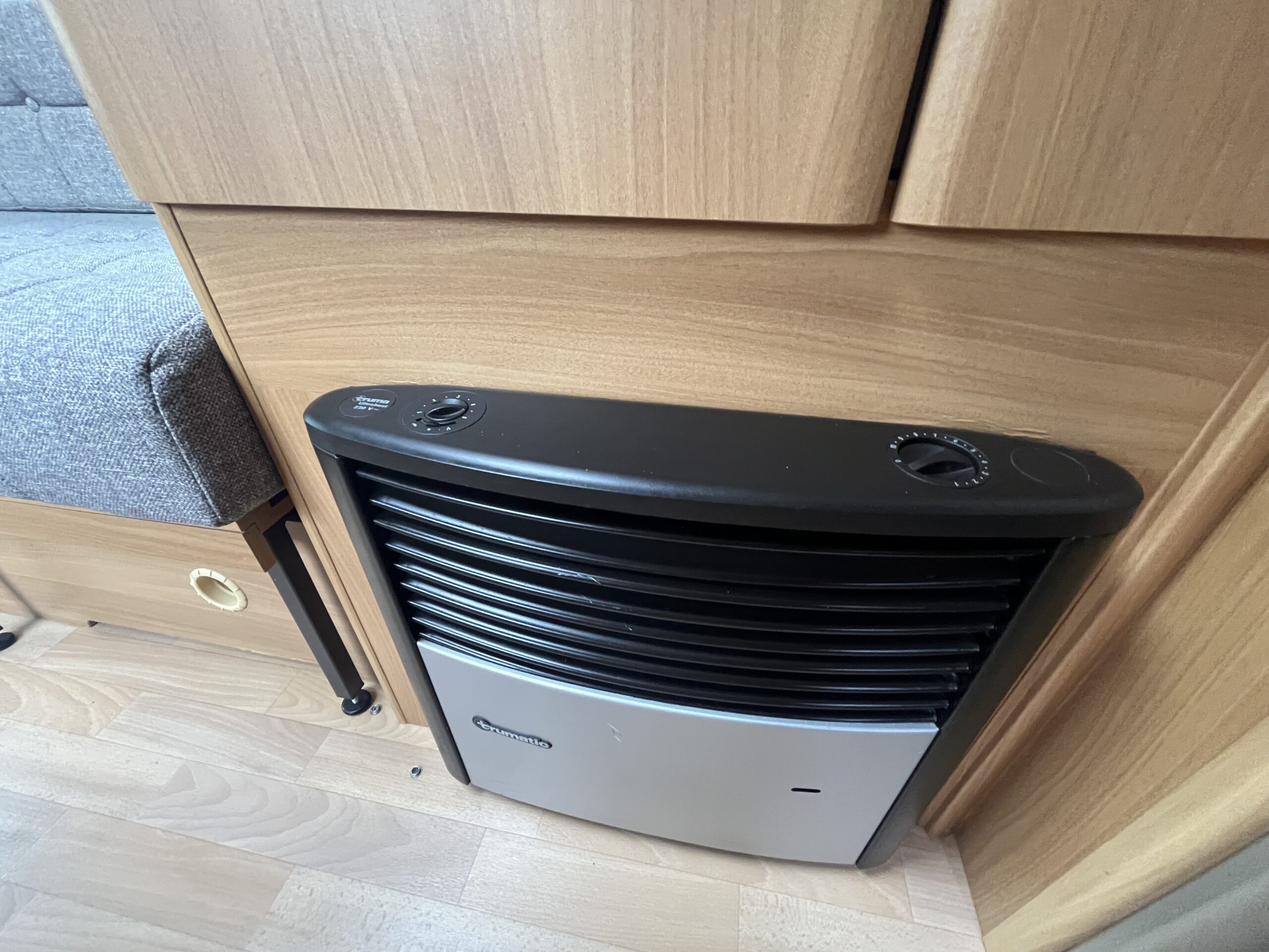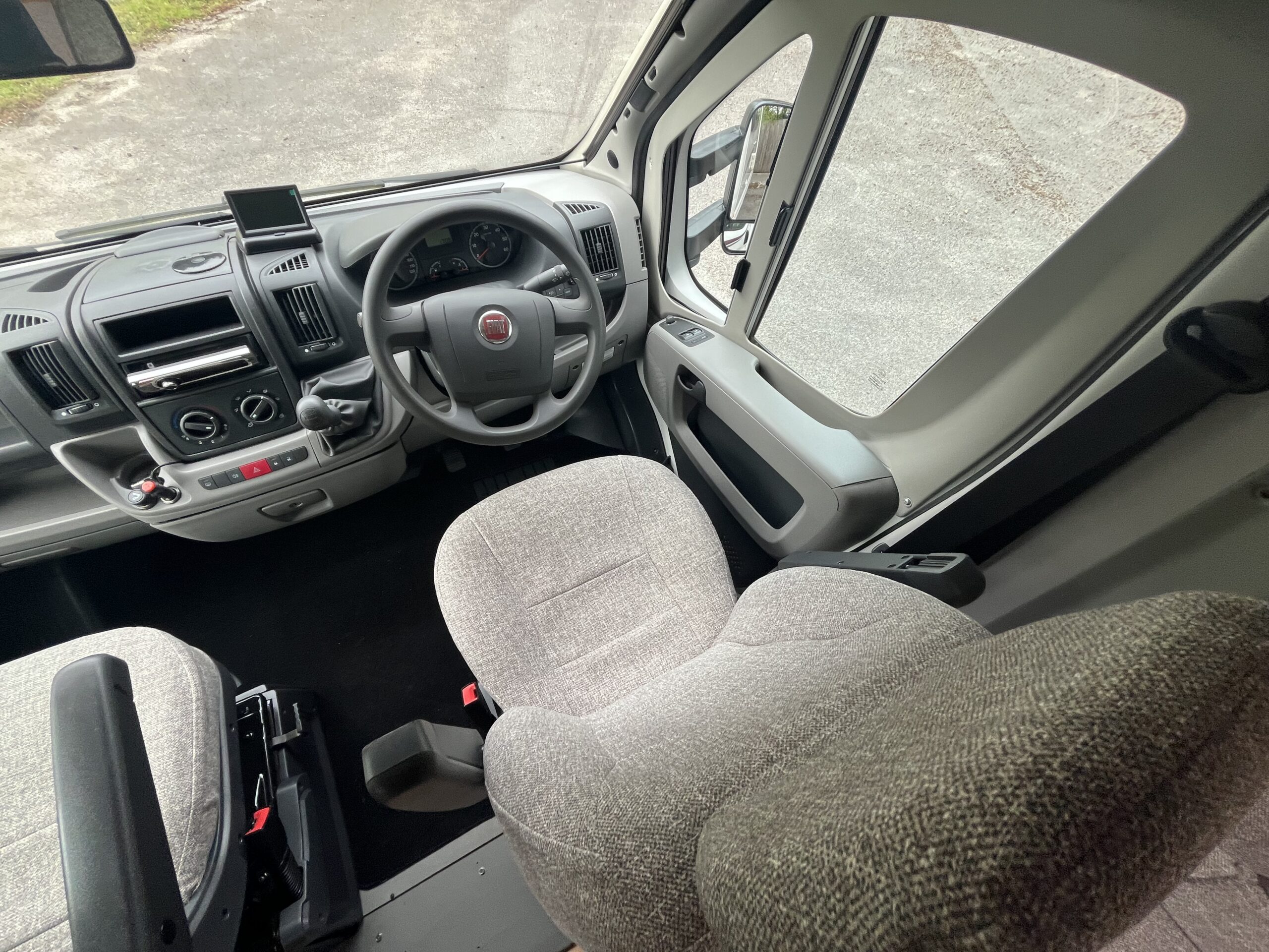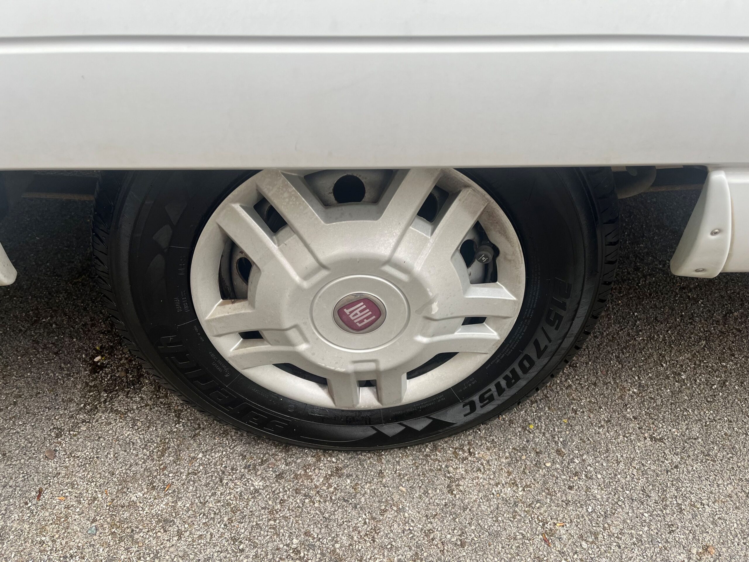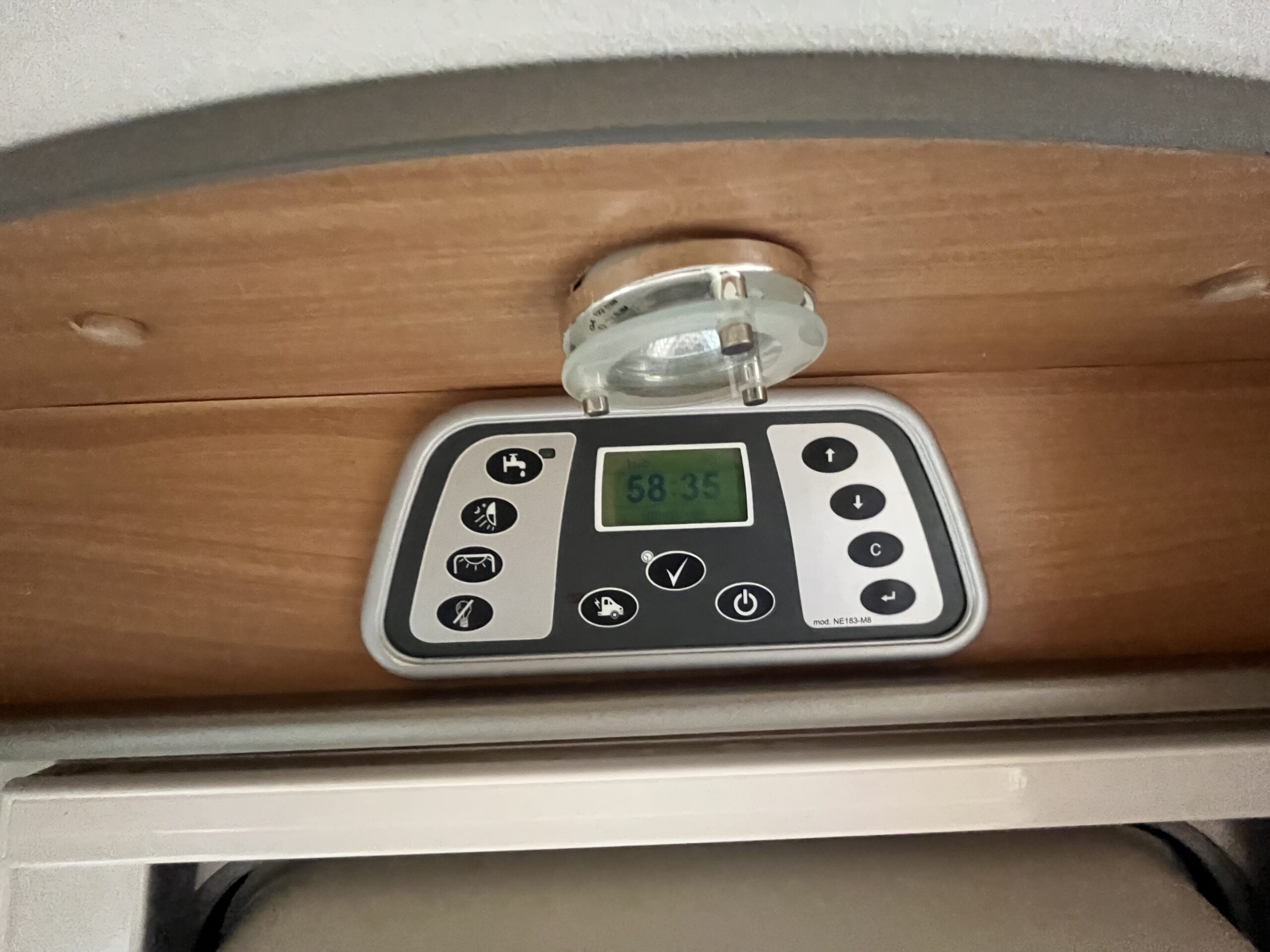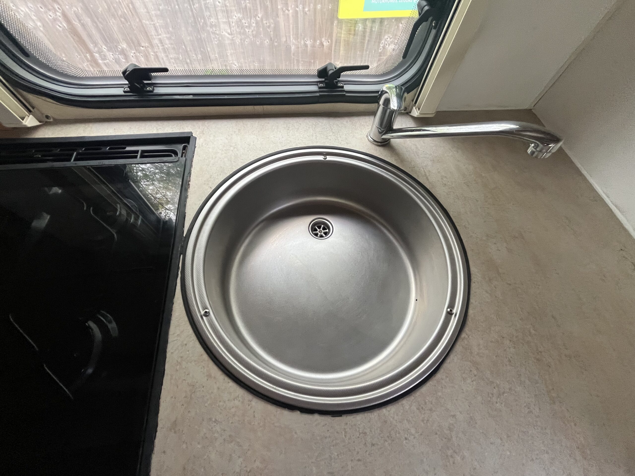 This compact motorhome certainly packs a lot in for its size. We enter the motorhome at the rear of the passenger side via an electric step, immediately on the right is the kitchen area which consists of a 4 ring gas burners and underneath is a full size oven and grill. The sink is round with a chrome mixer tap. Just to the left of the Habitation door is a Thetford 3 way fridge with freezer box that will run on 12v; 240v or gas depending whether you are plugged into the mains or wild camping. There is plenty of cupboard space for all your cooking utensils. Moving forward is the bathroom, a wetroom style that consists of a Thetford fresh water flush toilet, there is a grey sink with chrome mixer tap that pulls out to use as the shower head. There are Perspex doors to keep the built in cupboard dry whilst the shower is in use.