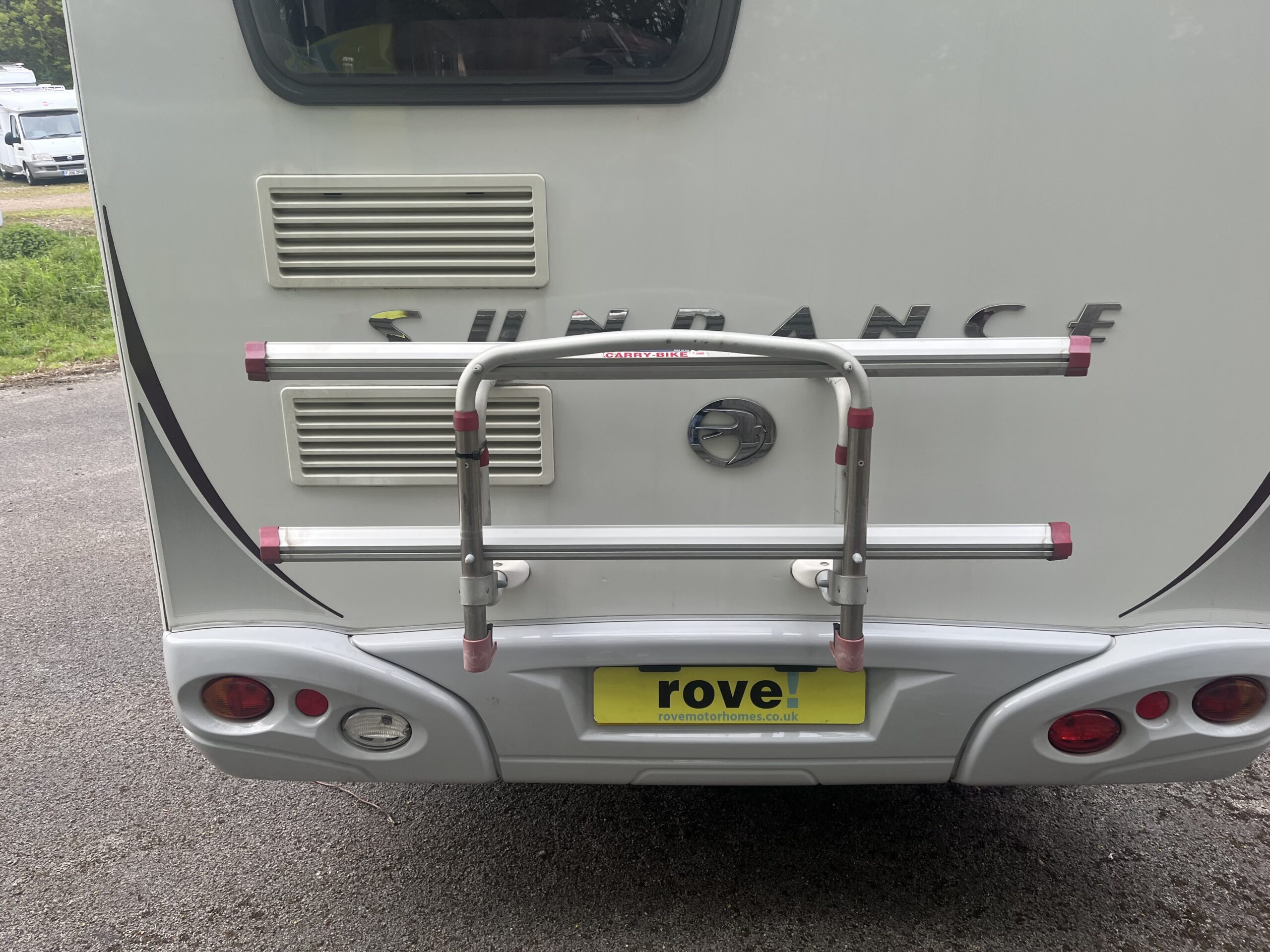 The lounge area consist or two large opposing sofas with a fold away table that stows in a cupboard while not in use, the front seats rotate to join this area so you could easily seat 6 people around while entertaining on site. This area pulls together at night to make a large double bed if required, or the sofas could be used as Single beds if required. Some of the extras that come with the motorhome are a bike rack and a reversing camera.