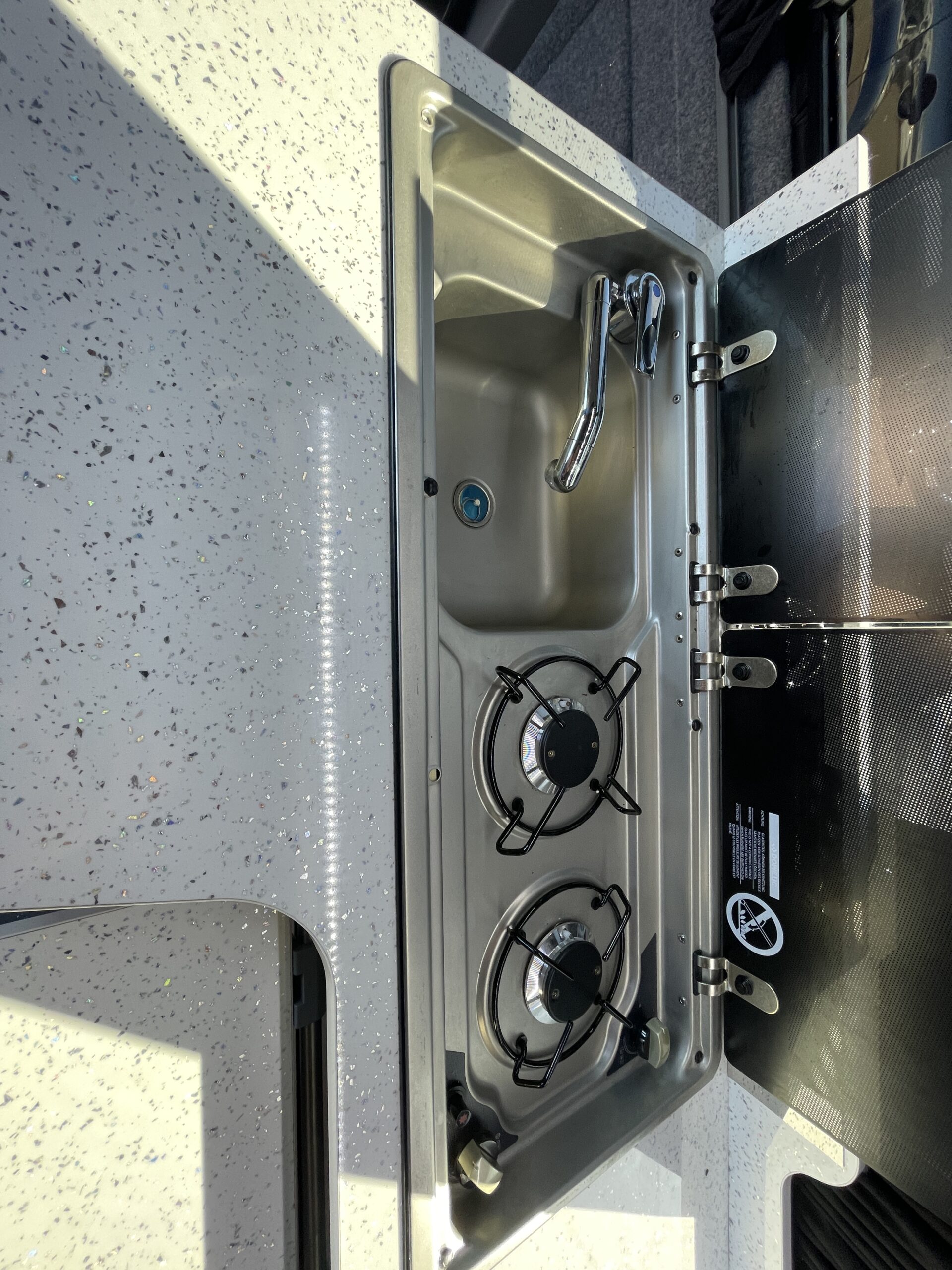 Step inside the Campervan, and you’re greeted by a well-thought-out, spacious interior that doesn’t compromise on comfort. The van offers a smart blend of practical features and homey touches, making it the perfect place to rest after a day of exploring. It features a well equipped kitchenette, with a 2 gas hob, sink, and refrigerator. Storage space is cleverly integrated, ensuring that everything has a place, from cooking equipment to personal belongings.