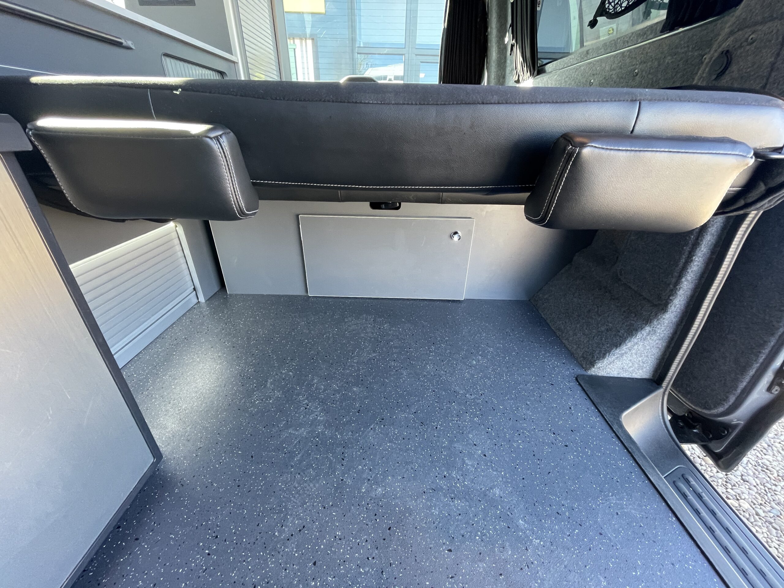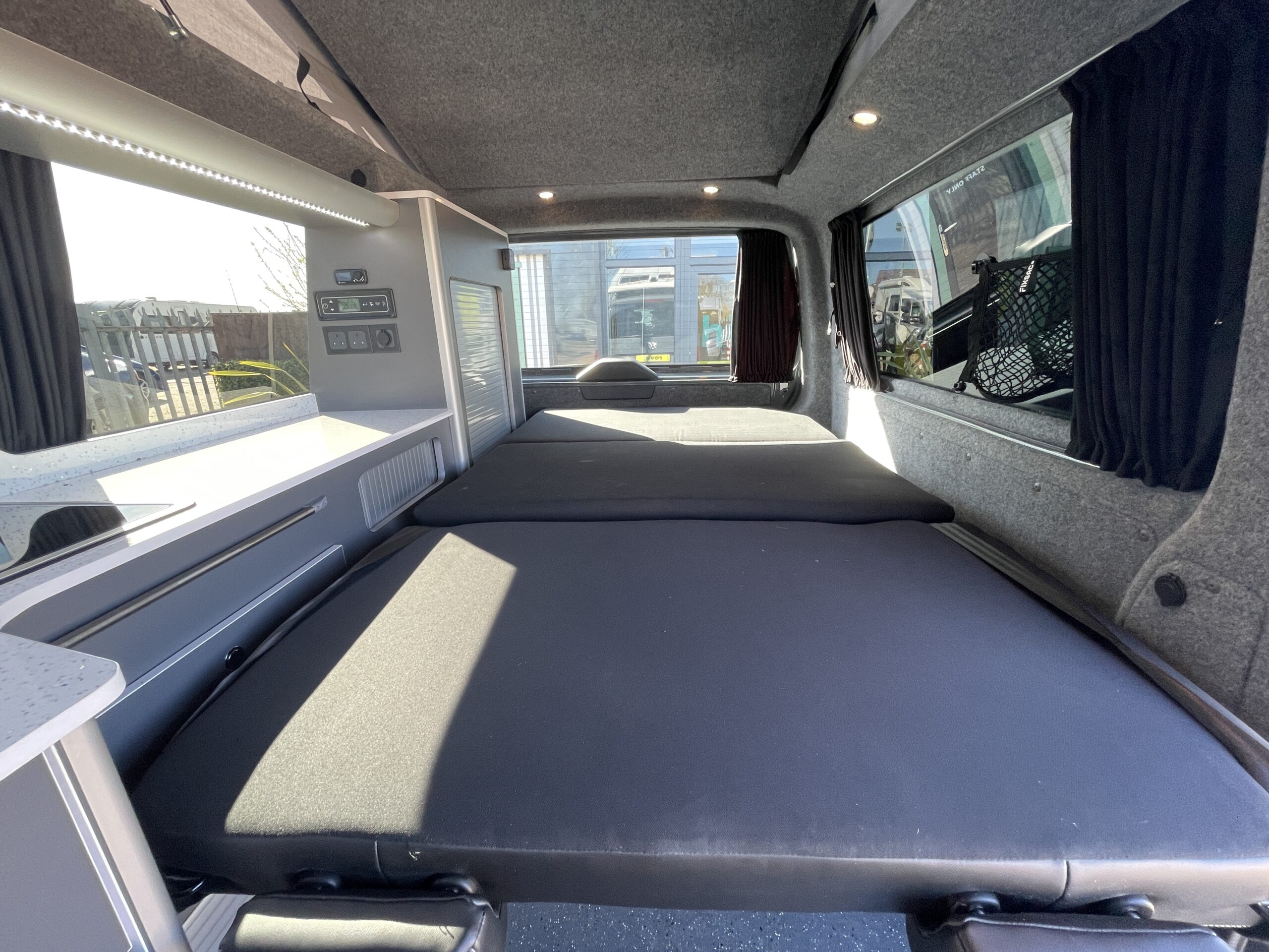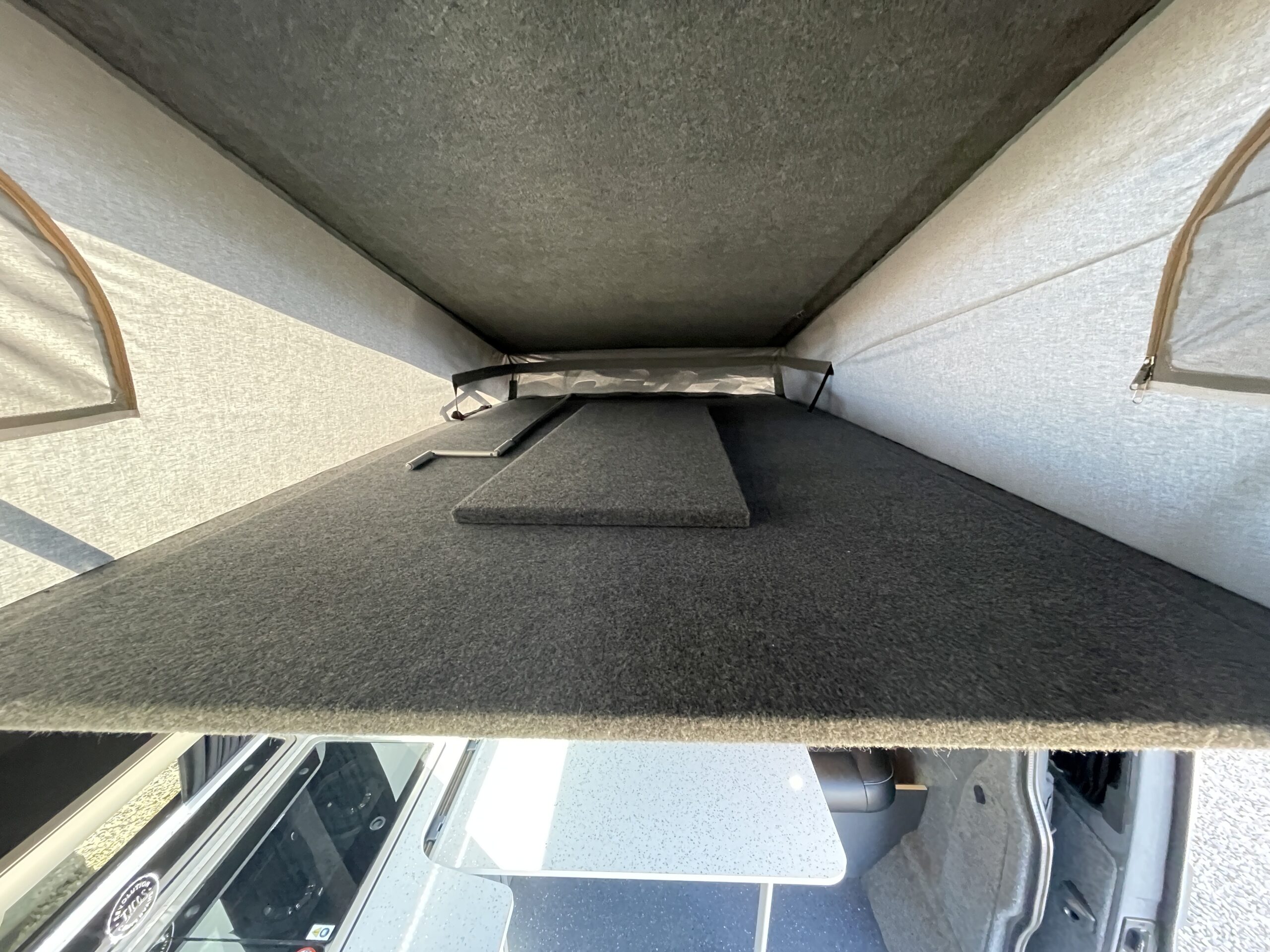 The seating arrangements are versatile and can travel up to 5 people; there is even space behind the drivers seat so you can accommodate extra leg room for the driver… in the lounge there is a fold-out table and convertible front seats that can be rearranged to accommodate up to four people. When it’s time to sleep you have a large 2 berth in the pop top as well as the lower rear seats.