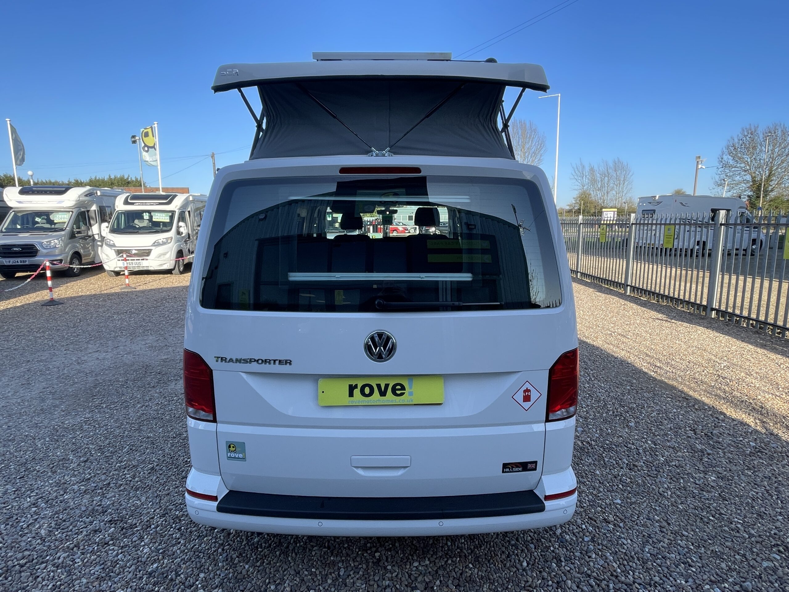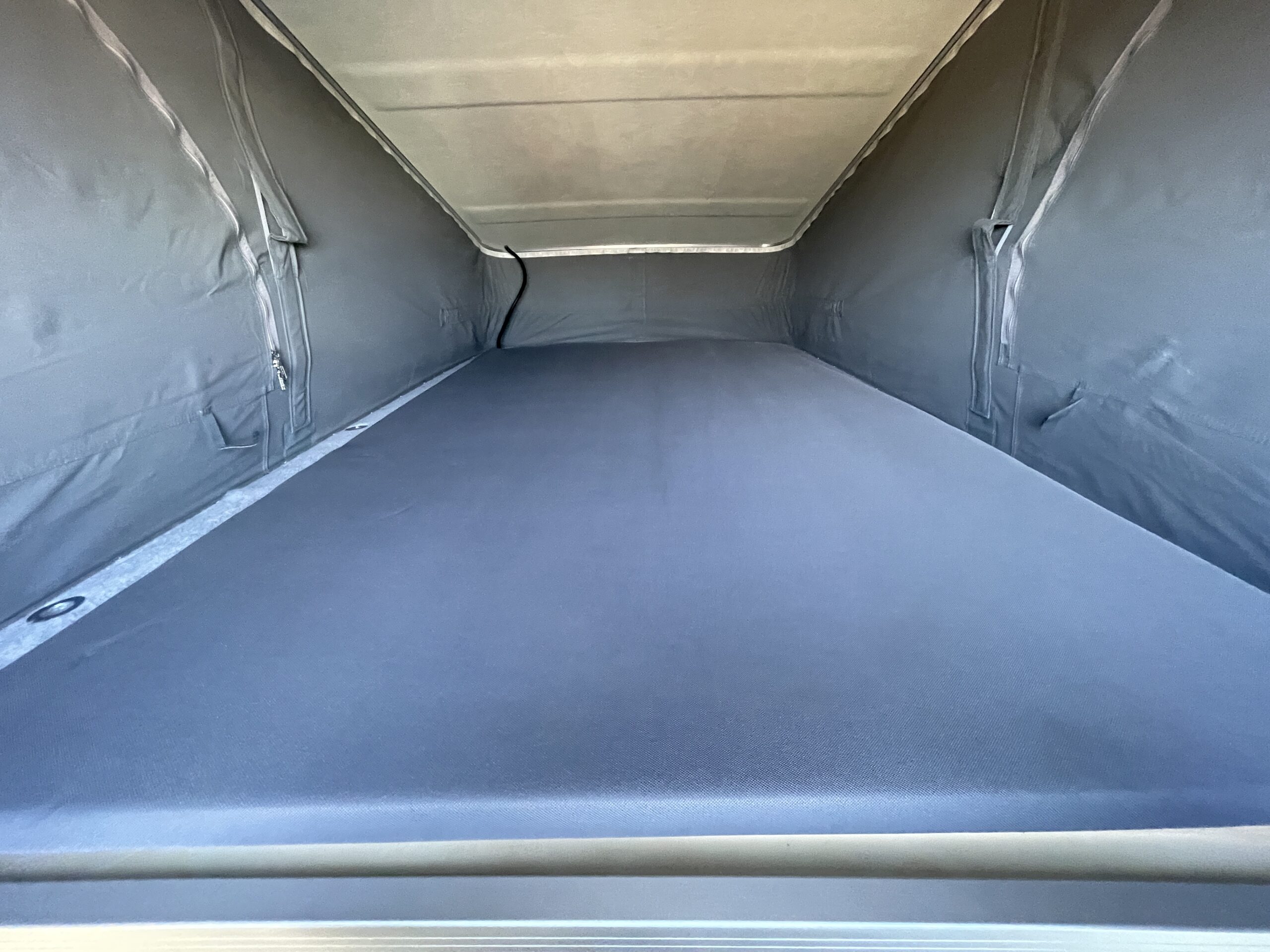 Above the living area, the elevating pop-top roof creates additional headroom within the campervan and houses a second sleeping area, ideal for accommodating extra guests or family members. This clever feature significantly increases the versatility of the vehicle while maintaining the Transporter’s manageable height for everyday driving.