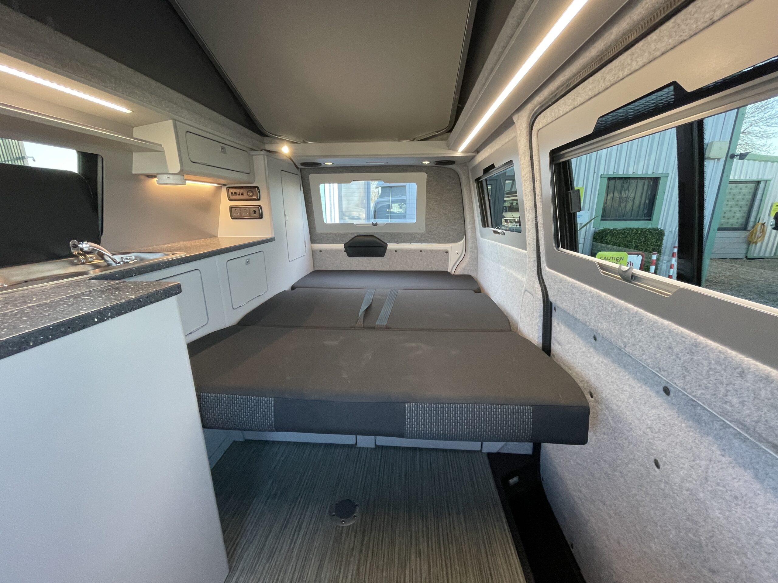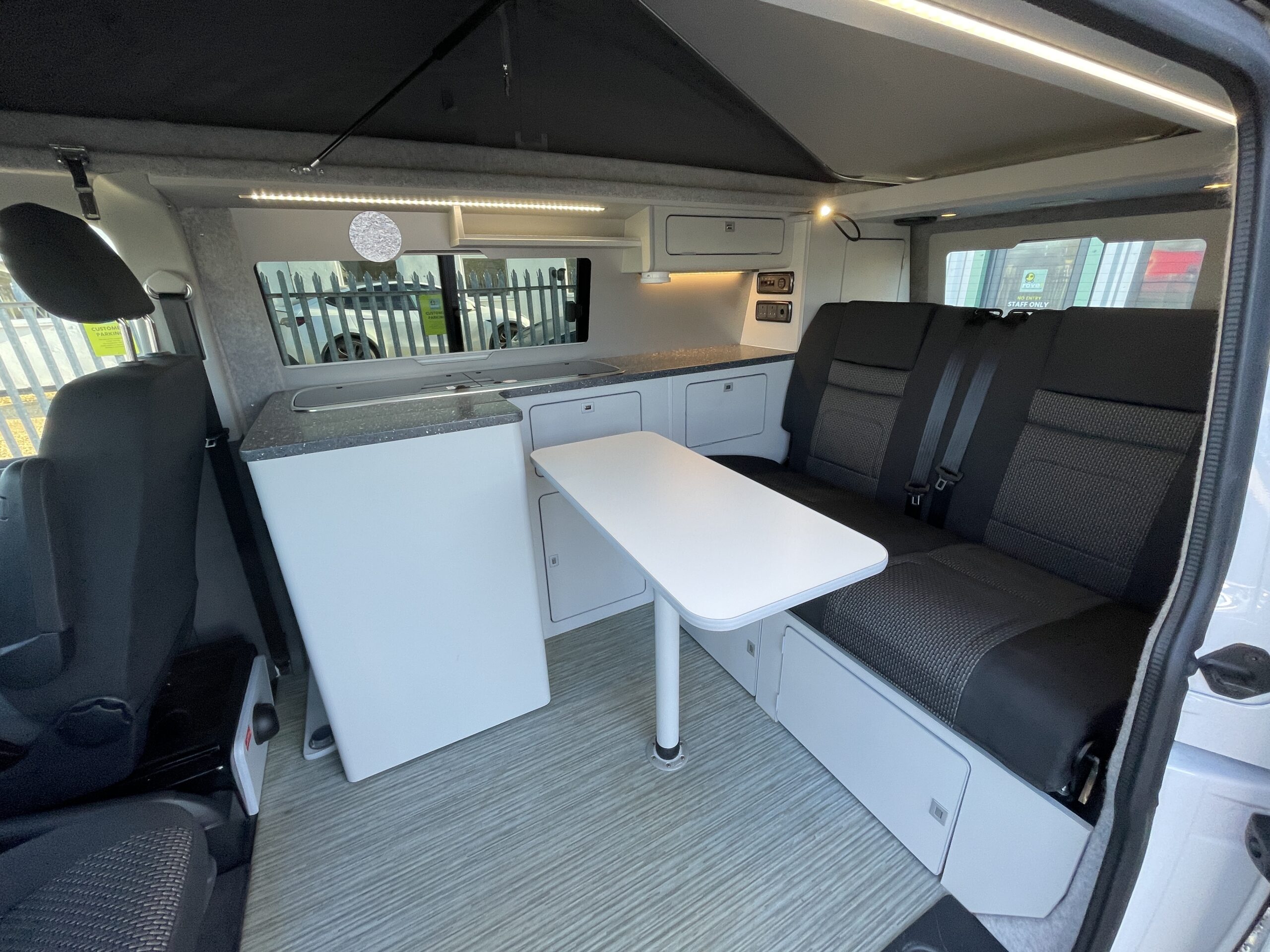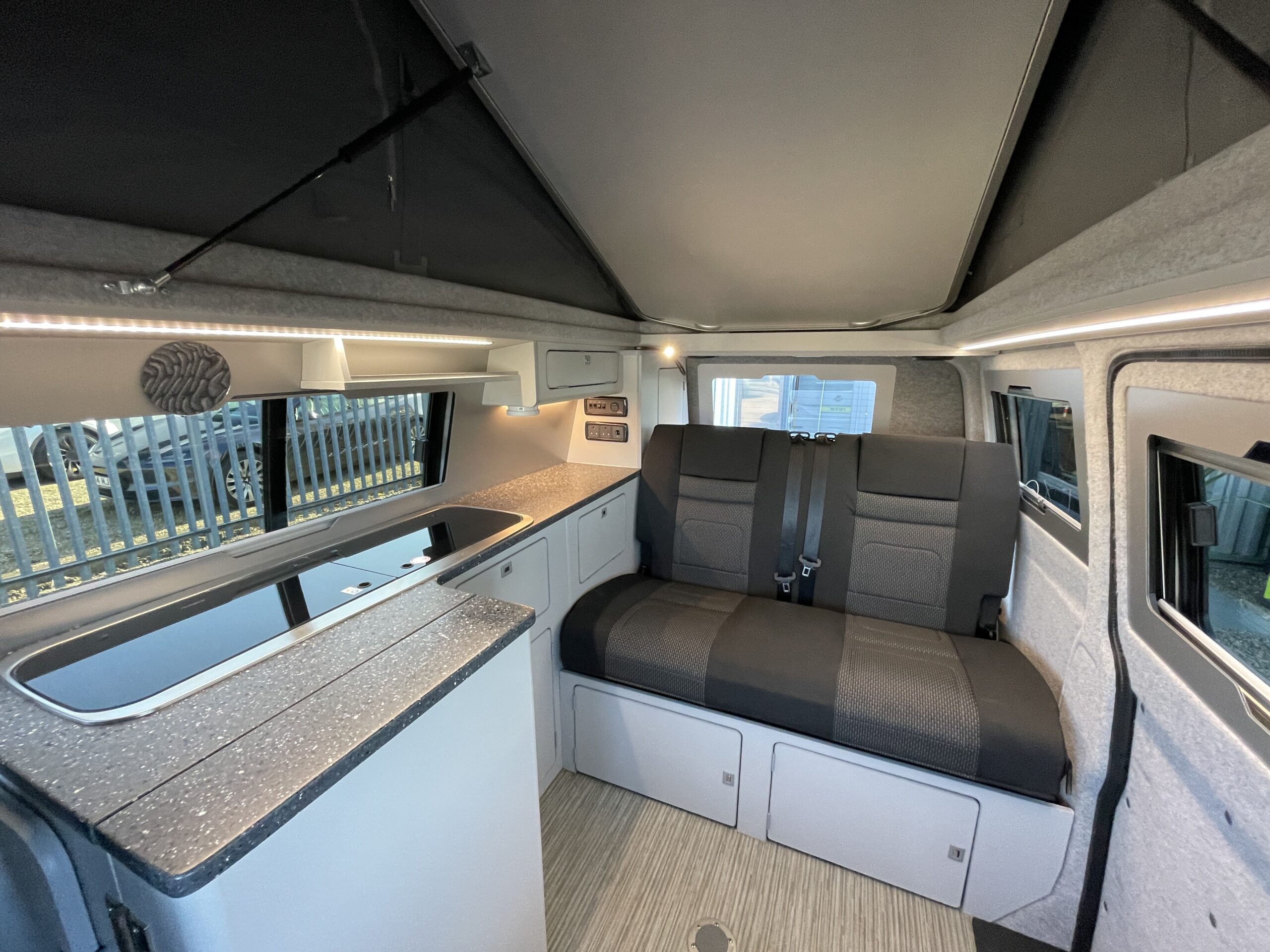 Starting at the rear of the campervan, you’ll find the versatile rear lounge and sleeping area, which forms the heart of the living space. The rear bench seat provides comfortable seating during the day and easily converts into a practical double bed at night, creating a cosy sleeping area. Large side windows help bring in plenty of natural light, while storage spaces beneath the seating provide room for luggage, bedding and travel essentials.