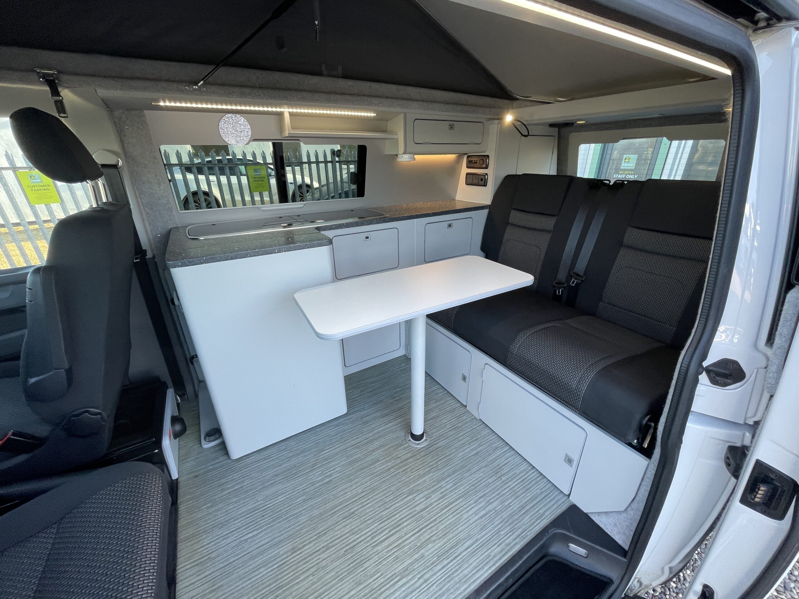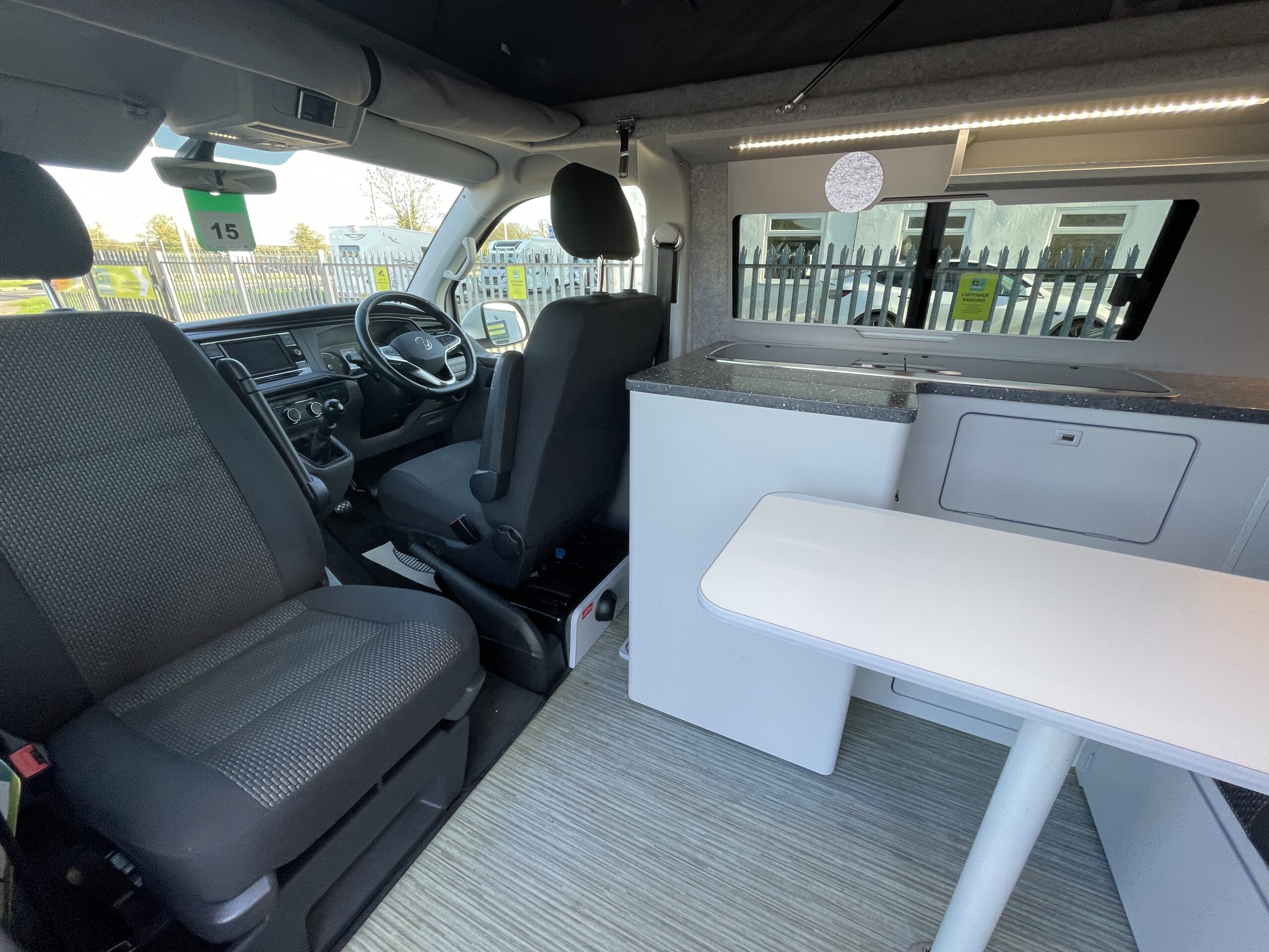 Continuing towards the front, the cab area offers the premium specification expected from the Transporter Highline trim. With comfortable seating, modern driver conveniences and Volkswagen’s well-known driving refinement, the van provides a smooth, car-like driving experience whether navigating city streets or heading out on longer journeys.