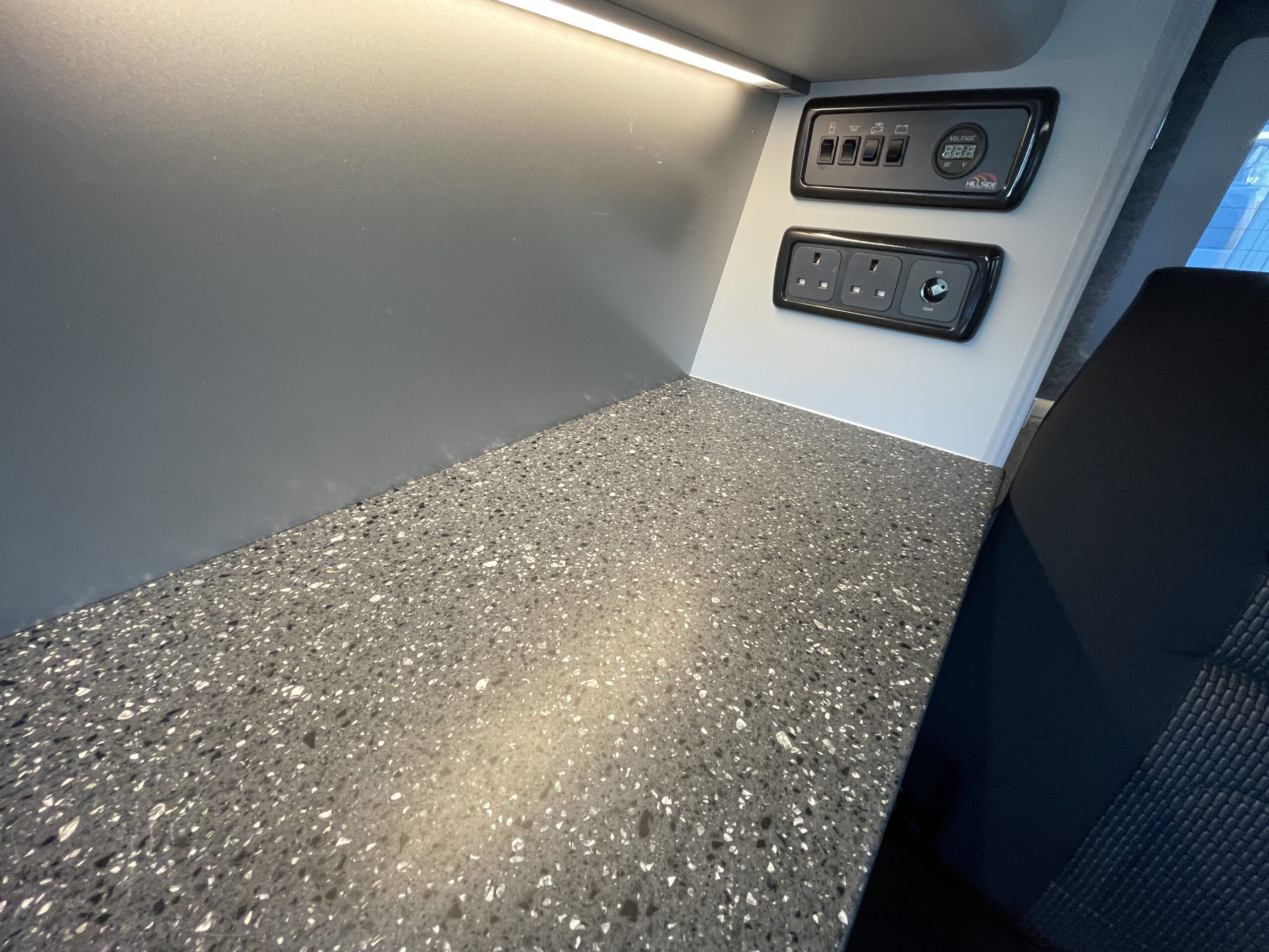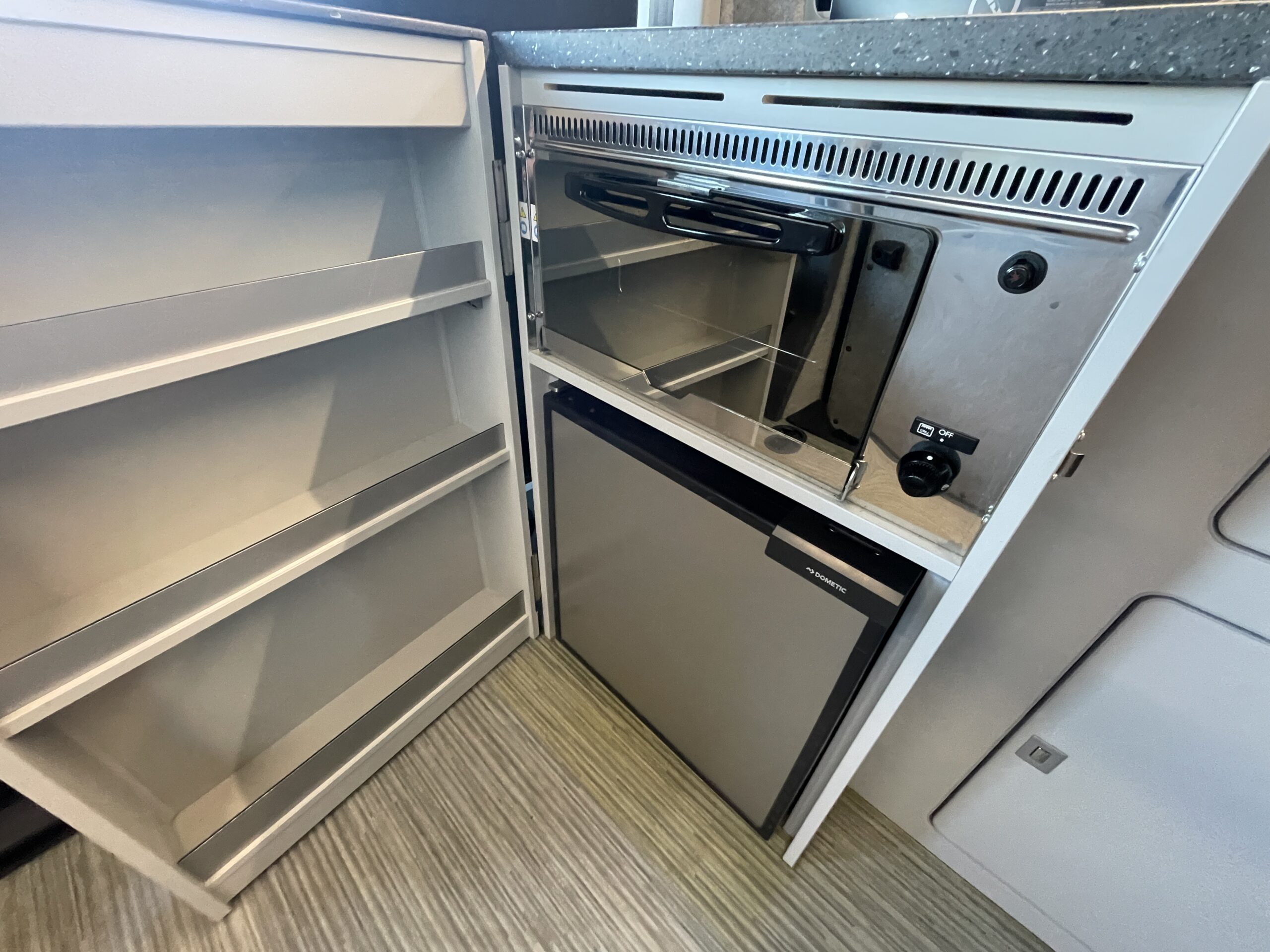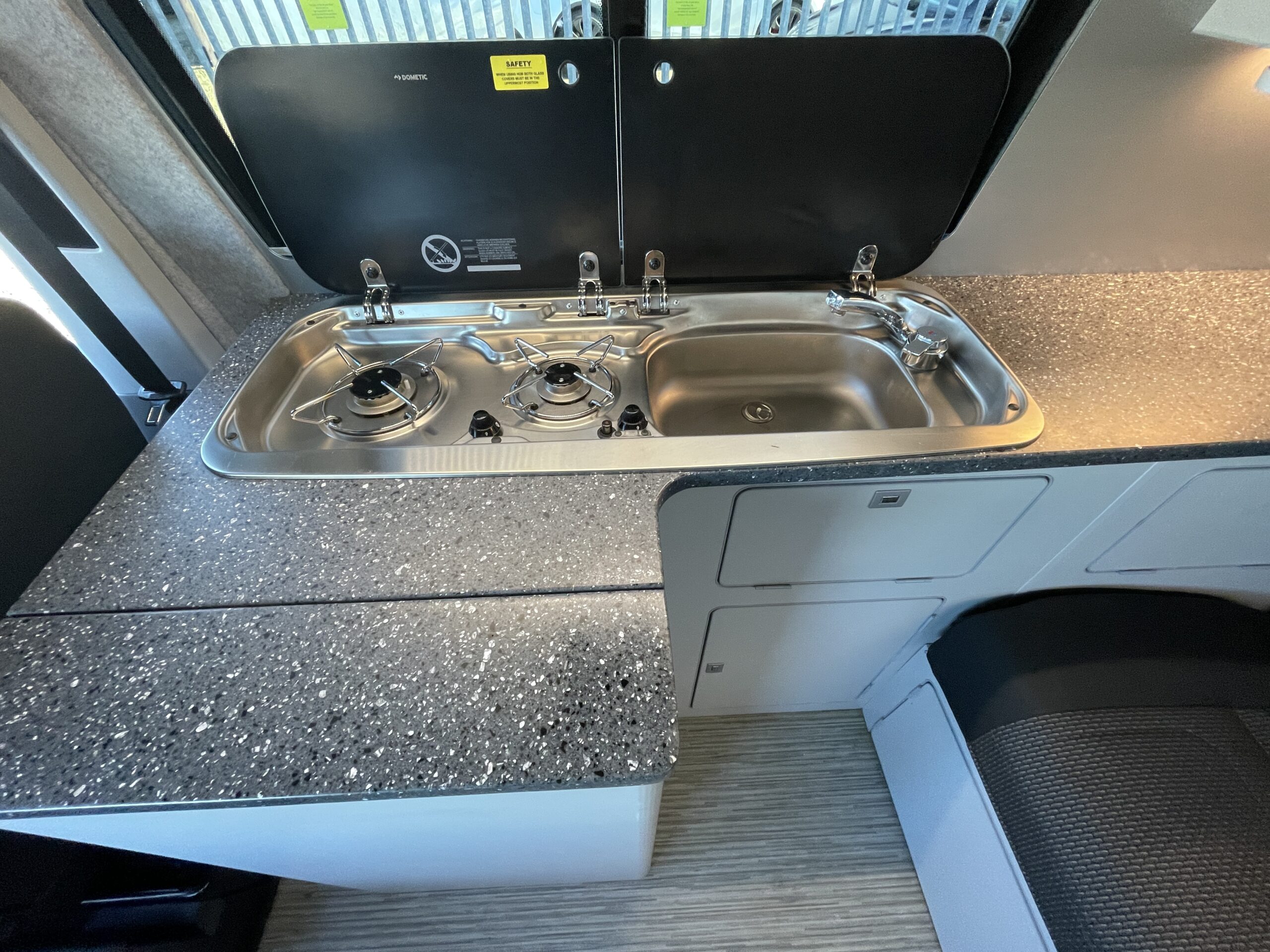 Moving forward along the side of the vehicle, the compact yet highly functional kitchen unit offers everything required for life on the road. Featuring a 2 ring gas hob, sink with hot & cold water supply, grill, fridge and practical cupboard storage, the kitchen allows you to prepare meals and drinks wherever your travels take you. The layout is thoughtfully designed to maximise usable space while maintaining a clean and modern finish.