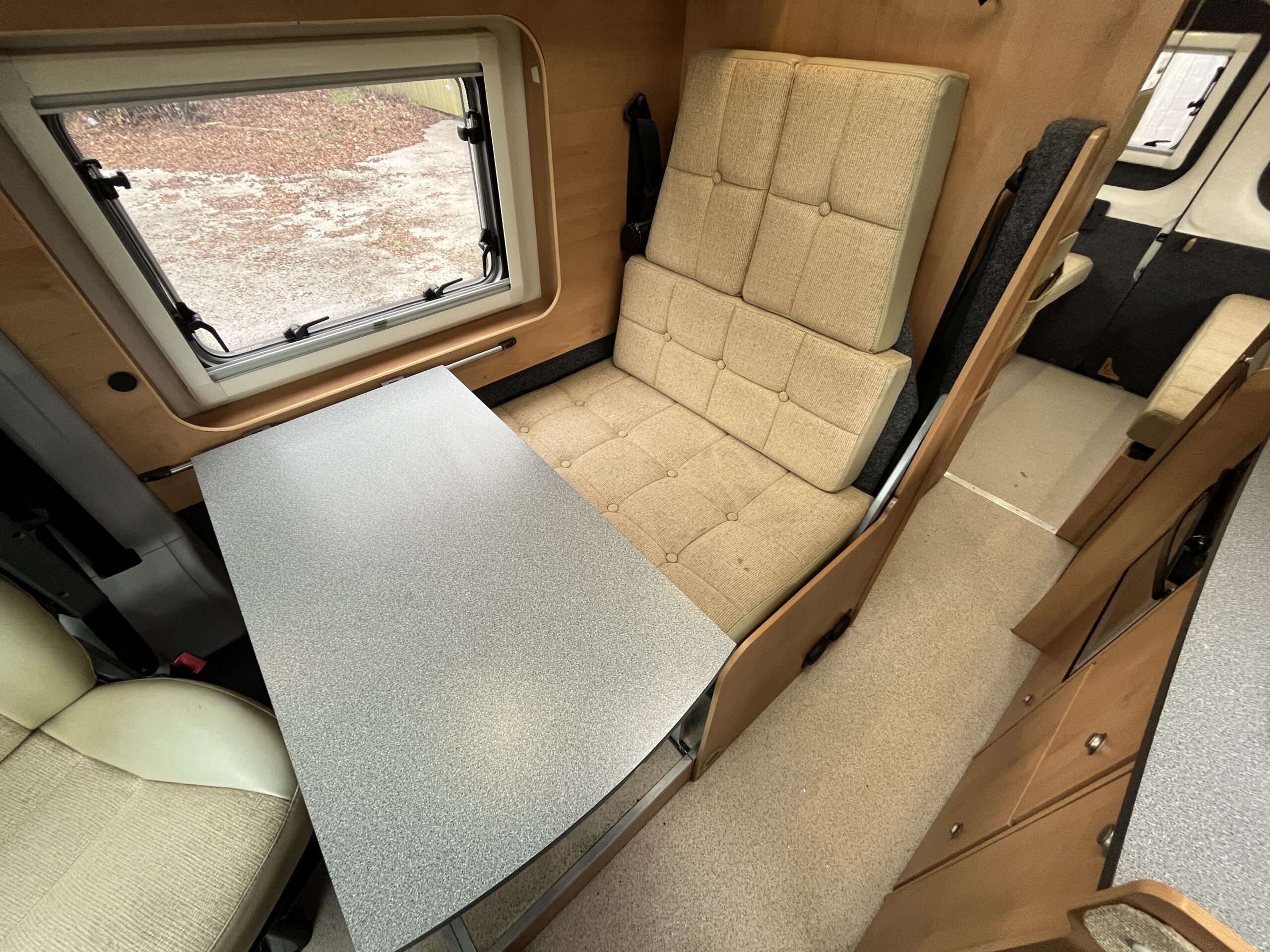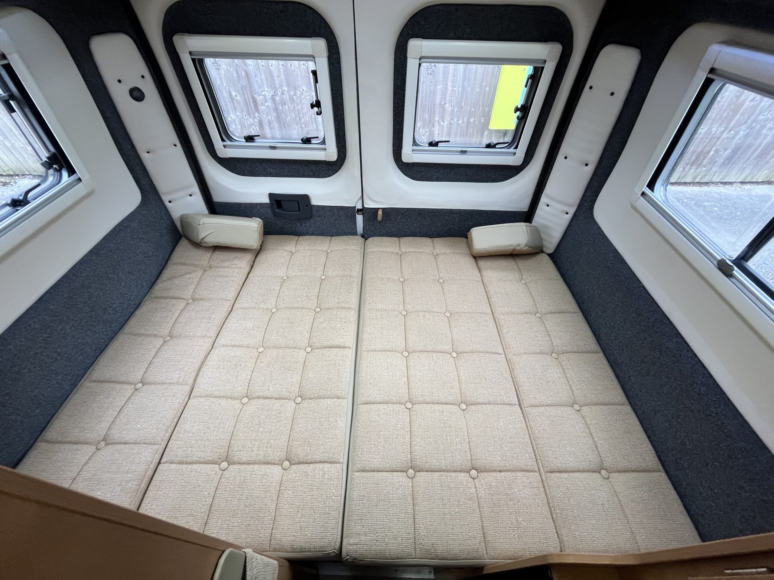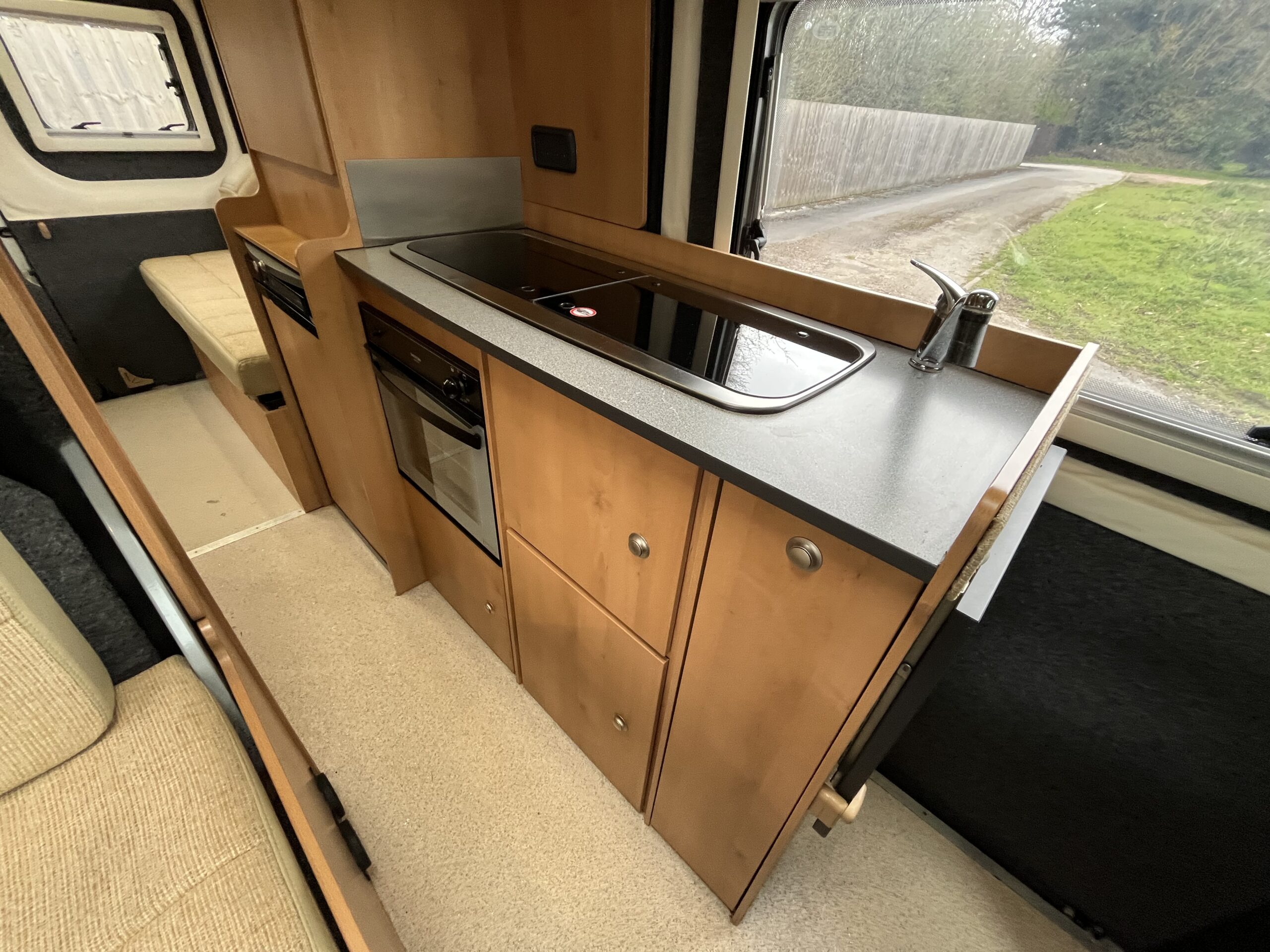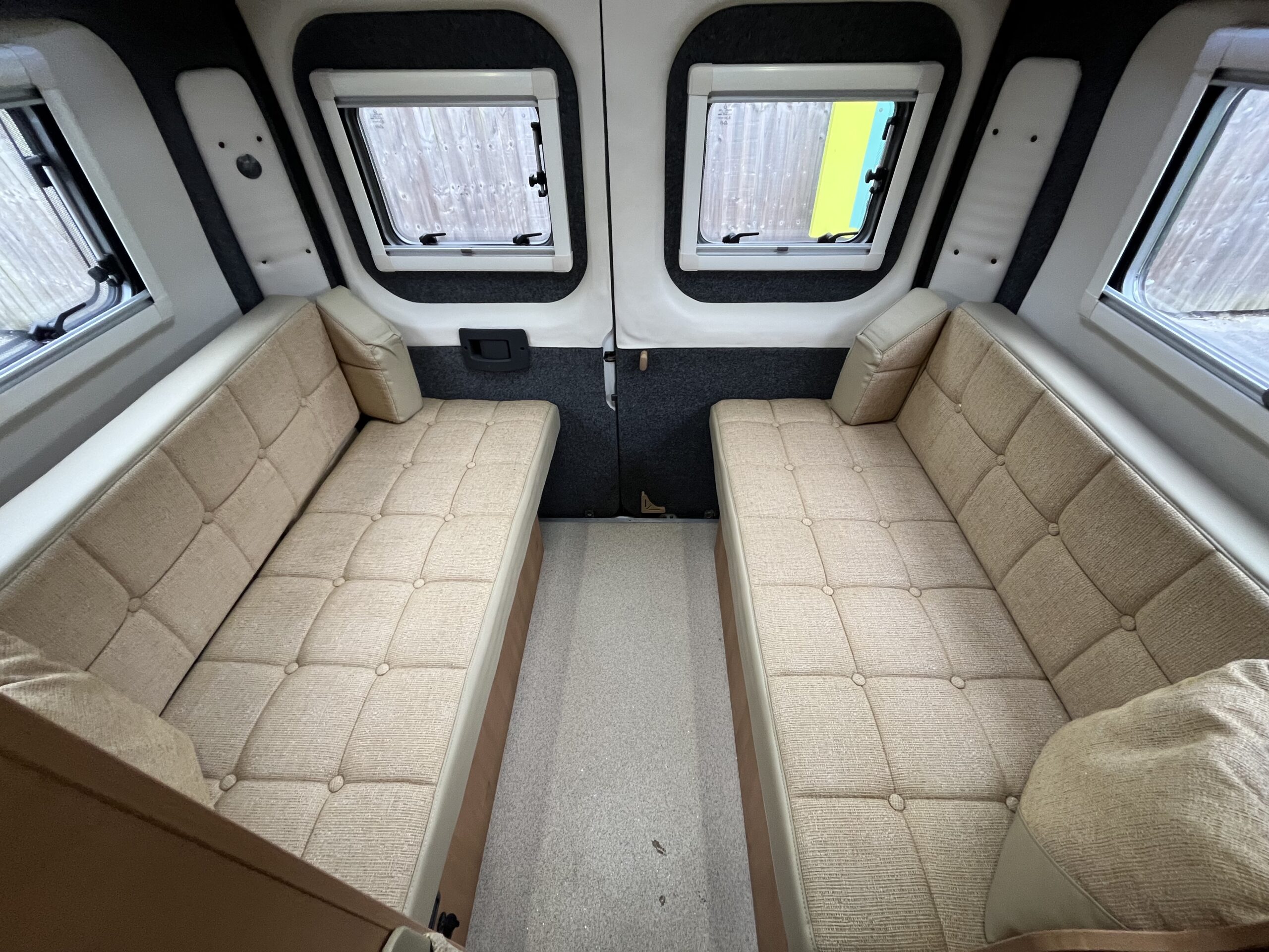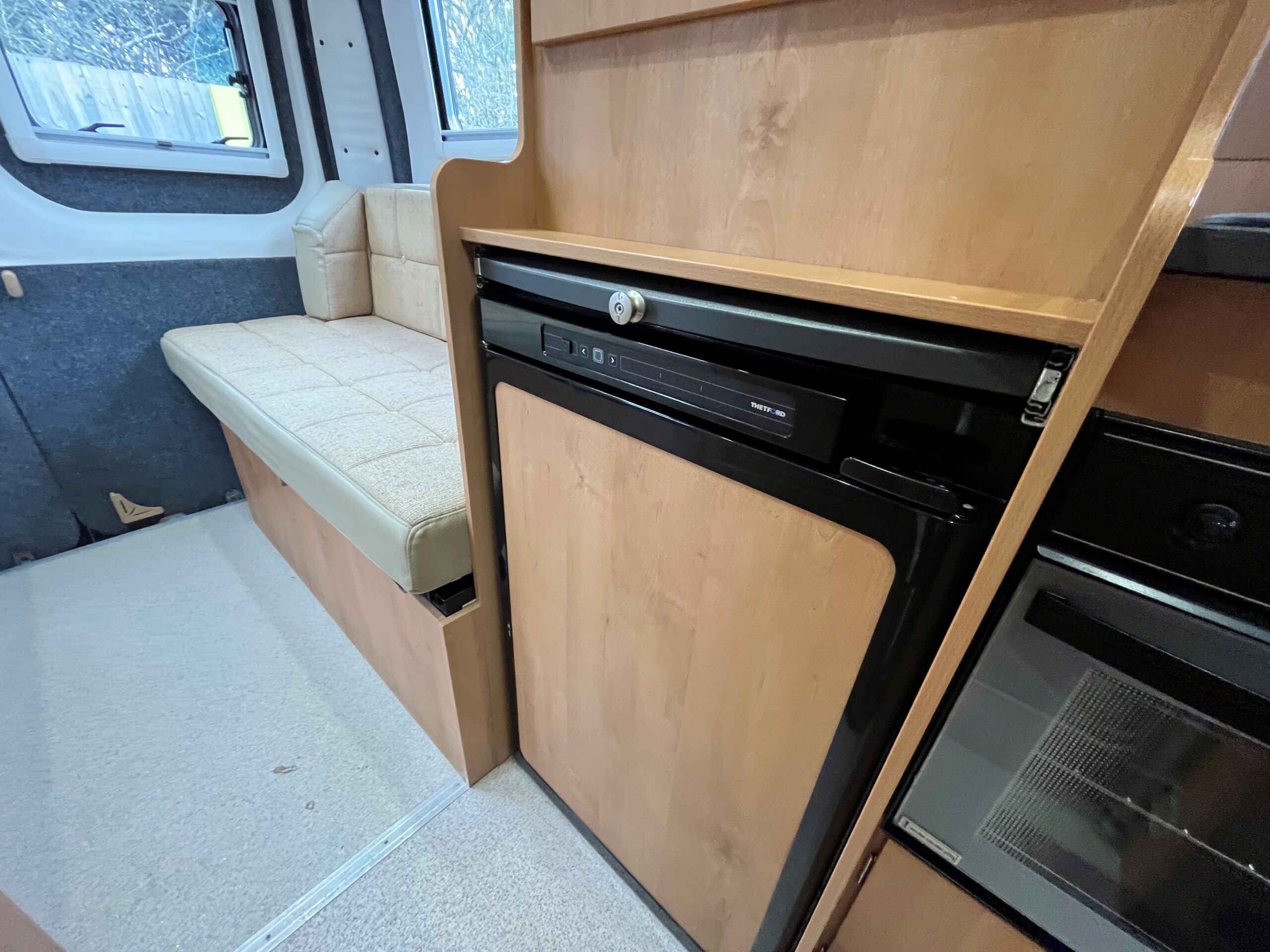 As you enter the habitation area through the sliding door immediately in front of you is the dinette area that when you use the two captains chairs makes a great space for 4 people to sit together, this is where you will find the extra 2 travel 3 point seatbelts and also makes into a single bed for sleeping. As you move through the camper you have the kitchen area which has a sink with mixer tap, 2 burner gas hob and 3 way fridge with freezer compartment. There is plenty of storage as well for everything you would need.