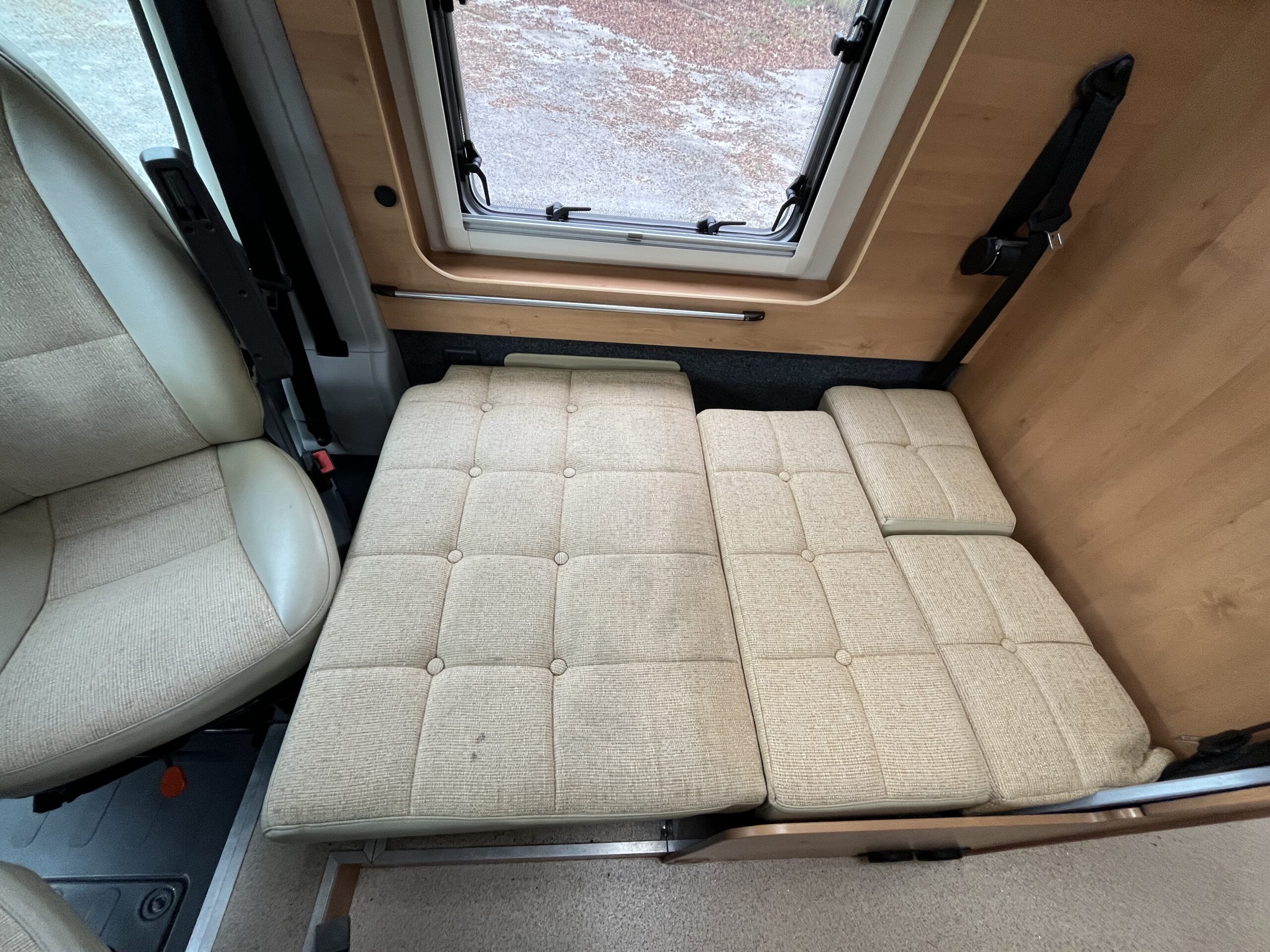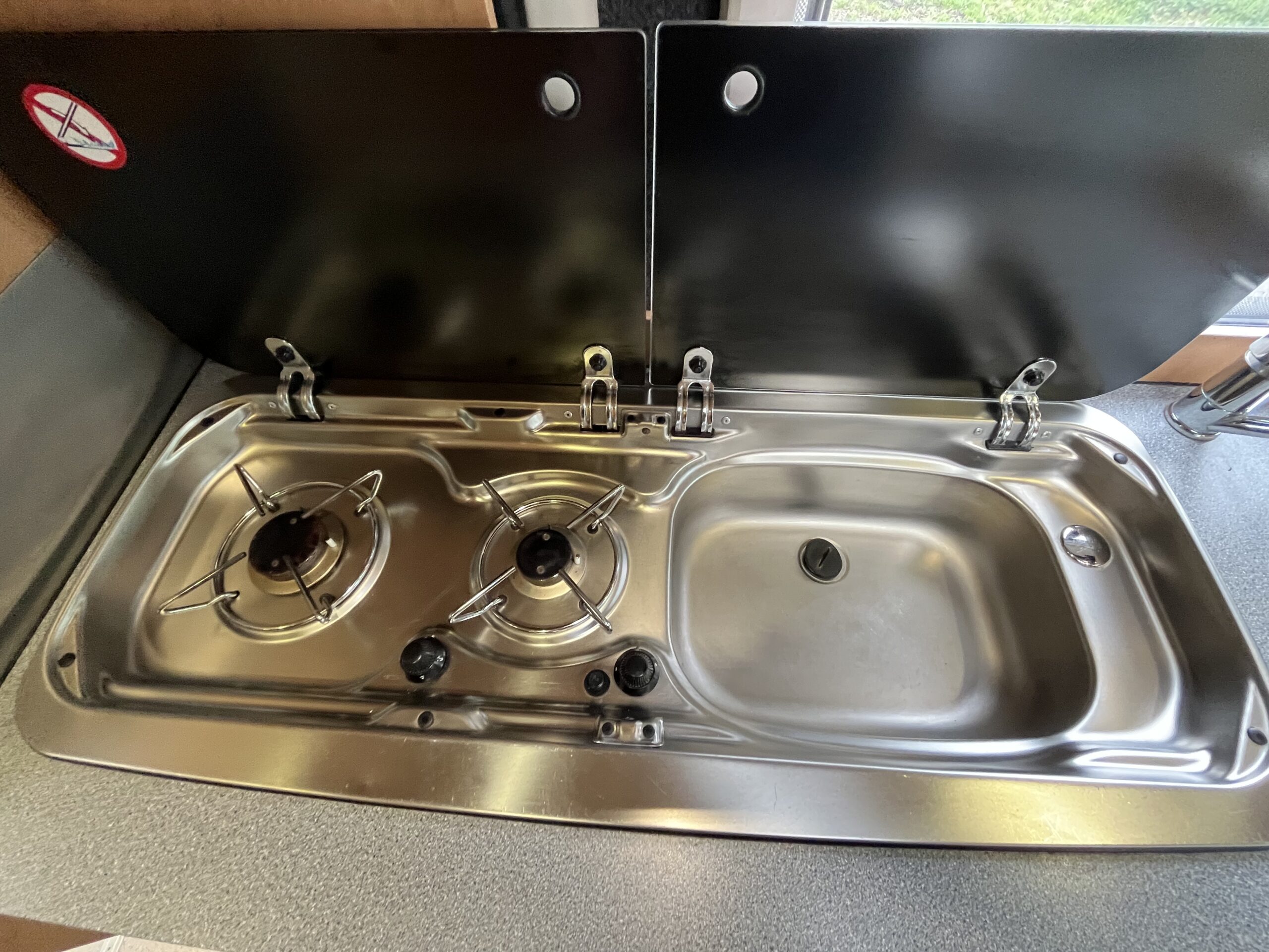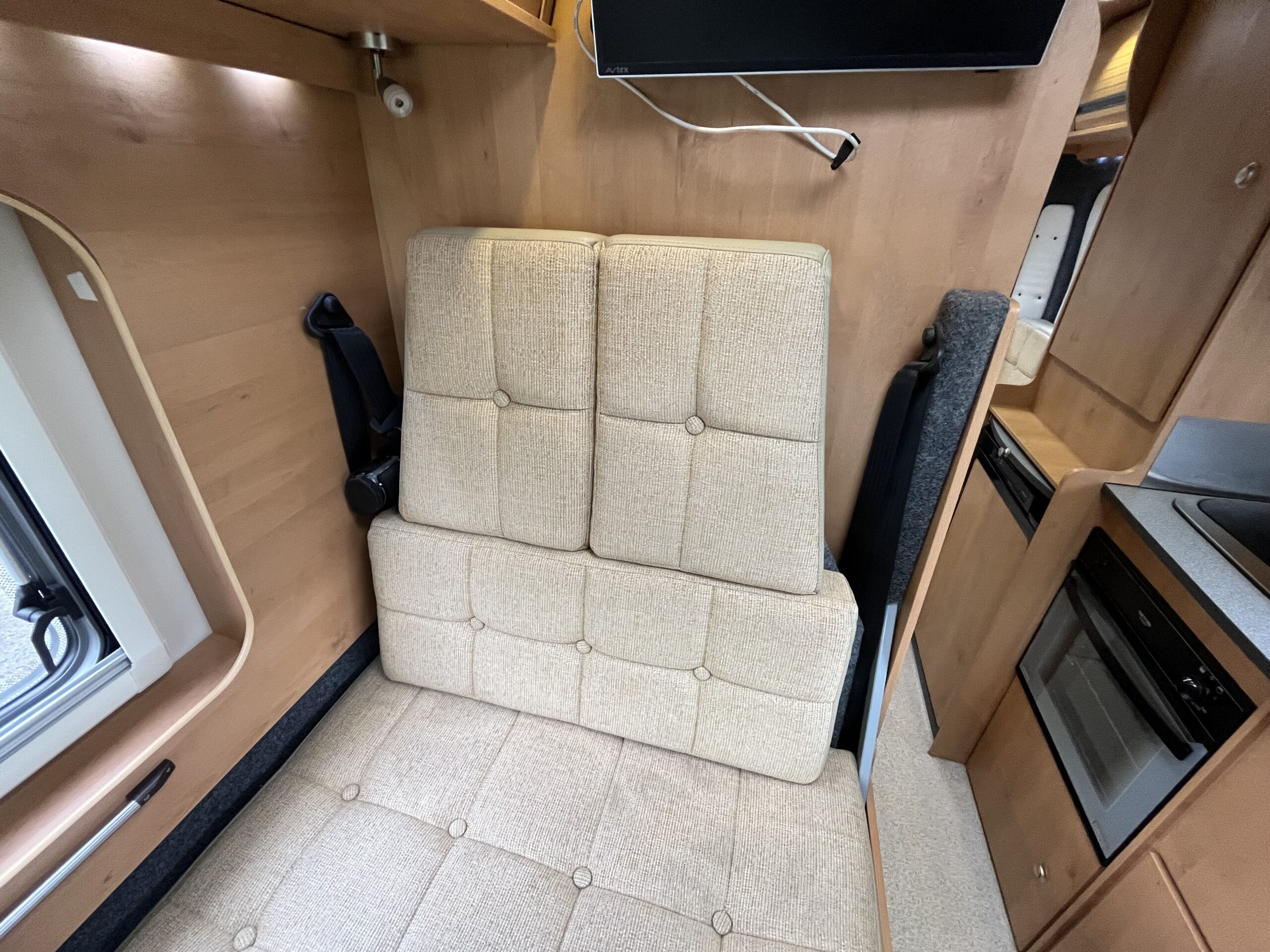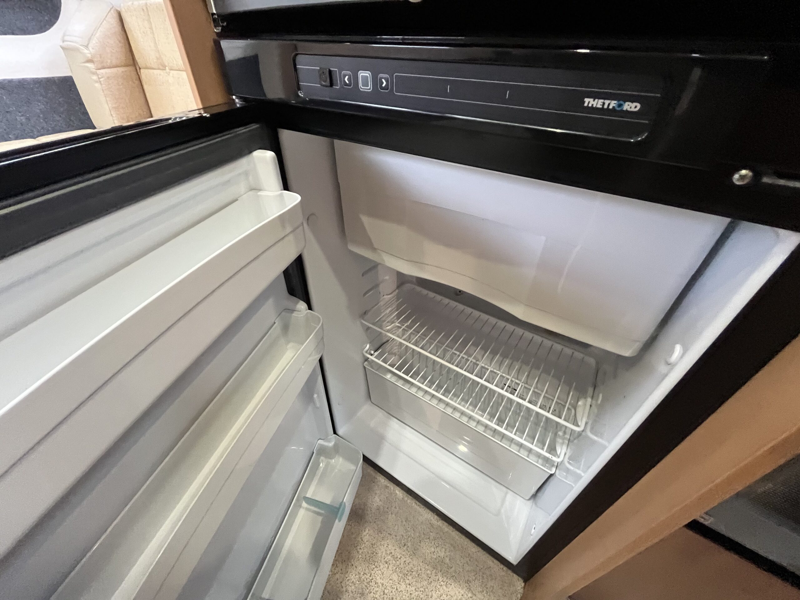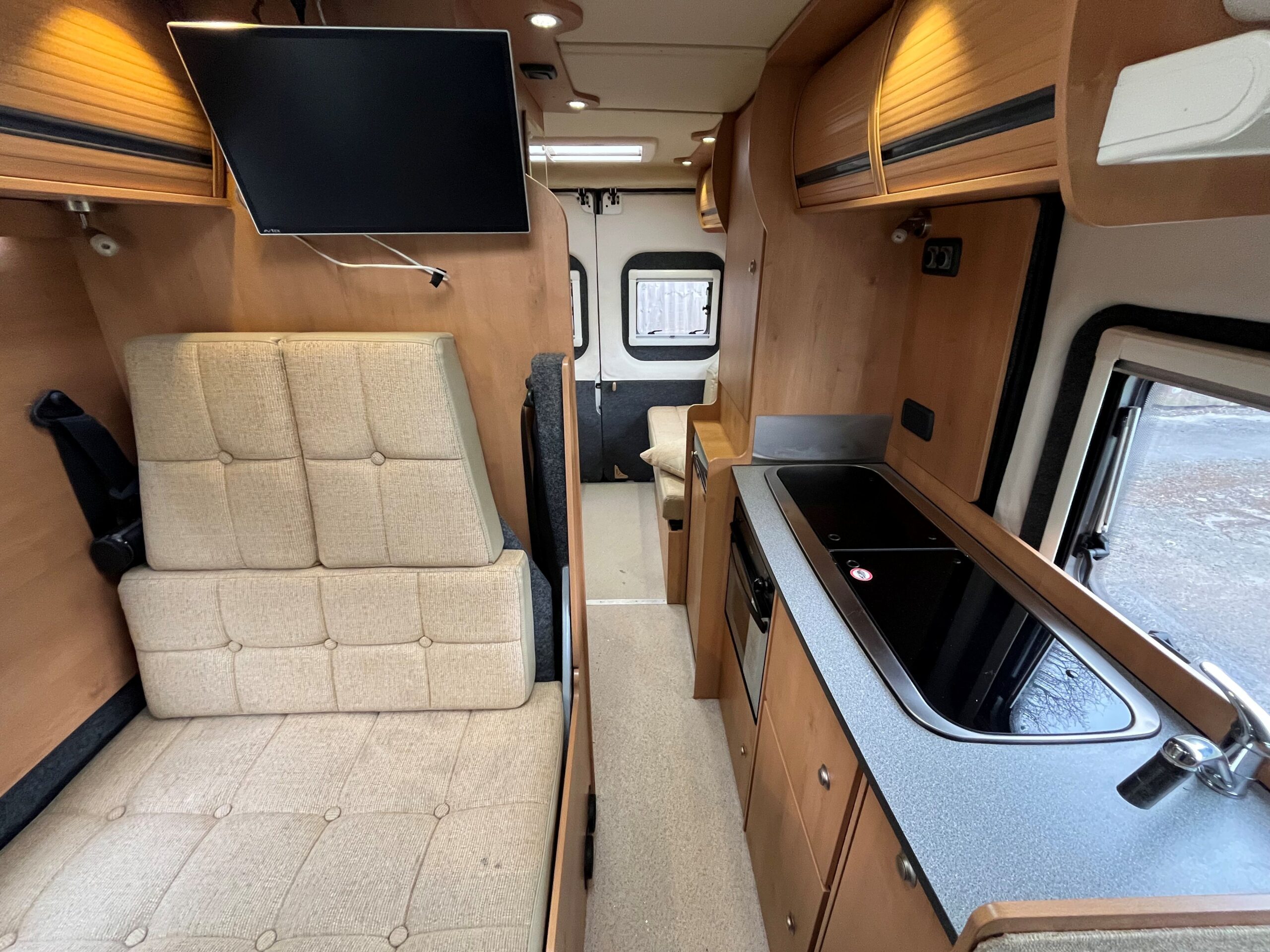 As you enter the habitation area through the sliding door immediately in front of you is the dinette area that when you use the two captains chairs makes a great space for 4 people to sit together, this is where you will find the extra 2 travel 3 point seatbelts and also makes into a single bed for sleeping. As you move through the camper you have the kitchen area which has a sink with mixer tap, 2 burner gas hob and 3 way fridge with freezer compartment. There is plenty of storage as well for everything you would need.