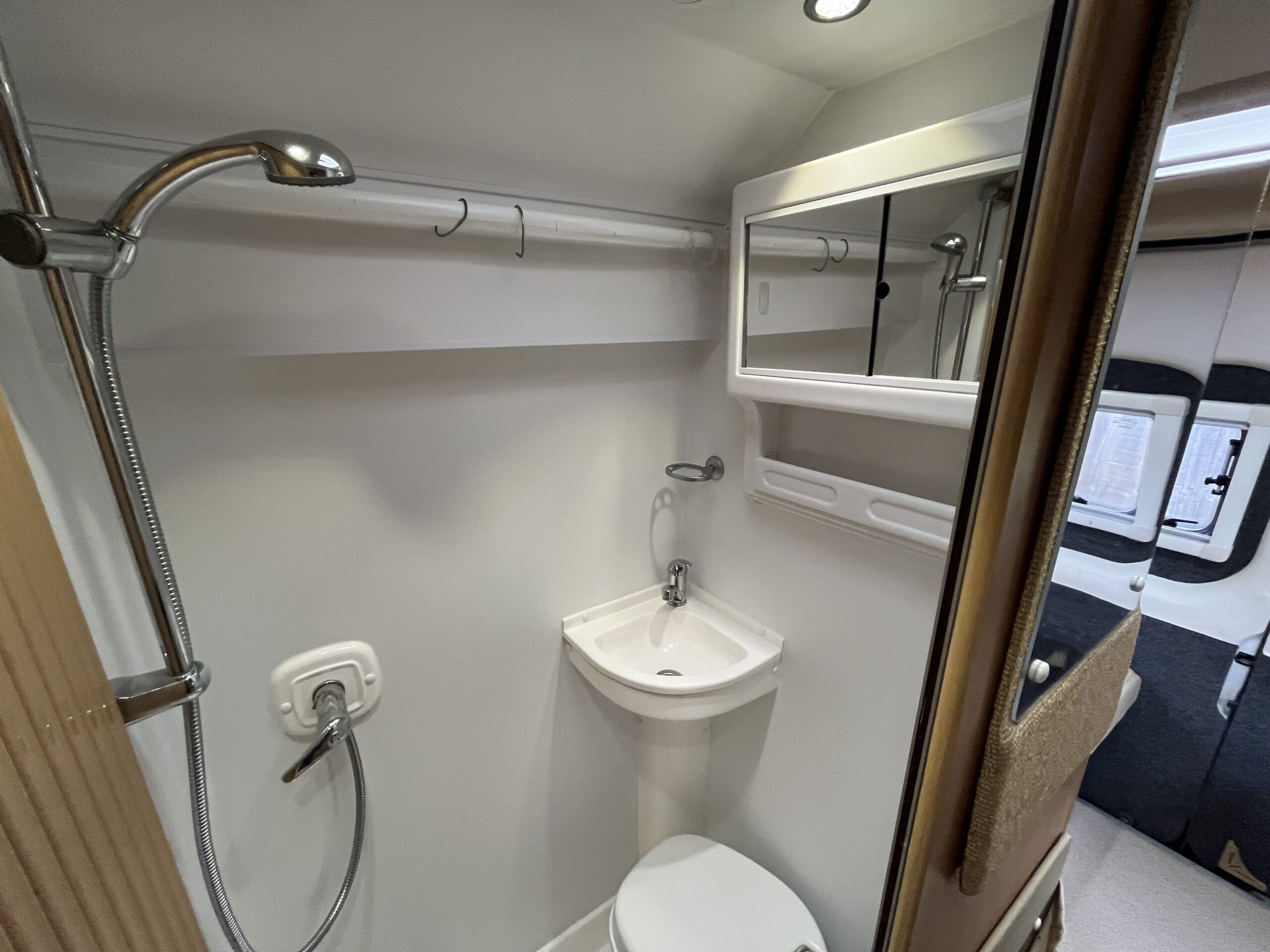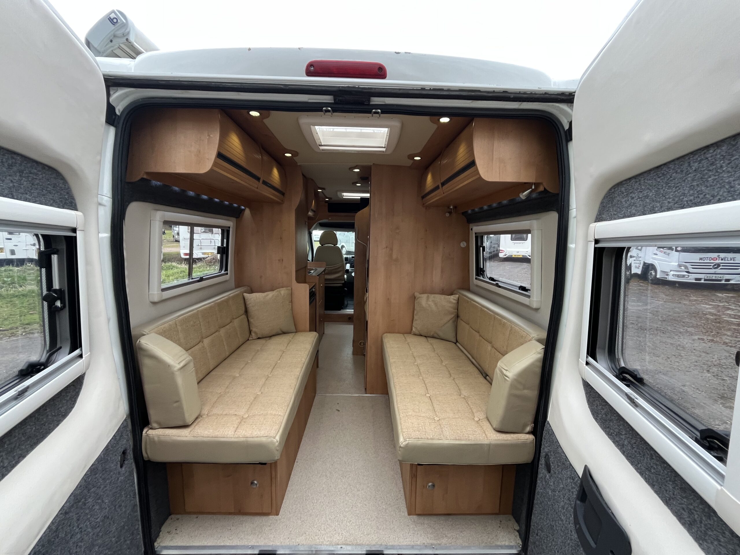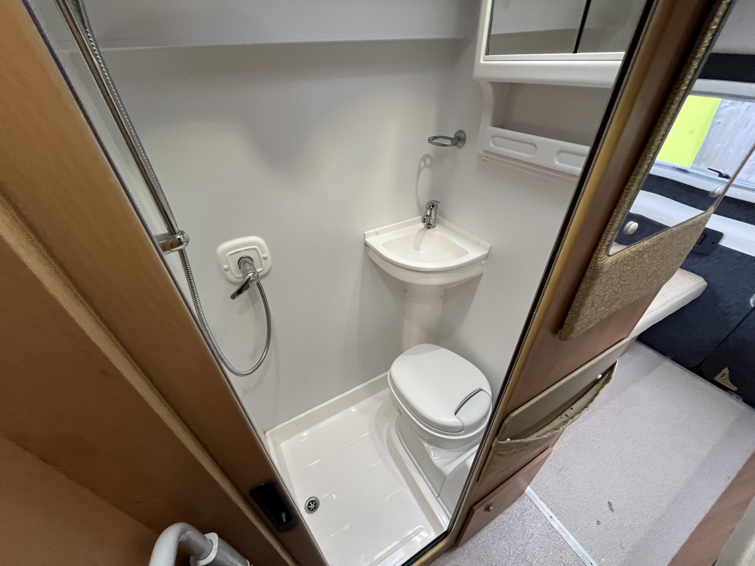 At the rear of the vehicle is the side facing sofas that is a great space to sit back and relax, this also makes into a double bed and could be left as a bed with you using the dinette area to sit. As you move down the camper you have the washroom which has a toilet cassette, vanity basin and shower.